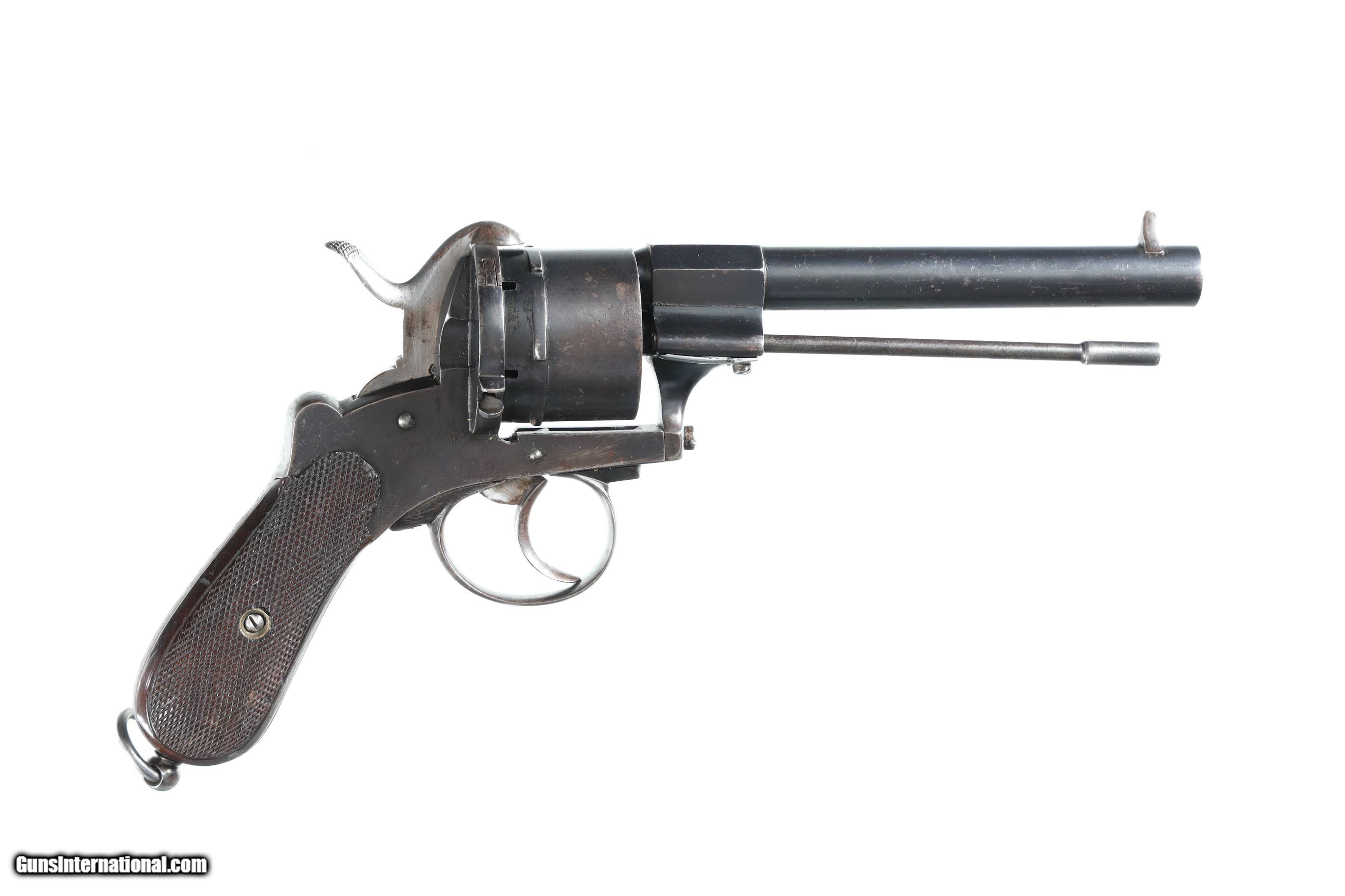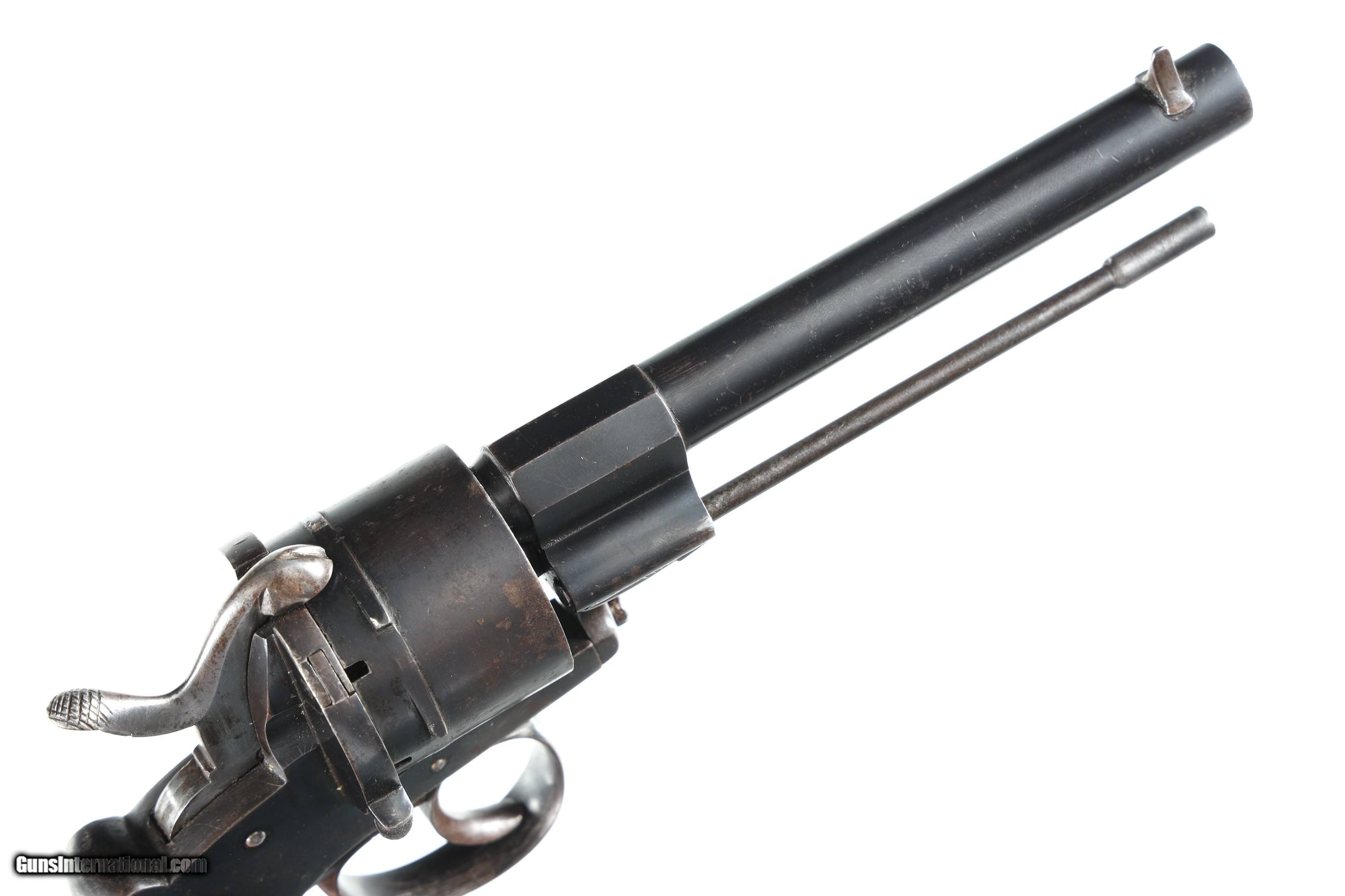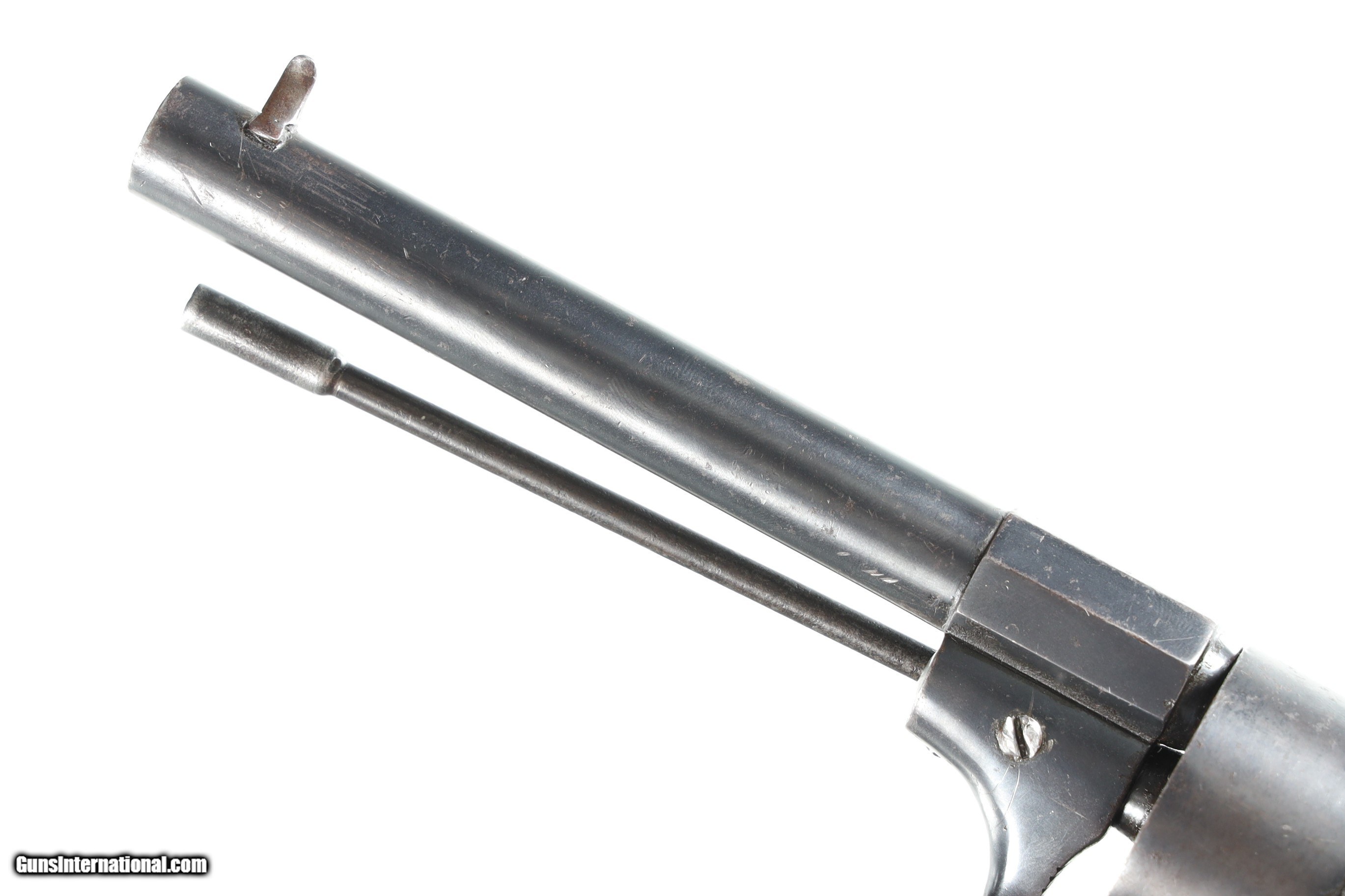 Description: Serial number 81 Bbl, 5 1/2" Cal, 11MM Pin Fire. Circa 1865. Proofed in Belgium , 6 shot double / single action Lefaucheux pattern open top revolver with external extraction rod and checkered 2 piece walnut grips on bag grip with lanyard. Non-Fluted cylinder with tilting loading gate. Serial numbered under grip and proofed on cylinder. These large frame revolvers were imported into the United States during the later period of the Civil War as well as saw extensive use in the Franco Prussian War. Condition, Very fine with most all finish remaining. Bore and chambers are very fine. Action operates properly. Grips are excellent. ANTIQUE • Free Shipping, No Credit Card Fees. • Lay-a-way available for this firearm. • 1/3 Down, a 1/3 in 30 Days 1/3 in 60 Days. SOLD Antique: Yes Manufacturer: Lefaucheux Model: Pinfire Serial Number: 81 Barrel Length: 5-1/2 |