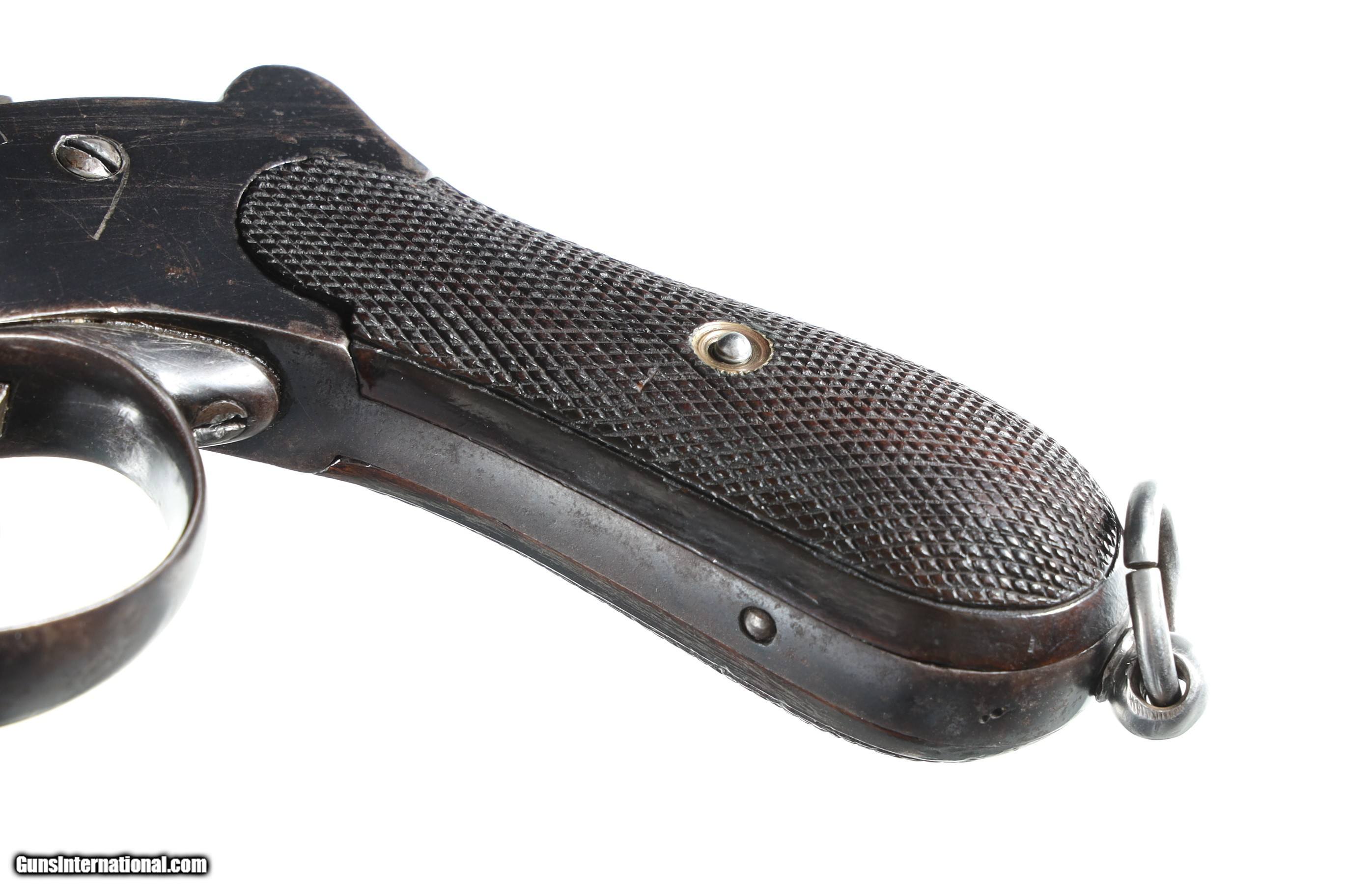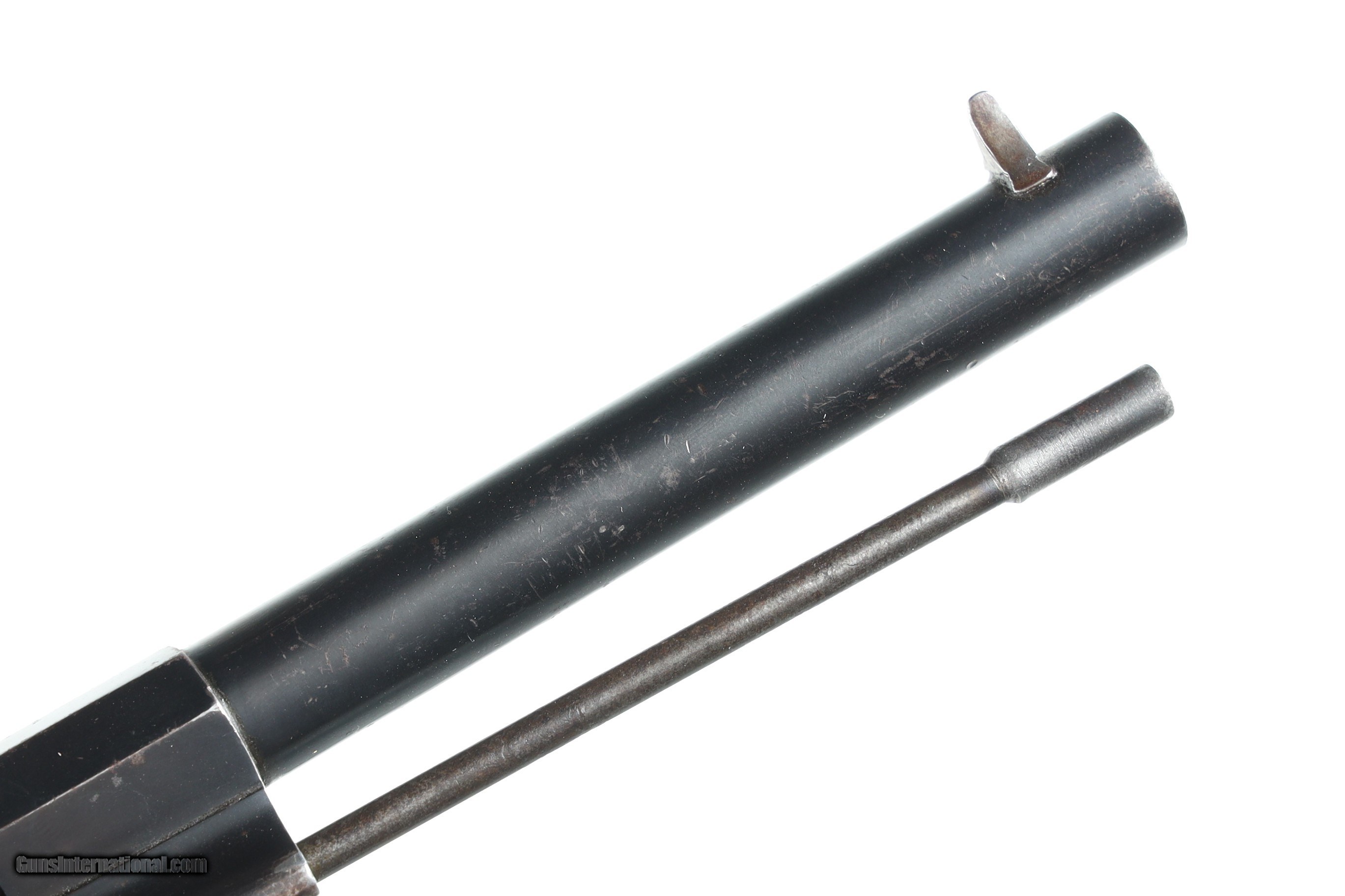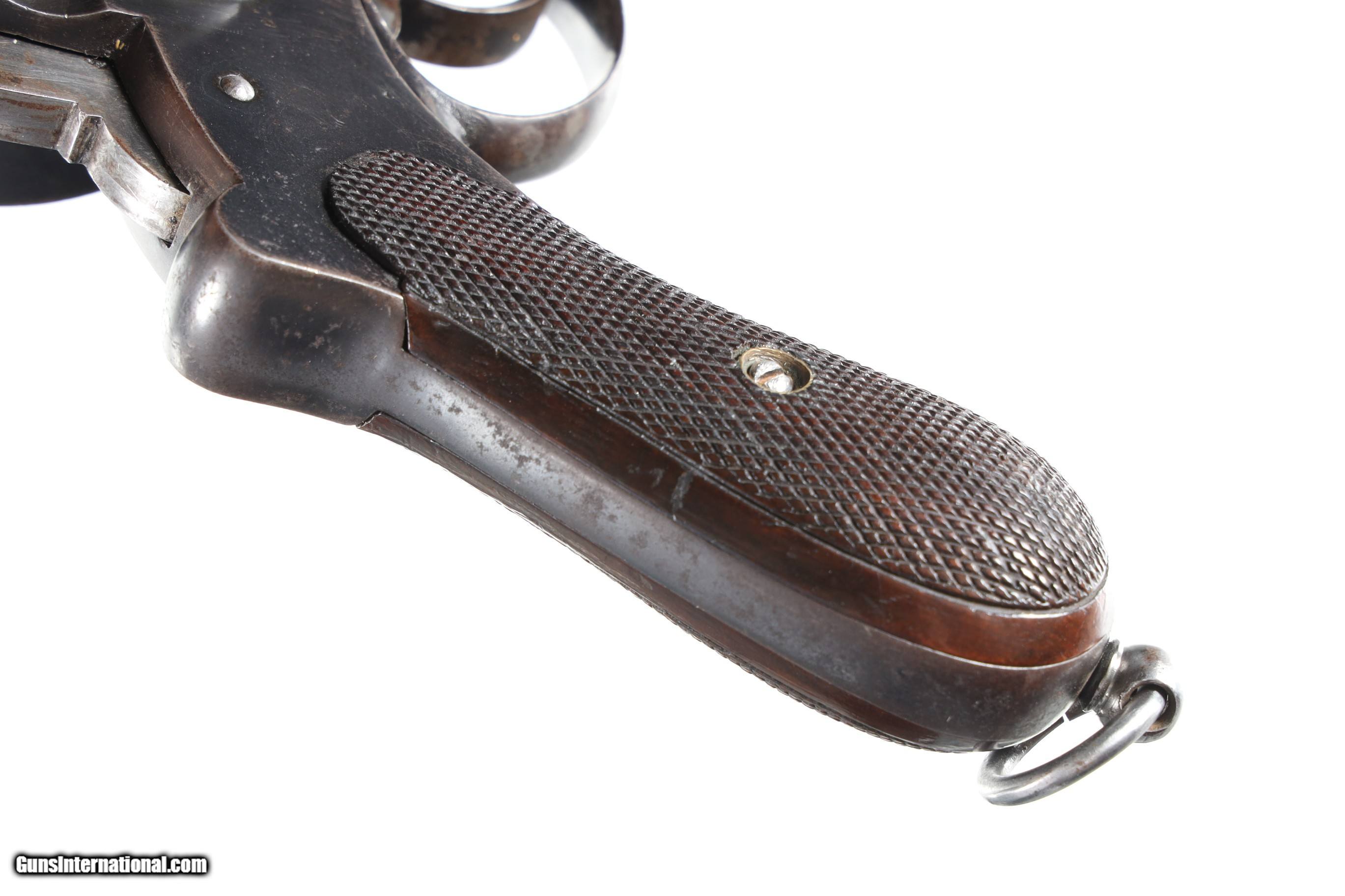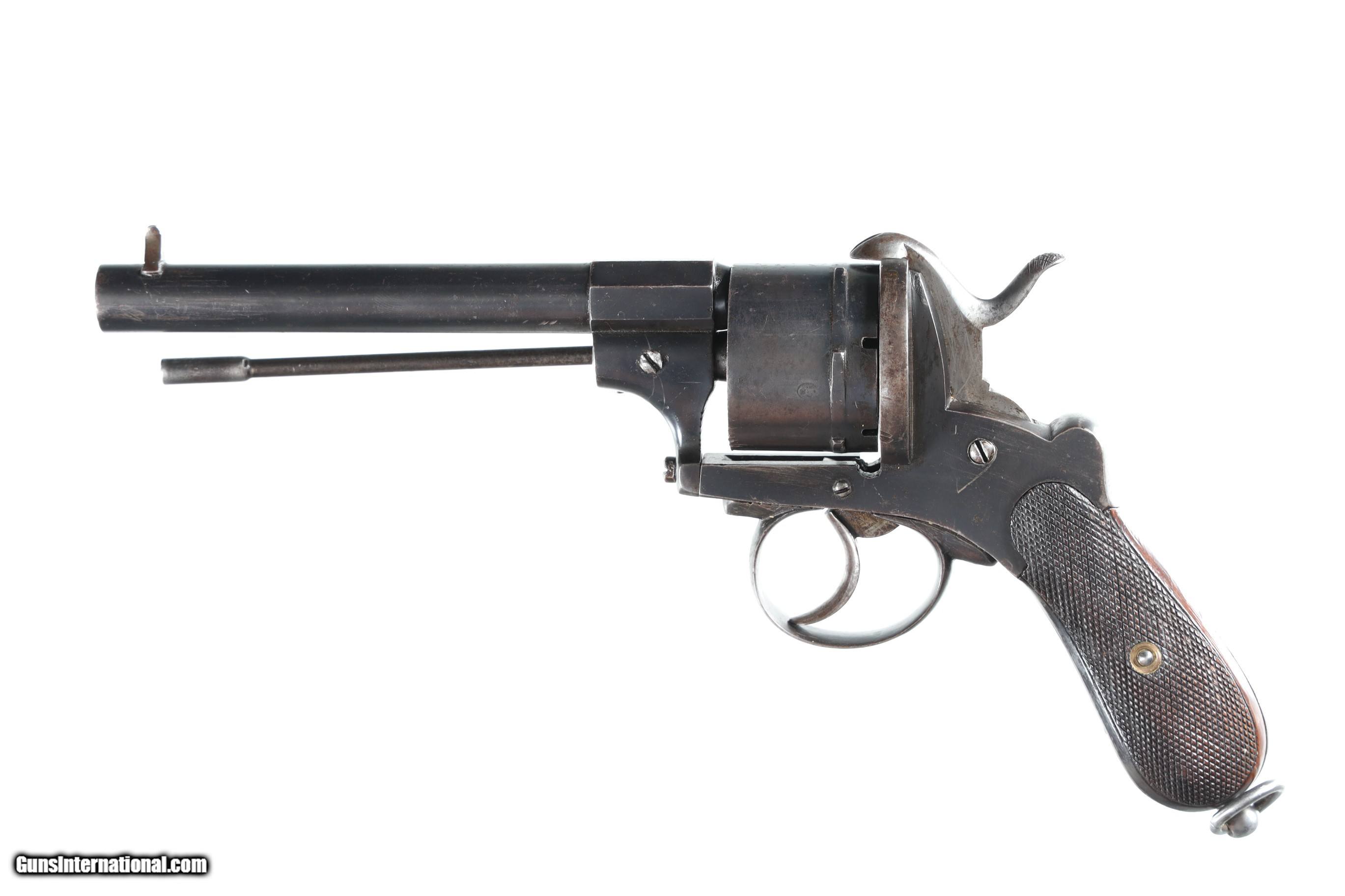 Description: Serial number 81 Bbl, 5 1/2" Cal, 11MM Pin Fire. Circa 1865. Proofed in Belgium , 6 shot double / single action Lefaucheux pattern open top revolver with external extraction rod and checkered 2 piece walnut grips on bag grip with lanyard. Non-Fluted cylinder with tilting loading gate. Serial numbered under grip and proofed on cylinder. These large frame revolvers were imported into the United States during the later period of the Civil War as well as saw extensive use in the Franco Prussian War. Condition, Very fine with most all finish remaining. Bore and chambers are very fine. Action operates properly. Grips are excellent. ANTIQUE • Free Shipping, No Credit Card Fees. • Lay-a-way available for this firearm. • 1/3 Down, a 1/3 in 30 Days 1/3 in 60 Days. SOLD Antique: Yes Manufacturer: Lefaucheux Model: Pinfire Serial Number: 81 Barrel Length: 5-1/2 |