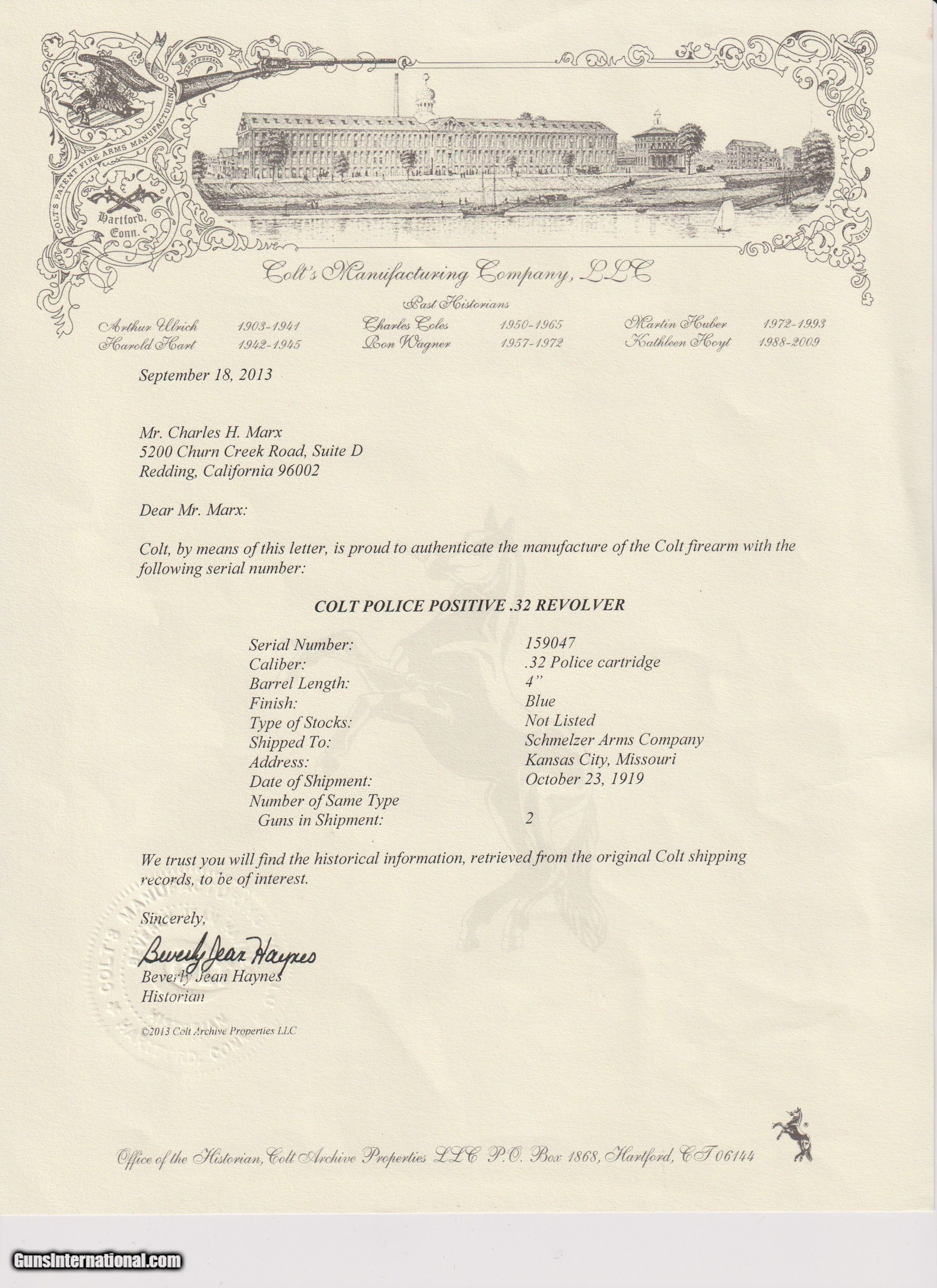 Description: LETTERED Double Action COLT POLICE POSITIVE .32 Revolver C&R w/IVORY GRIPS Colt’s Widely Produced Police Revolver Design Here Ancestry Guns presents a C&R Colt Police Positive, made in 1919 by the Colt Manufacturing Company in Hartford, Connecticut, with a production run from 1907 through 1947. The Colt Police Positive is a small-frame, double-action revolver featuring a six-round cylinder, chambered for either .32 or .38 caliber. It was also later offered in .22 caliber cartridges. Designed primarily for sale to federal, state, or local law enforcement agencies, the Police Positive was introduced into the overall firearms market by Colt's Manufacturing Company in 1905. The Colt Police Positive was an improvement of Colt's earlier “New Police” revolver, upgraded with an internal hammer block safety. The Police Positive was very successful venture for Colt. Along with the Colt Official Police, it dominated the law enforcement firearms market in the early 1900s. The Police Positive was itself incrementally modified in 1908, forming the basis for Colt's Police Positive Special model. The Colt Police Positive Special was a slight improvement of Colt's earlier Police Positive model with the only differences being a slightly lengthened cylinder and elongated and strengthened frame to allow the chambering of the longer, more powerful .32-20 Winchester Center Fire and .38 Special cartridges. The included factory letter lists this revolver as chambered in .32 Police with a 4-inch barrel, blue finish, and grips not listed when shipped to Scmelzer Arms Company in Kansas City, Missouri on October 23, 1919. The overall condition is very fine. Original finish. Excellent action. Shiny bright bore, maintains sharp rifling. Fine antique ivory grips. Markings are sharp. Visible numbers match. Own the original! This firearm is classified as a Curio & Relic. Barrel is 4 inches. Caliber: .32 Police Overall condition as seen in photos. Very Fast. Very Safe. FREE SHIPPING. Will need to be sent to your local FFL or C&R licensee. This firearm is classified as a Curio & Relic. Guaranteed AUTHENTIC & Includes CERTIFICATE OF AUTHENTICITY. $1650 #259103 Curio/Relic: Yes Price: $1,650.00 Buy Now Pay with