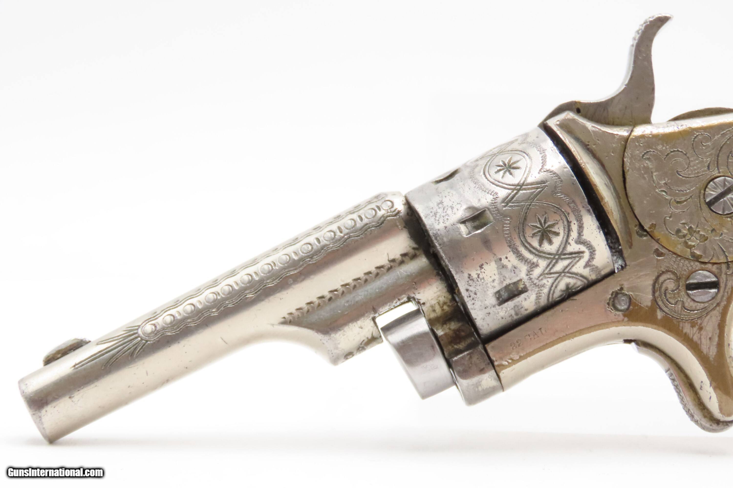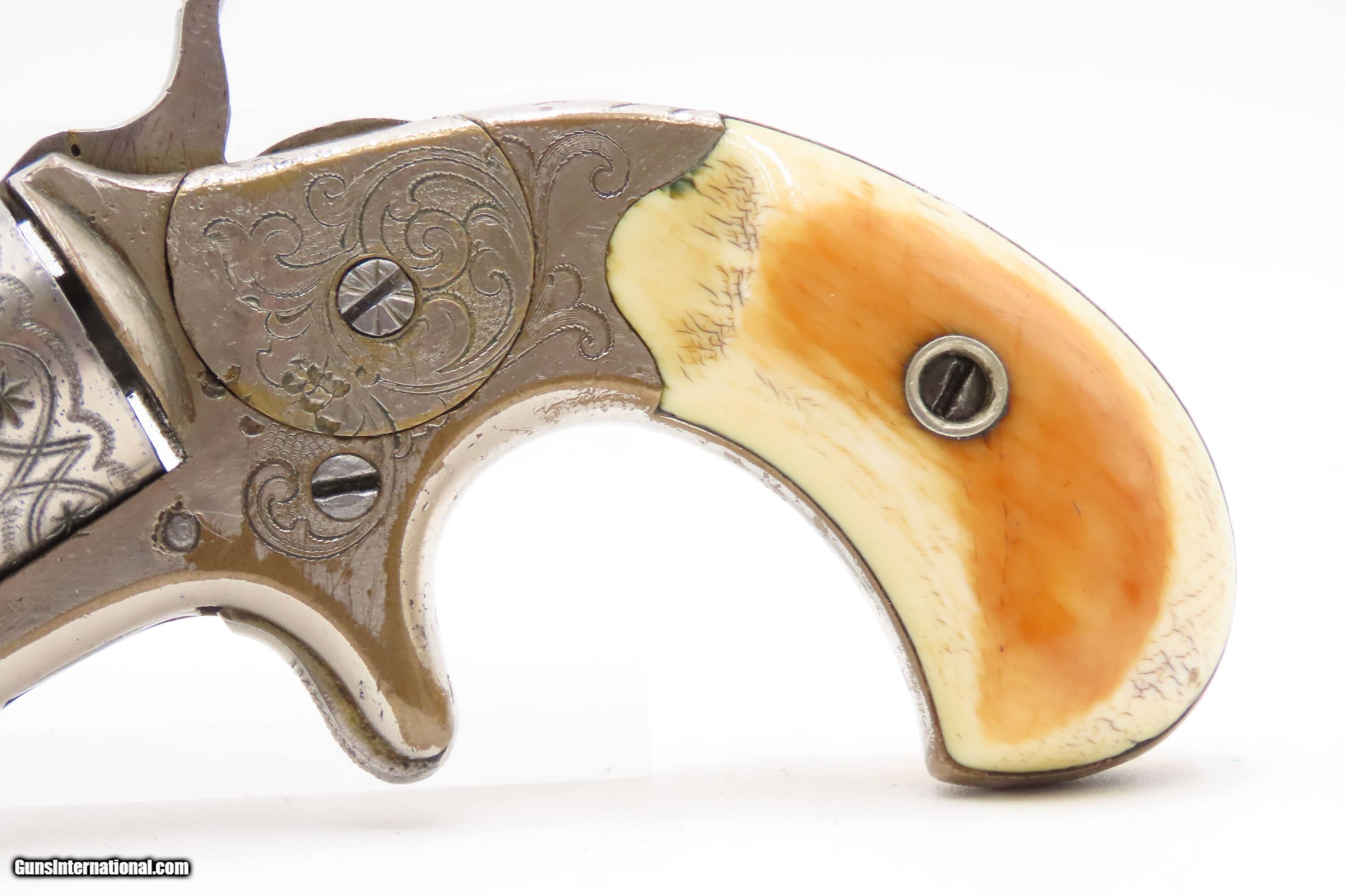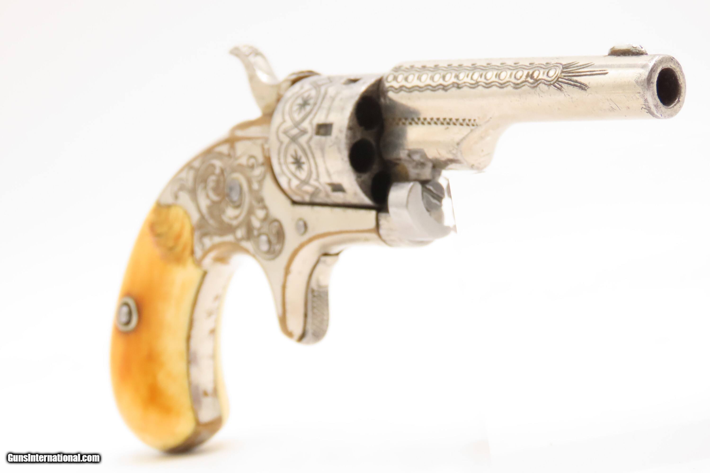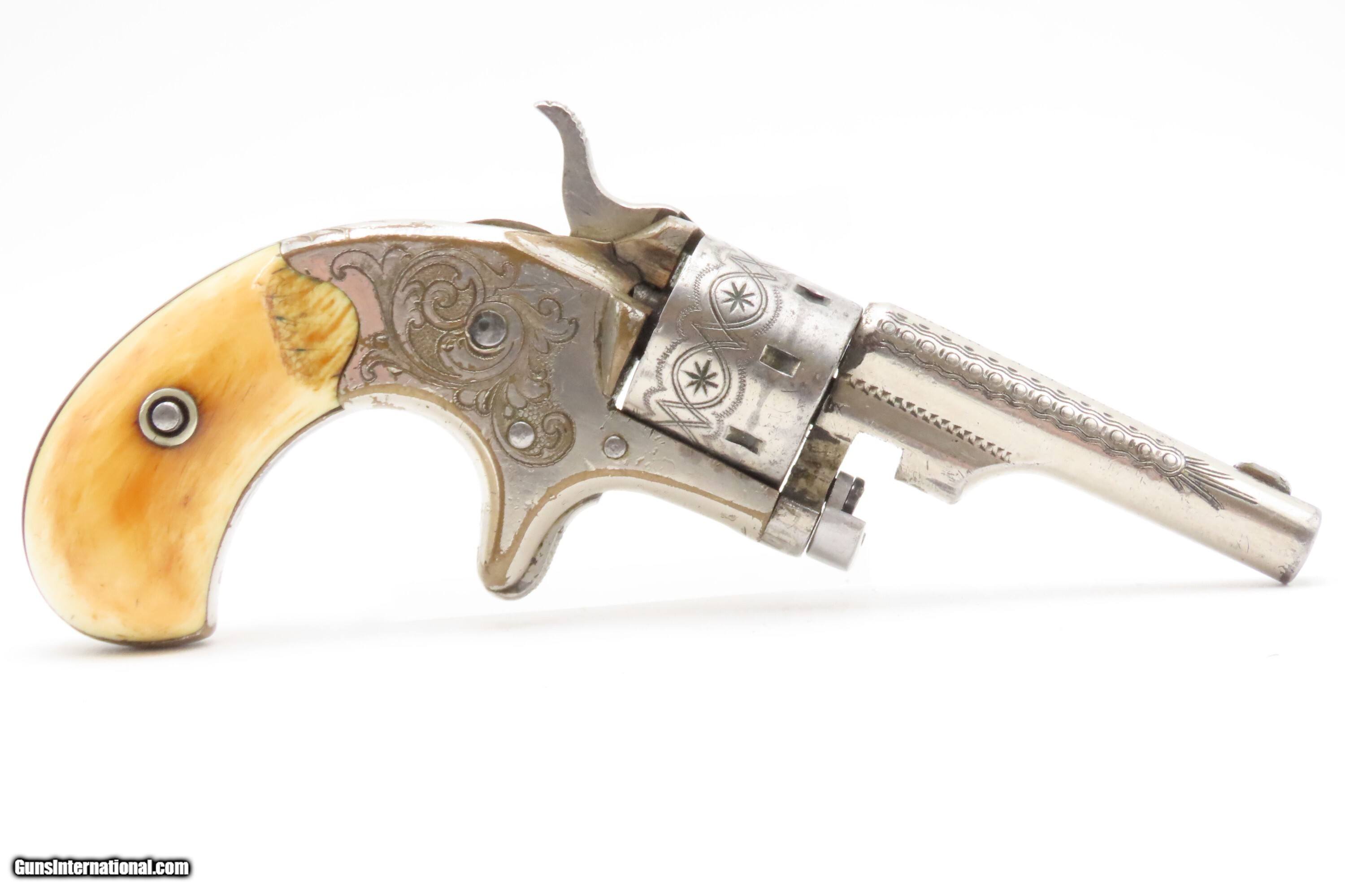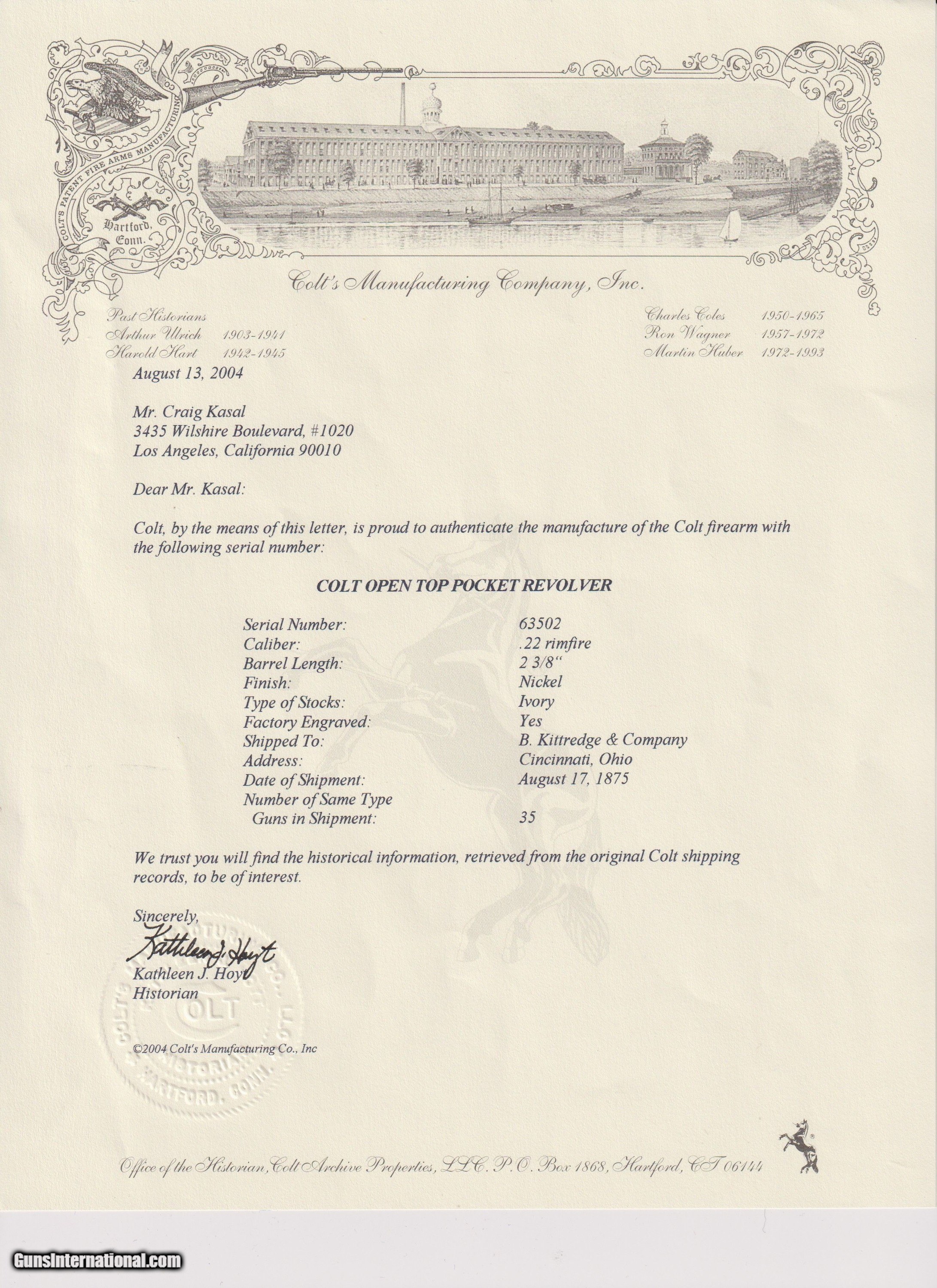 Description: LETTERED & ENGRAVED Antique COLT “OPEN TOP” .22 RF SA POCKET Revolver Cincinnati, Ohio KITTREDGE & CO. SHIPPED Revolver Here Ancestry Guns presents an antique Lettered and Factory Engraved Kittredge Shipped Colt Open Top .22 Rimfire Single Action Spur Trigger Pocket Revolver, made in 1876 in Hartford, Connecticut, with a production run from 1871 through 1877. The Kittredge Company was a large firearms dealer based in Cincinnati, Ohio, through which during the Civil War, many state militias acquired firearms for their men. These revolvers were made for self-defense. They were introduced in 1871, shortly after the Smith & Wesson held Rollin White Patent expired, opening the floodgates to a hungry market that had been dying to fully implement metallic cartridge firearms loaded into a totally bored through cylinder. From 1857 to 1869 Smith & Wesson had exclusivity with these concepts and rightfully dominated the marketplace. The idea was to provide the commercial market with a very small and concealable firearm. Not everyone was a cowboy and carried Colt’s Single Action Army in the Wild West days. Many civilians may not have carried if not for something that they could stick in their pocket, purse or muff, much like today. The Open Top was relatively successful for a time, with 7 shots of .22 rimfire, but production ceased by about 1877 due to very stiff competition from a plethora of companies making similar but cheaper versions. The overall condition is fine. Much original nickel finish is present. The action is strong. Replacement barrel latch. The bore is in good shape for its age with serviceable rifling. Crisp frame engraving. The antique ivory grips are in very good with light handling wear. Markings are legible. Own the original! This is a legitimate antique and not a reproduction. Barrel is 2-3/8 inches. Caliber: .22 Rimfire Overall condition as seen in photos. Very Fast. Very Safe. FREE SHIPPING WORLDWIDE. Delivered directly to your door by express mail! Guaranteed AUTHENTIC & Includes CERTIFICATE OF AUTHENTICITY. $1650 #259303 Antique: Yes Price: $1,650.00 Buy Now Pay with