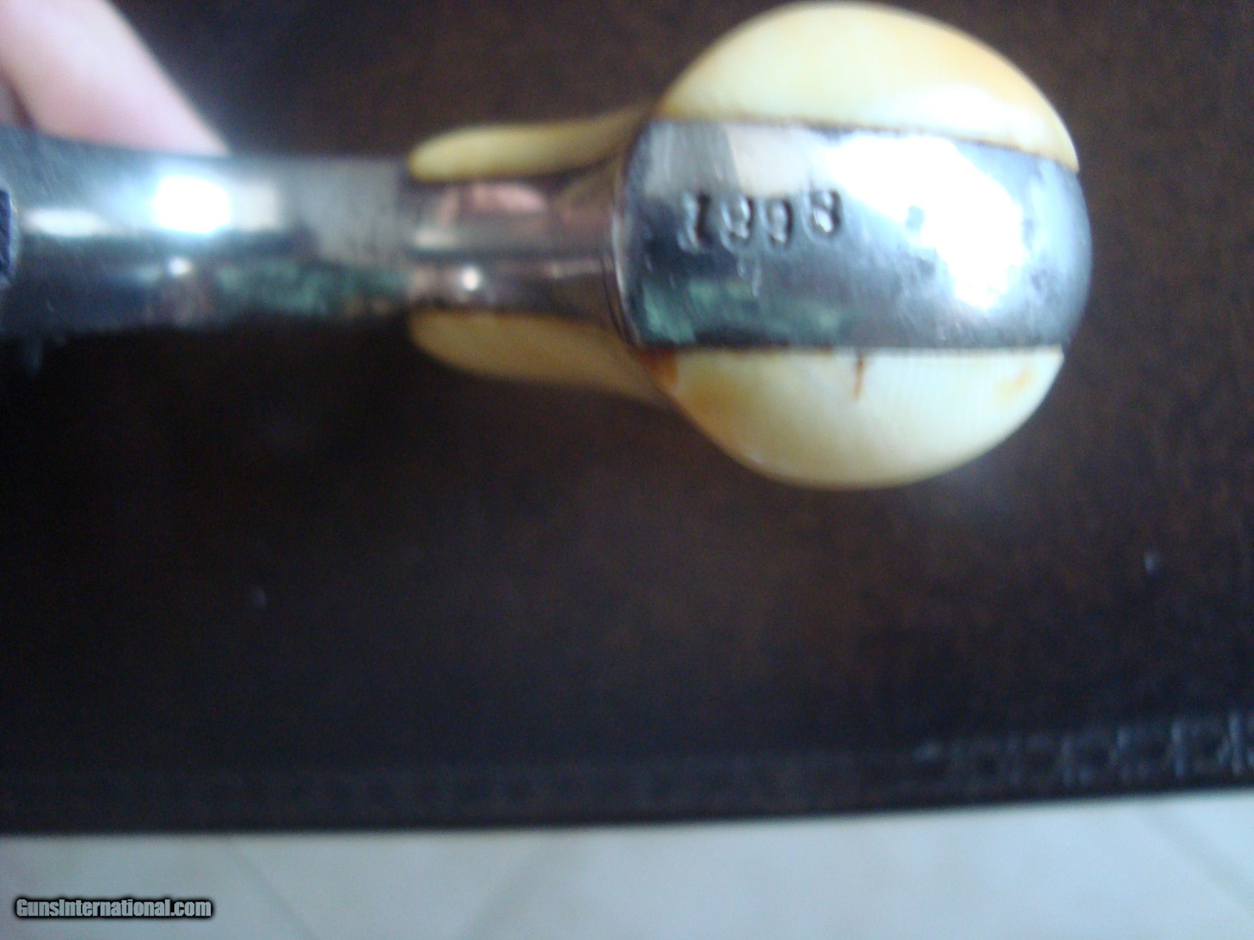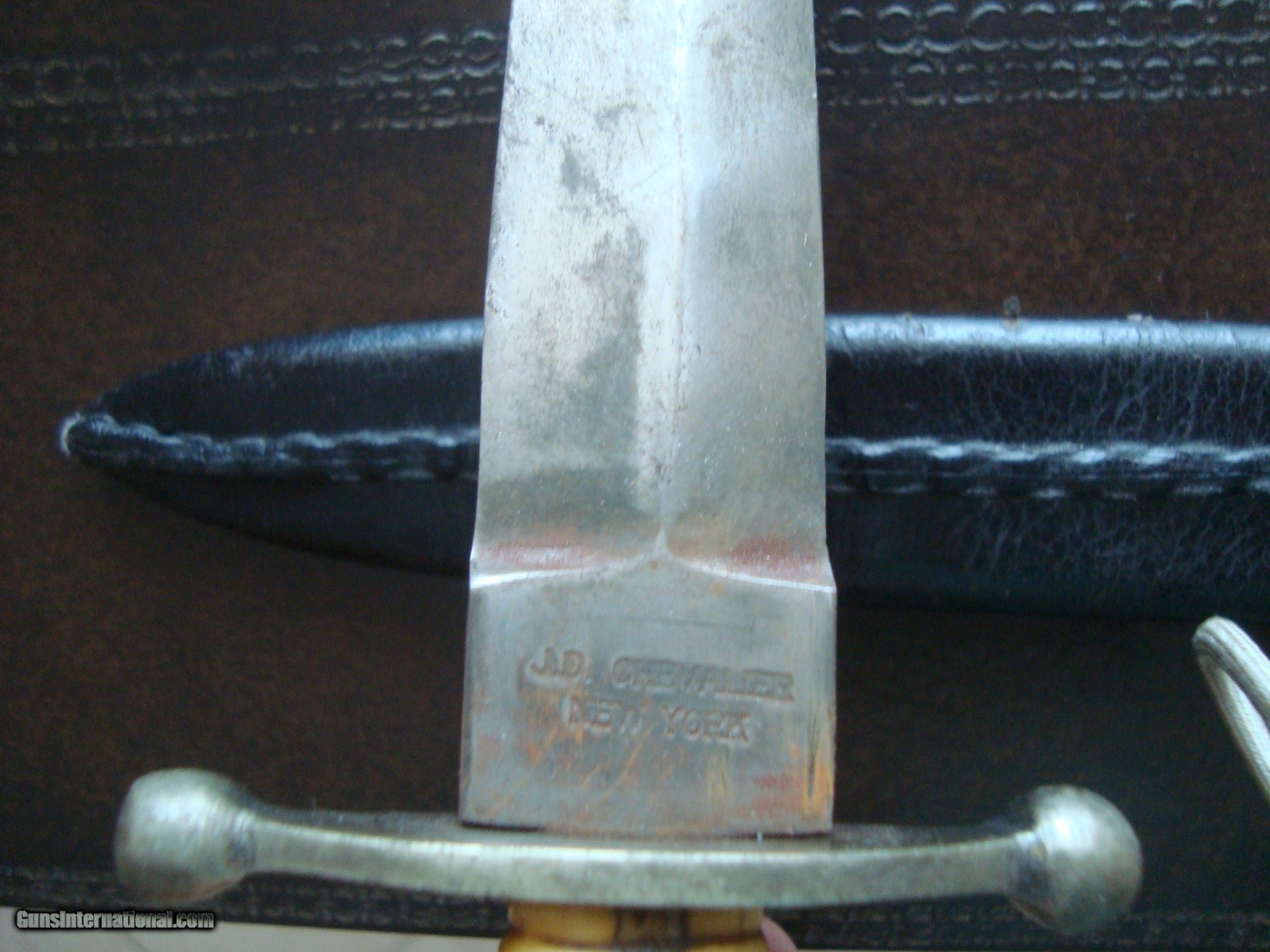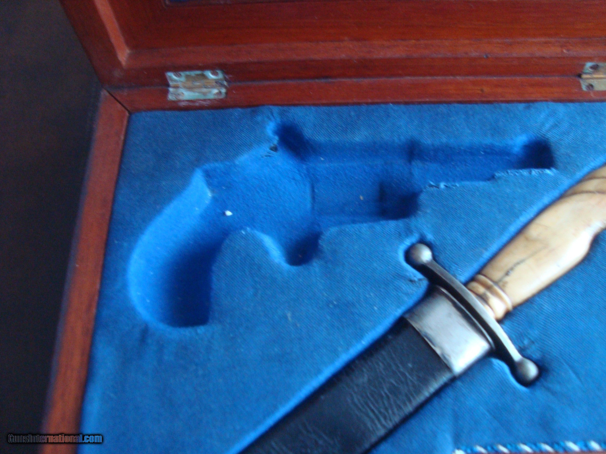 Description: This is a superb 1800's Spear Point Bowie knife made by J.D.Chrvlier New York with a leather sheath bone grip. Along with a sper trigger, nickel plated, engraved Long Star No.2 pistol in good working order. Manufactured. by The New York Pistol Company.with bone grips, Sn.1888, and a patent date of 1875, in cal 32 rim fire. In a nice old walnut presentation case. Shipping and Insurance $ 35.00 Priority Mail to the lower 48 states, no sales out of the USA. SOLD Antique: Yes Handgun Caliber: .32 Rimfire |