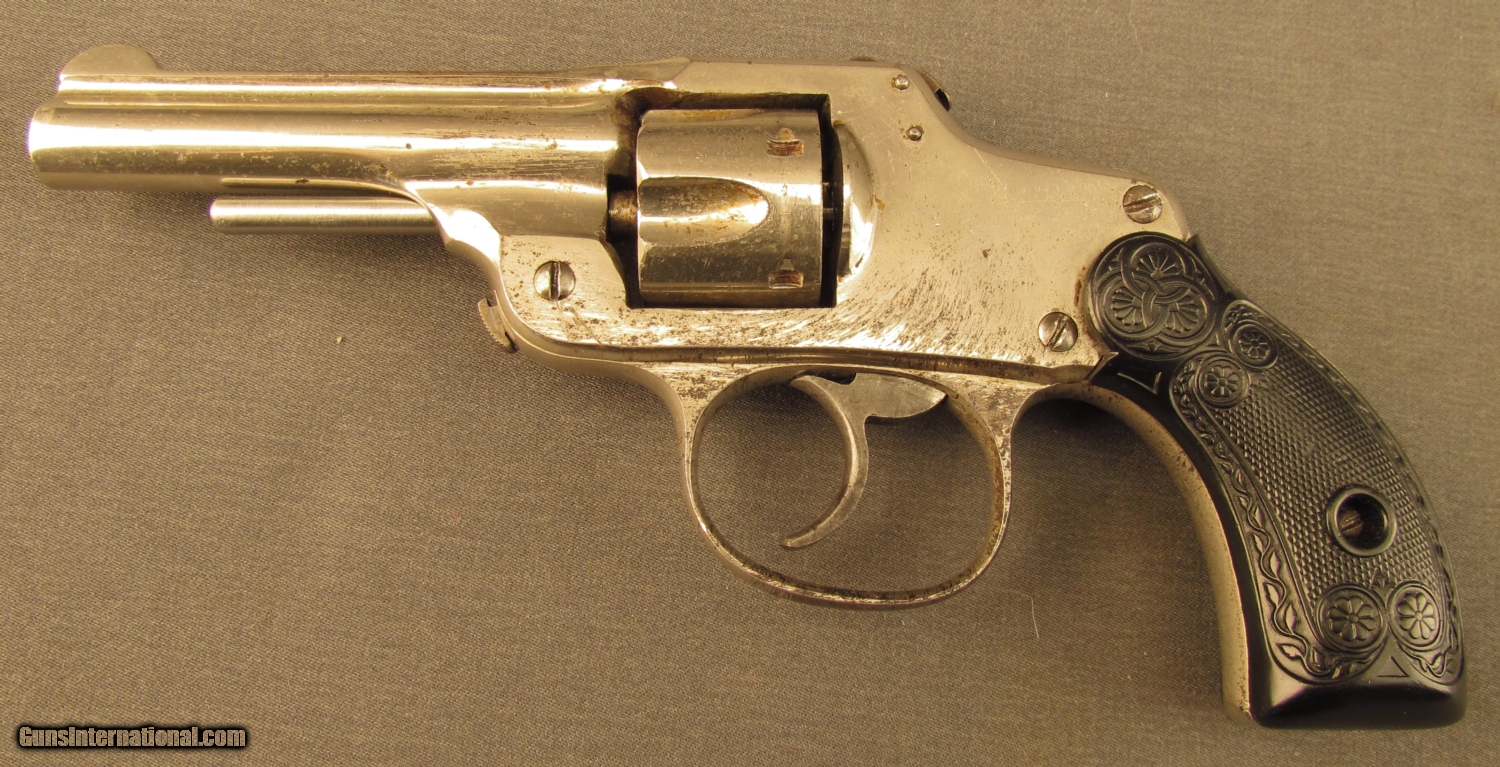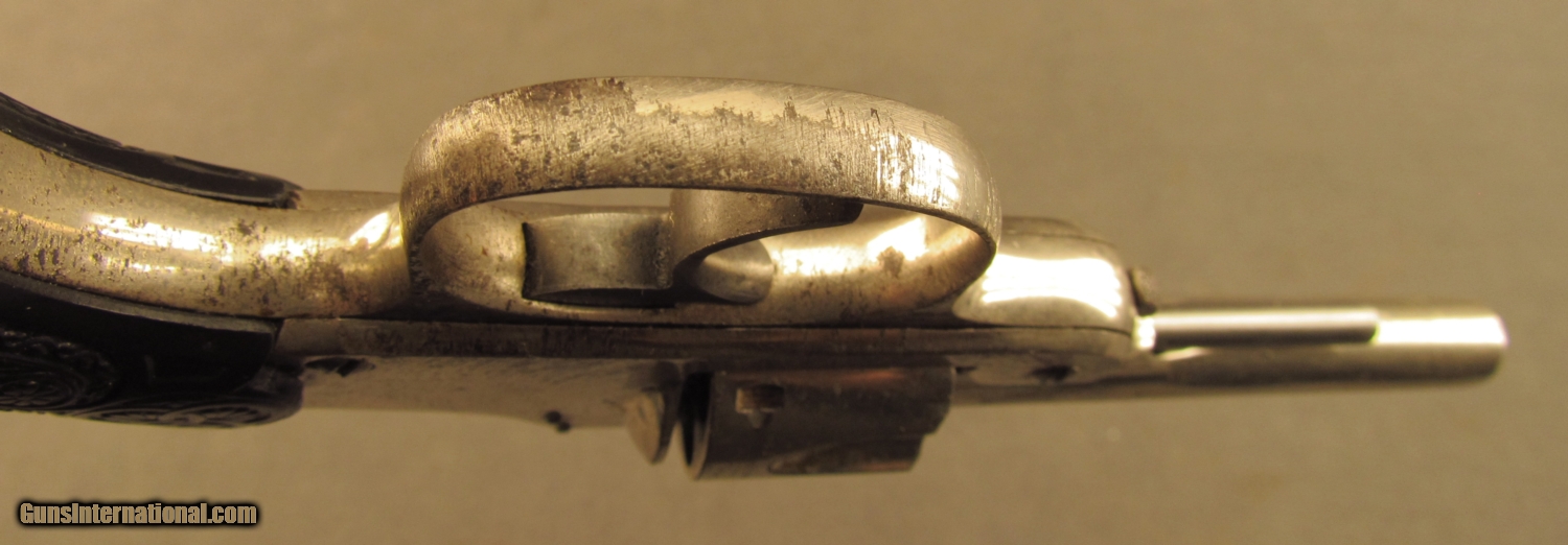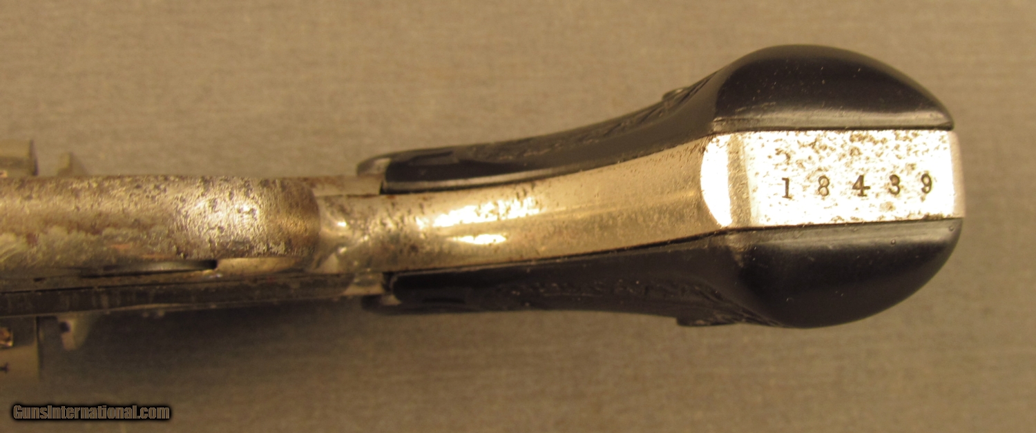 Description: S# 18439, 32 S&W, 3 inch barrel, very good bore. This interesting hammerless revolver features a safety at top of grip and remains in very good condition with 75% nickel showing scattered small areas of loss (worst of trigger guard) with dark patina peeking through. The fancy flower and vine hard rubber grips show very little wear and fit perfectly. these were built from 1889 to 1896 with some sources indicating the iron frame guns are from the last year. A very nice example of these unusual revolvers in the less common iron frame. Antique. SOLD Antique: Yes Manufacturer: Otis Smith Model: DA Serial Number: 18439 Caliber Info: .32 S&W Gauge Info: .32 S&W |