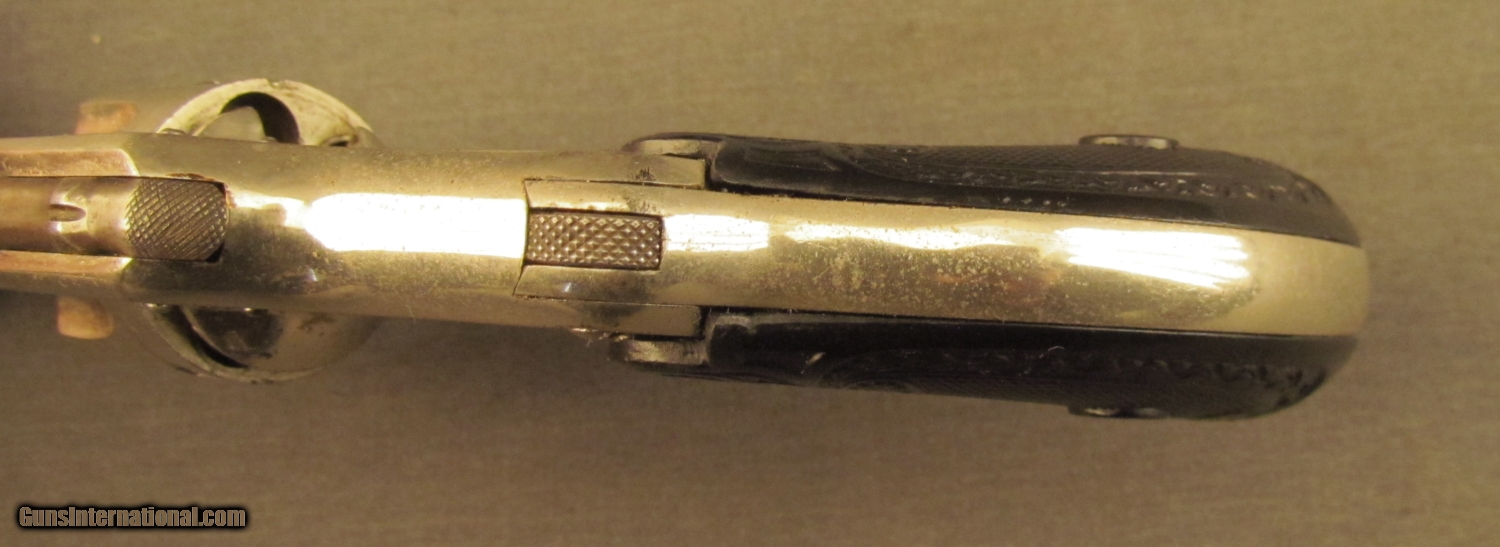 Description: S# 18439, 32 S&W, 3 inch barrel, very good bore. This interesting hammerless revolver features a safety at top of grip and remains in very good condition with 75% nickel showing scattered small areas of loss (worst on trigger guard) with dark patina peeking through. The fancy flower and vine hard rubber grips show very little wear and fit perfectly. these were built from 1889 to 1896 with some sources indicating the iron frame guns are from the last year. A very nice example of these unusual revolvers in the less common iron frame. Antique. SOLD Antique: Yes Manufacturer: Maltby Model: DA Serial Number: 18439 Caliber Info: .32 S&W Gauge Info: .32 S&W |