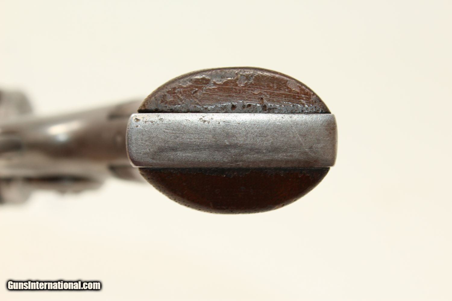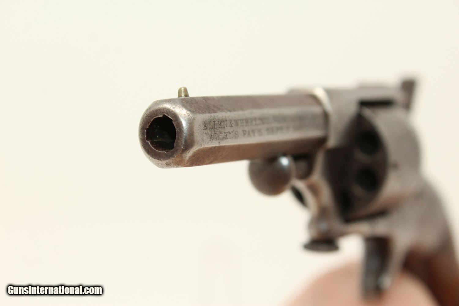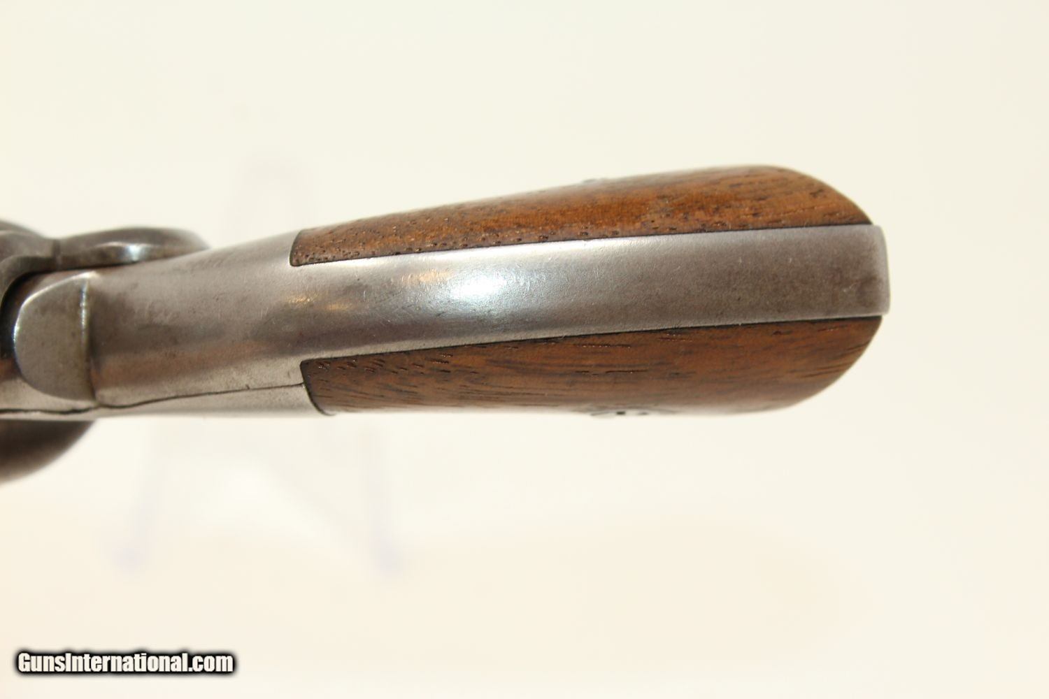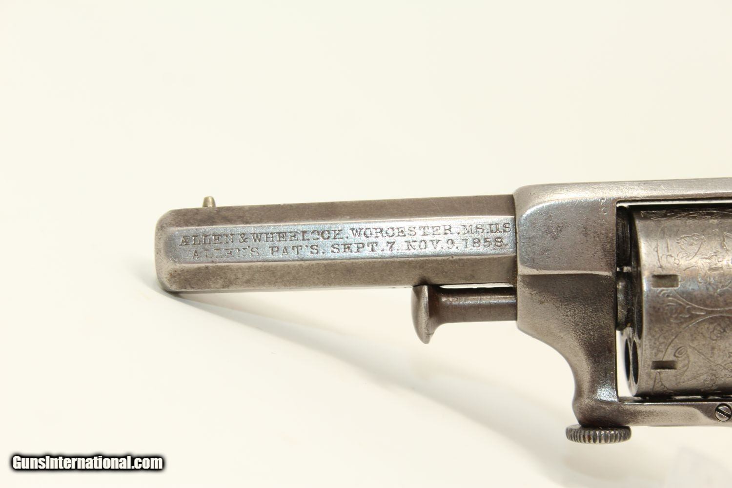 Description: MASSACHUSETTS Themed Cylinder Scenes Allen & Wheelock SIDEHAMMER Revolver 5-Panel Cylinder Scene and Walnut Grips! Here we present an antique Allen & Wheelock Sidehammer Revolver, made circa 1858 in Worcester, Massachusetts. There we 8 different variants of this revolver made between 1858 and 1865, and only 1,500 are thought to have been made total, making this a very scarce little revolver. The most immediately eye-catching feature on this revolver is the side-mounted hammer on the right side of the gun. The next is the 5-panel cylinder scene featuring a version of the Massachusetts State seal with a Native American and a star, a collection of cannon and other small arms, a horseman charging with a spear raised overhead, crossed rifles and handguns, and ship with a fort in the background. The left side of the barrel is marked “ALLEN & WHEELOCK. WORCESTER. MASS./ALLEN’S PAT’S. SEPT. 7. NOV. 9. 1858.” The overall condition is Very Good+. The bore is in good condition with nice 3-groove rifling. The action is as strong as ever in this little guy. The markings are all very clear, notably and impressively, the cylinder scenes. A very attractive little pocket revolver from the 1860s! Own the original! This is a legitimate antique and not a reproduction. Barrel is 2-1/2 inches. Caliber: .22 Rimfire Overall condition as seen in photos. Very Fast. Very Safe. FREE SHIPPING WORLDWIDE. Delivered directly to your door by express mail! Guaranteed AUTHENTIC & Includes CERTIFICATE OF AUTHENTICITY. ancestryguns $1150 #190667 SOLD Antique: Yes |