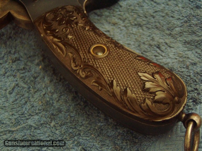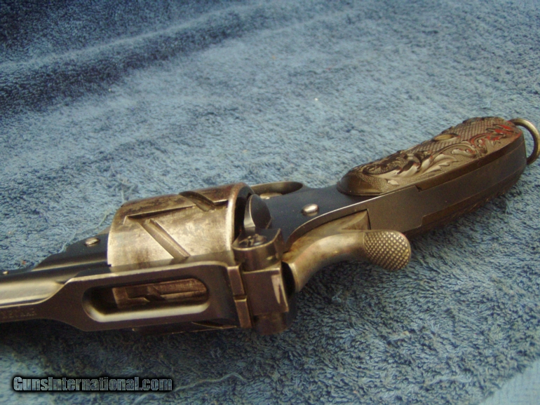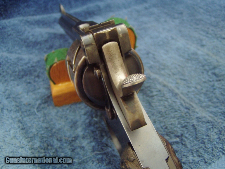Description: This is a very nice example of Paul Mauser's , ZICK-ZACK ("ZIG-ZAG"), "Break-Open" large caliber revolver. 10.6mm Caliber. Very few of these were manufactured up to 1887. Has a 5.5" barrel with an excellent bore. Action is crisp and works like it should. This is the later variant with a special safety on left, behind cylinder. The top barrel flat is marked:" WAFFENFABRIK MAUSER OBERNDORF/NECKER". Serial number #2057 and all matching on frame, latch and cylinder. The frame retains approx. 98% fire blue finish. The cylinder is faded patina with traces of bluing. The grip panels are of a hard rubber or gutta percha , with very nice floral leaf, design. They are in excellent condition. Screw heads are excellent, also. FREE SHIPPING! to lower 48 states. International shipping is $70.00 plus $25.00 Bank wire fee. I accept USPS Money Order or Bank Cashier's Check. Will accept Personal check, with shipping hold. Antique SOLD Antique: Yes Manufacturer: MAUSER Model: C78 ZIG-ZAG Serial Number: #2057 Caliber Info: 10.6mm Bore: 5.5 Chambers: 6 shot Ejectors: bottom break Condition: excellent Metal Condition: excellent Bore Condition: excellent Barrel Type: round Action: Single Action Stock: Hard Rubber Finish: excellent Sights: barrel Manufacture Date: 1878 Engraving: grips floral design |