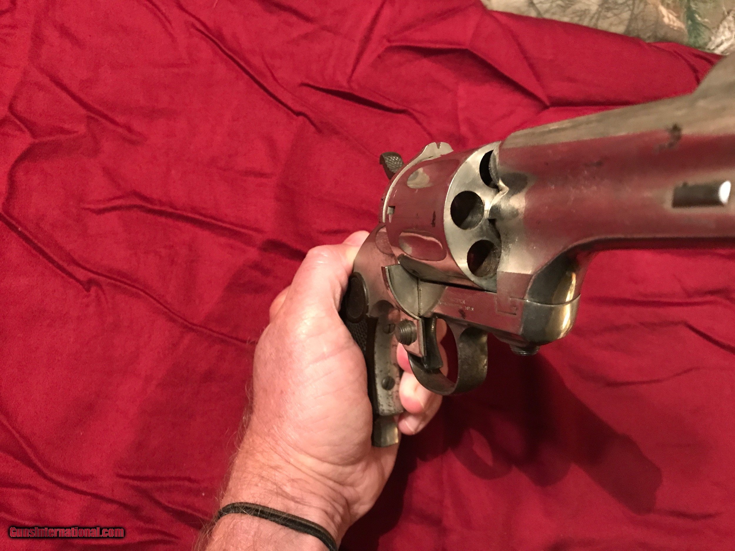 Description: Fine Merwin Hulbert Pocket Army with nickel plated finish has scattered areas of minor surface corrosion with minor pin-prick pitting. Very tight action. Barrel has good rifling with some minor roughness at the muzzle. Needs cleaning. Chambers are perfect. Grips are perfect. Markings are all sharp. Very nice Merwin Hulbert for the price. SOLD Antique: Yes Handgun Caliber: .44-40 Winchester (.44 WCF) Manufacturer: Merwin Hulbert Model: Pocket Army Caliber Info: 44 Winchester Condition: Excellent Bore Condition: Good |