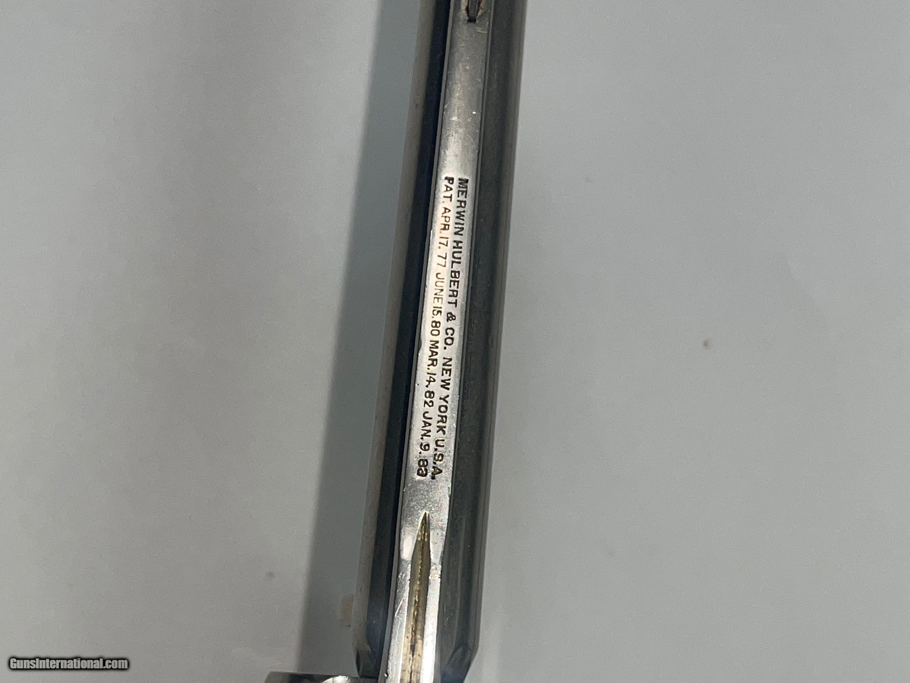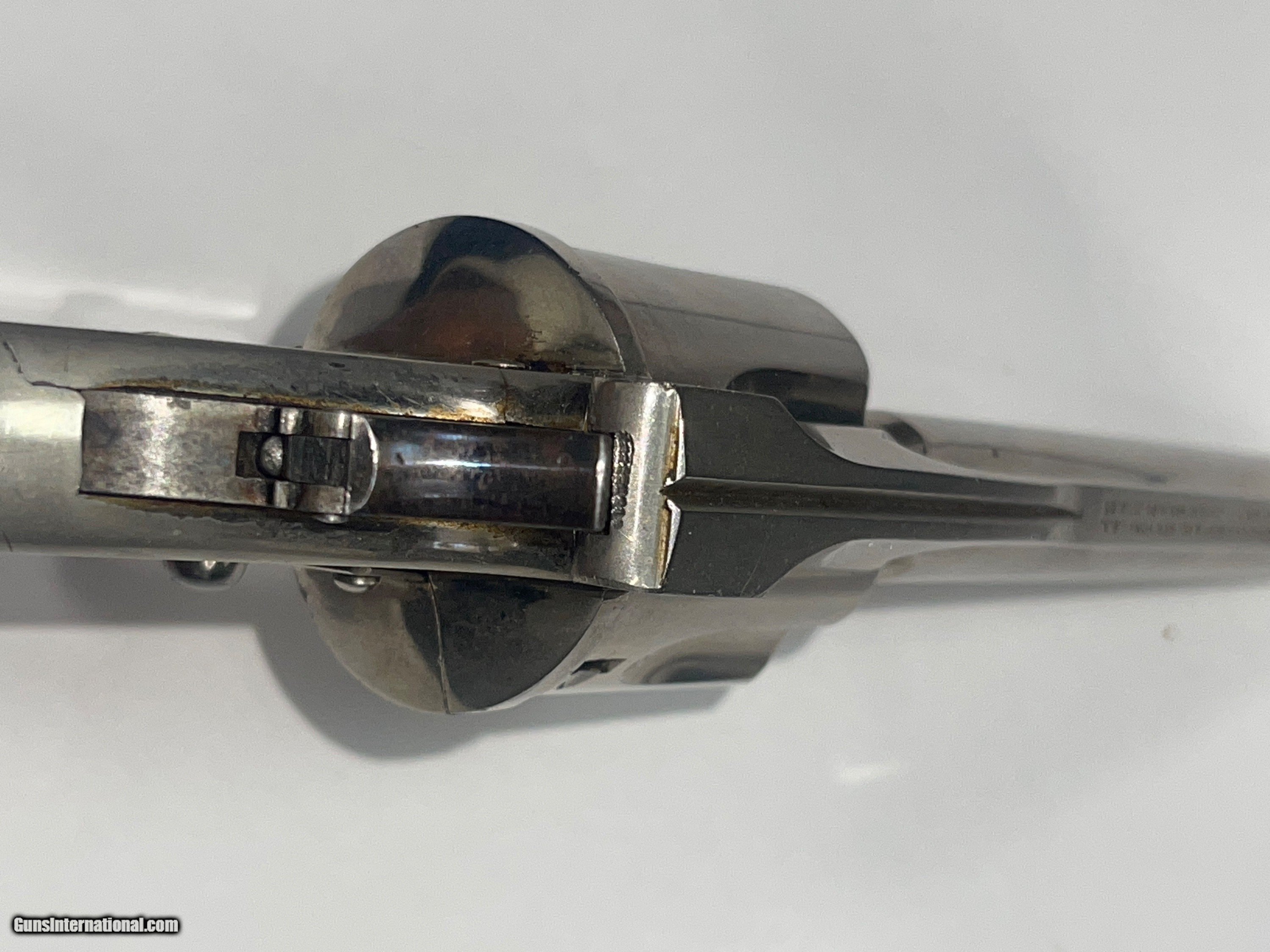 Description: This M & H is probably the most fascinating design for an American pistol ever, Those familiar with it are usually surprised they went out of business. Probably because of price, This honey is about as minty as you will find. There is little or no evidence that it has ever been fired ,If It has , possibly not more than a couple of times. The bore is mirror bright with razor sharp rifling and some slight scattered frost. The remaining original finish is at the very least is 99.9+% with possibly one or two almost imperceptable plating flakes. The Gutta Percha grips are also perfect as is the grip screw. Please note that this beauty has the optional "Folding Hammer". This turn of the century wonder is a great find for the collector and certainly a centerpiece candidate. Investtment at $1595. Curio/Relic: Yes Handgun Caliber: .38 Price: $1,595.00 Buy Now Contact Seller |