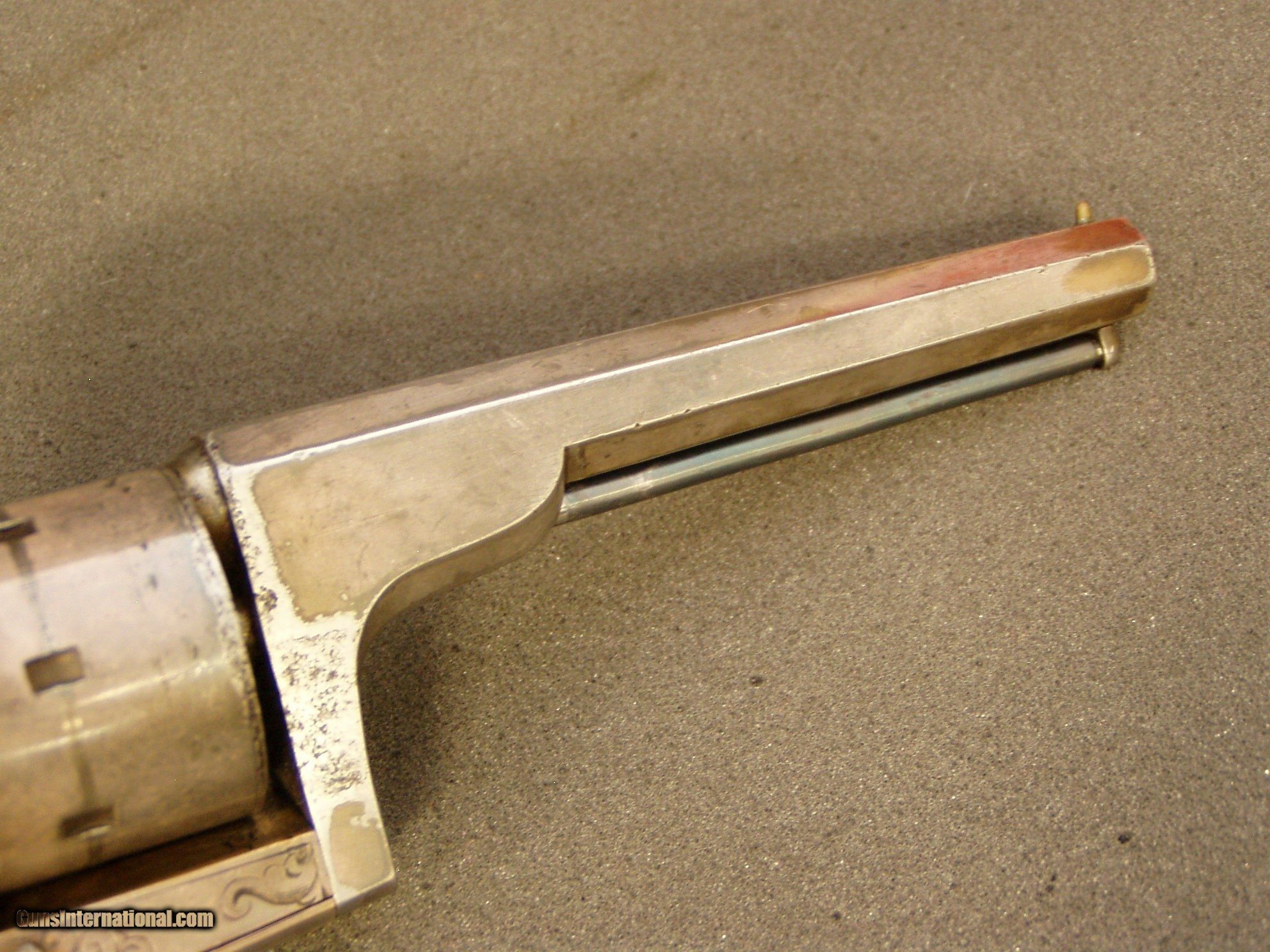 Description: Engraved and Silver Plated Moore's Patent Belt Revolver. .32 RF caliber. 5" octagon barrel with an excellent bore. Silver finish, walnut grips. The finish may have been originally silver-gilt. Only 5-8,000 of these revolvers were manufactured in 1861-1863. It has standard cone and notch sights, "D. MOORE. PATENT. SEPT. 18. 1860" on top of the barrel, serial number on the bottom of the barrel lug, scroll engraving with punched backgrounds on the frame and grip frame, and the matching assembly number "12" on the frame, cylinder, hammer, front strap, and grip. Very fine with 80% plus original silver plating, aged patinas throughout, crisp engraving, some minor pitting, and small marks. The grip is very good with glossy finish, slight shrinkage, and a small chip at the toe. Mechanically fine. Buyer pays $20.00 shipping to lower 48 states. I accept USPS Money Orders and Bank Cashier's Check.( Will accept Personal check, with shipping hold). 3% Credit Card Fee. Three Day non-firing non-disassembly inspection period. If returned, for any reason, full refund less shipping. Layaway Available! One third down, balance on or before end of 90 days. Other reasonable layaway options considered. ANTIQUE! SOLD Antique: Yes Manufacturer: MOORE'S PATENT FIRE ARMS COMPANY Model: BELT REVOLVER Serial Number: SERIAL #1693 Caliber Info: .32 RF Bore: 5 Chambers: 7 Ejectors: MANUAL ROD Condition: EXCELLENT Metal Condition: EXCELLENT Wood Condition: Excellent Bore Condition: Excellent Barrels: ONE Barrel Type: OCTAGON Action: SINGLE ACTION Triggers: ONE Stock: WALNUT Finish: SILVER PLATE & PATINA Sights: BARREL Manufacture Date: 1861-1863 Engraving: SCROLL ENGRAVING |