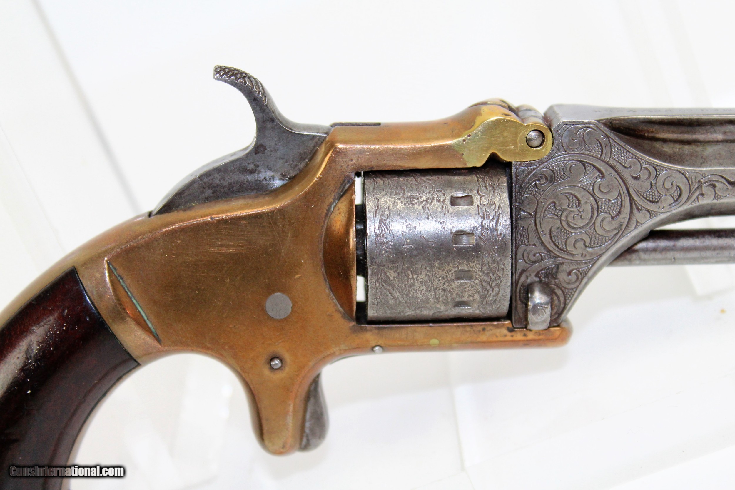 Description: PAIR of ENGRAVED Antique MANHATTAN .22 Revolvers With Great Cylinder Scenes! Here we present a set of antique Engraved Manhattan Arms Pocket Revolvers in .22 Rimfire, made in Newark, New Jersey circa the 1860s. This small, 7 shot .22 revolver was a direct copy of the successful Smith & Wesson Model No. 1 Second Issue Revolver. While the making of the American Standard Tool (the successor to Manhattan) revolver commenced after S&W’s Rollin White patent expired in 1869, the Manhattan Firearms Mfg. Co. made direct and quality copies of the S&W pistol without any regard to their patent infringement. The Manhattan Co. became part of AST in 1868 after briefly closing its doors. Interestingly, Manhattan was also famous for its blatant copies of Colt’s patents. In some ways, this is not terribly different than what goes on today in the firearms industry. Imitation is the sincerest form of flattery. The cylinder scene on these revolvers features settlers and Native Americans in a desperate fight. Cylinder scenes served multiple purposes at this time, primarily to make a gun difficult to forge, but certainly you can see the aesthetic value and the advertising that this one does for itself. A fascinating, if dark and gruesome, peek into mid-19th century America. The top of both revolvers is marked “MANHATTAN FIRE MF’G. CO. NEW YORK”. Each of these bears nice factory engraving. These come in a neat little wooden box that has been fitted with a form fitted block to display them. This would be a great candidate for some felt to make it a real looker. The overall condition of the first is good, while the second is very good. Each has a mixed patina. Markings are clear on both. The engraving is clearer on the second. The grips are the first are shy. The bores are in good shape with visible rifling. The actions are strong. Own the original! This is a legitimate antique and not a reproduction. Barrel is 3-1/8 inches. Caliber: .22 Rimfire Overall condition as seen in photos. Very Fast. Very Safe. FREE SHIPPING WORLDWIDE. Delivered directly to your door by express mail! Guaranteed AUTHENTIC & Includes CERTIFICATE OF AUTHENTICITY. ancestryguns $1175 #7307 SOLD Antique: Yes |