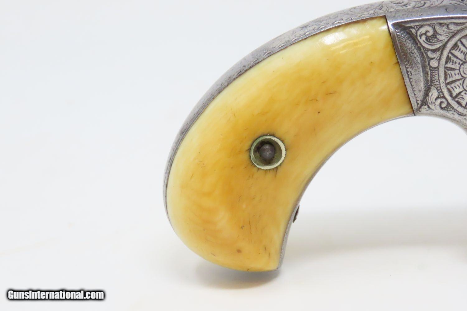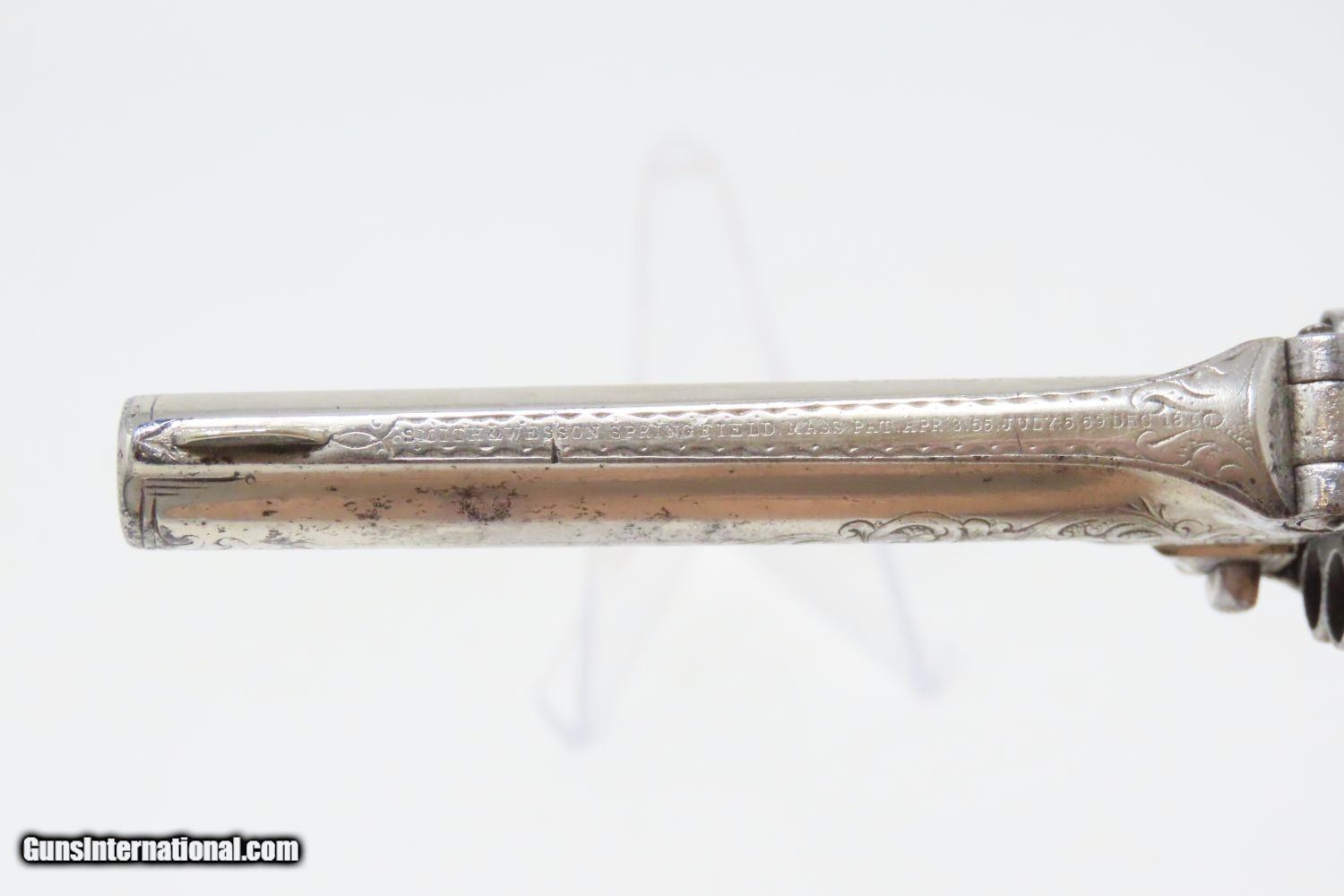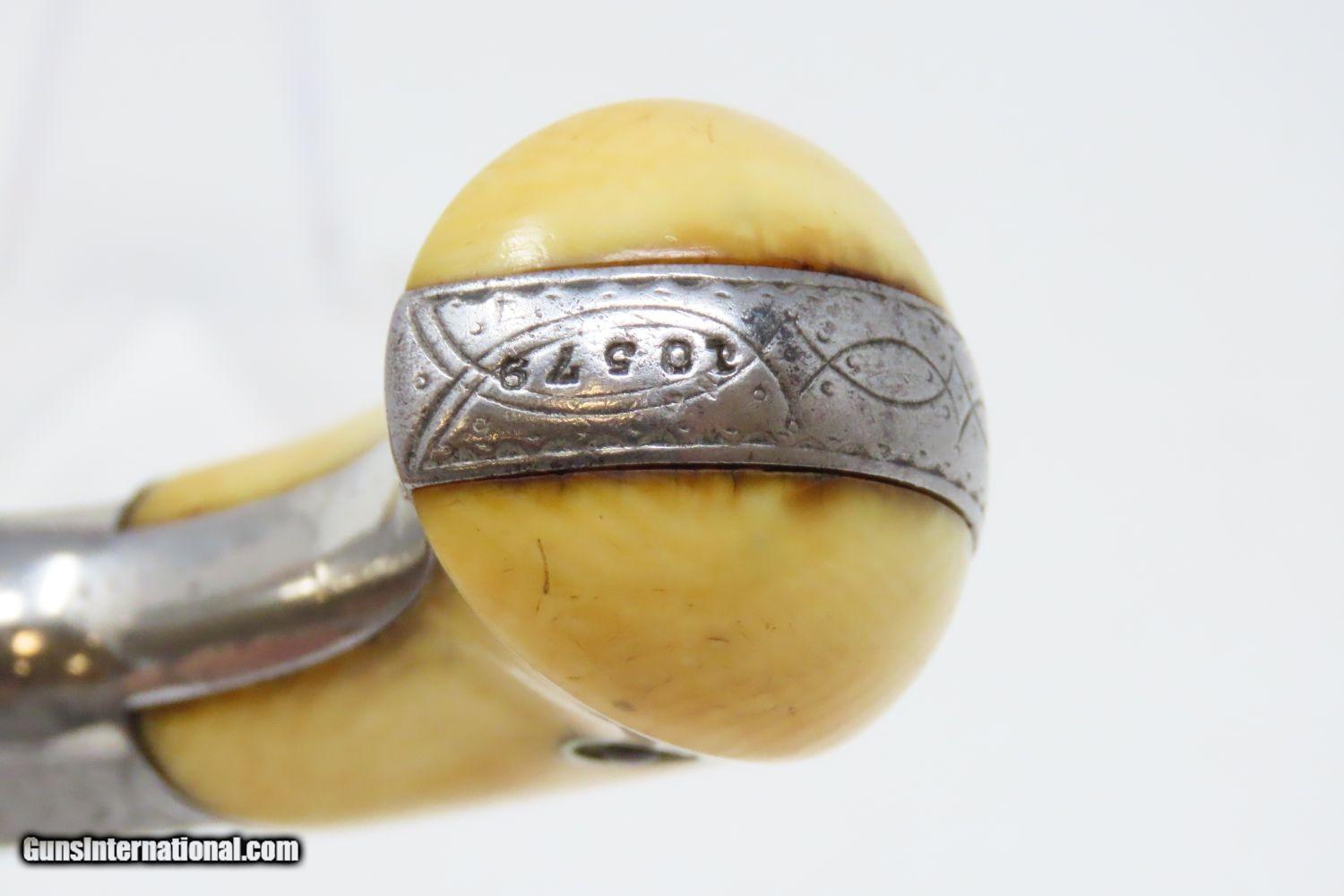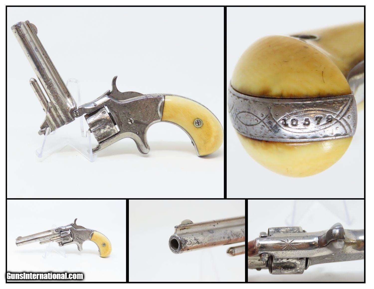 Description: PERIOD ENGRAVED Antique SMITH & WESSON No 1 Third Issue 22 Rimfire Revolver 19th Century POCKET CARRY with IVORY GRIPS! Here we present an Engraved Antique Smith & Wesson Number 1, Third Issue Revolver, made circa 1868-81. The No. 1 was Smith & Wesson’s first metallic cartridge firearm. It utilized the idea of the “bored through cylinder”, which was patented by Rollin White and subsequently exclusively licensed by Smith & Wesson. This concept has forever changed revolving firearms design, and is the same idea used in revolvers today. S&W, via Rollin White himself, aggressively sued any patent infringers and were able to hold their monopoly on the American market for cartridge revolvers from about 1857 to 1870, whereupon their patent expired. The results were a very profitable business, a broke Rollin White, and a grudging U.S. Chief of Ordnance Alexander Dyer, who was still angry in 1870 about not being able to use the technology during the Civil War. The U.S. government ended up giving Colt their contracts since they valued the larger .44 caliber in the Colt 1860 Armies over the .32 caliber full sized No. 2 Armies. The Third Issue was S&W’s final improved version of the revolver. The rounded birds head grips, fluted cylinder and round barrel made this an even sleeker variant of the revolver that started it all. This small revolver is a 7-shot .22 rimfire. It was specifically designed to be a pocket gun, being very small and light. For those not wanting or needing a full-sized gun or for those who wanted a backup this revolver was the ideal firearm for the turbulent 19th century. This one features professional period engraving throughout with ivory grips and a nickel finish, a very attractive combination. The overall condition is very good. The action is strong and tight. The bore is in good shape. Although small, this revolver will make a prodigious impact on any collection! Own the original! This is a legitimate antique and not a reproduction. Barrel is 3-1/4 inches. Caliber: .22 Rimfire Overall condition as seen in photos. Very Fast. Very Safe. FREE SHIPPING WORLDWIDE. Delivered directly to your door by express mail! Guaranteed AUTHENTIC & Includes CERTIFICATE OF AUTHENTICITY. ancestryguns $1235 #201200 SOLD Antique: Yes |