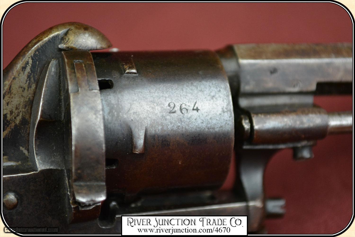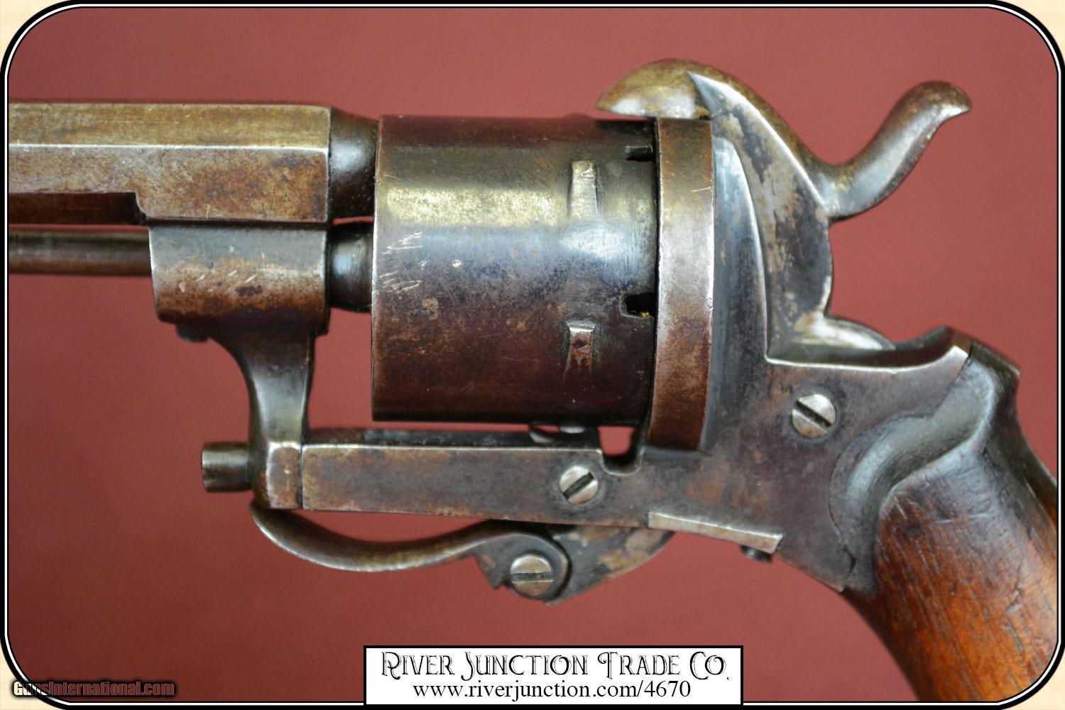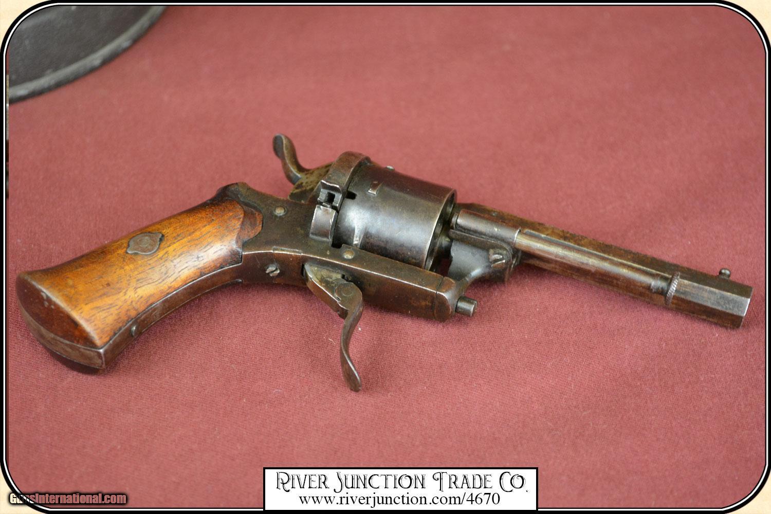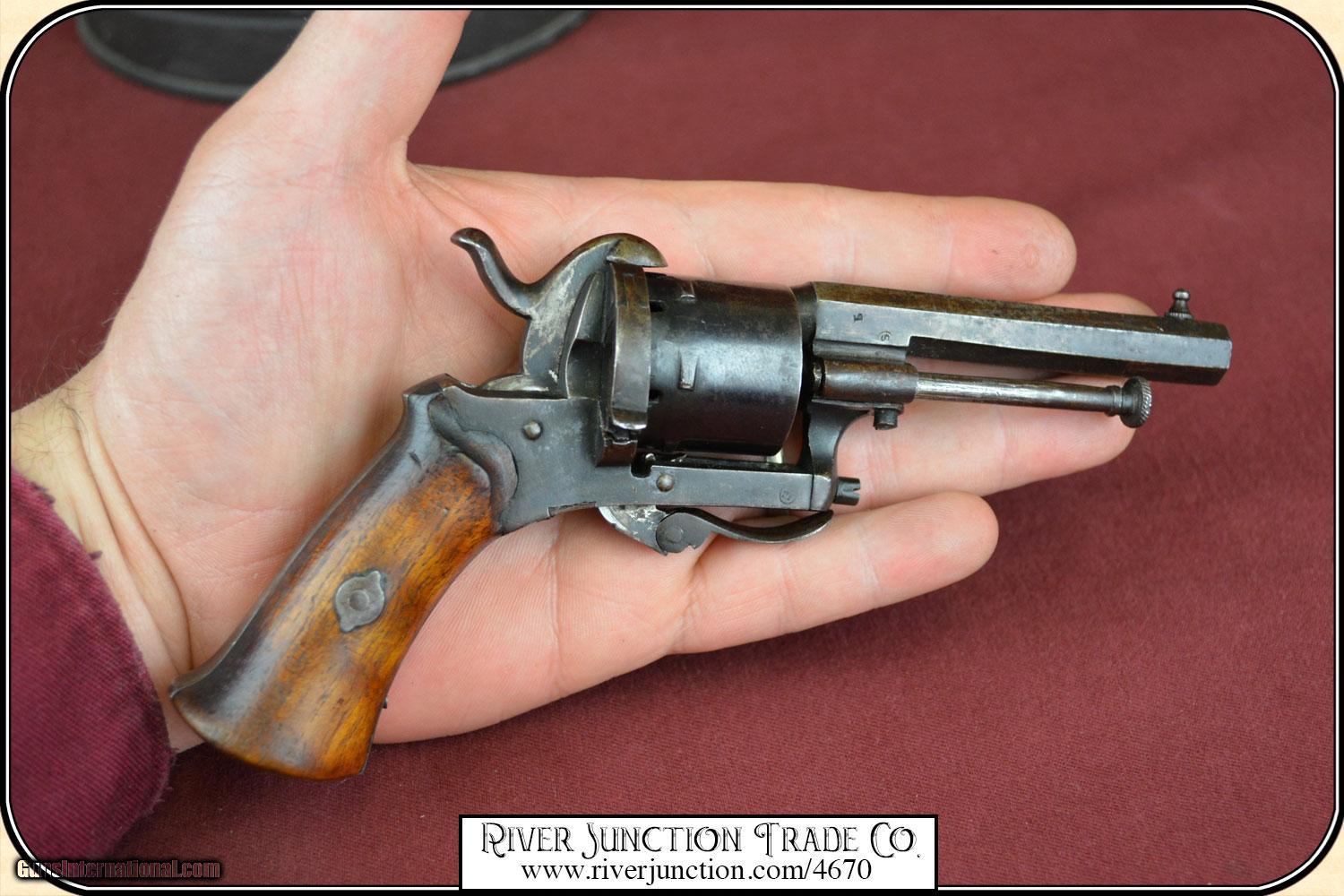 Description: This is a 7mm (about .32 ) Belgium Pin-fire revolver. This is a neat Civil War, or Indian War era revolver, probably used by ladies as a muff or garter pistol, or a gamblers hideaway revolver. This revolver is double action only. Lots of blue on the cylinder with very nice wood grips. A neat tiny example of the pin fire revolver that would be an unusual addition to your outfit. This is an ANTIQUE and can be shipped directly to you. Sold as an Antique ~ no guarantees, warranties, or liabilities for any actual usage. If any firearms are to be used for shooting purposes, a qualified gunsmith should inspect them first. We ship world wide. Payment Cash, postal money order, cashiers check, personal & business checks. Can be ordered with a credit card or paypal at wxx.riverjunction,cxx just type in the number 4670 in the search box. SOLD |