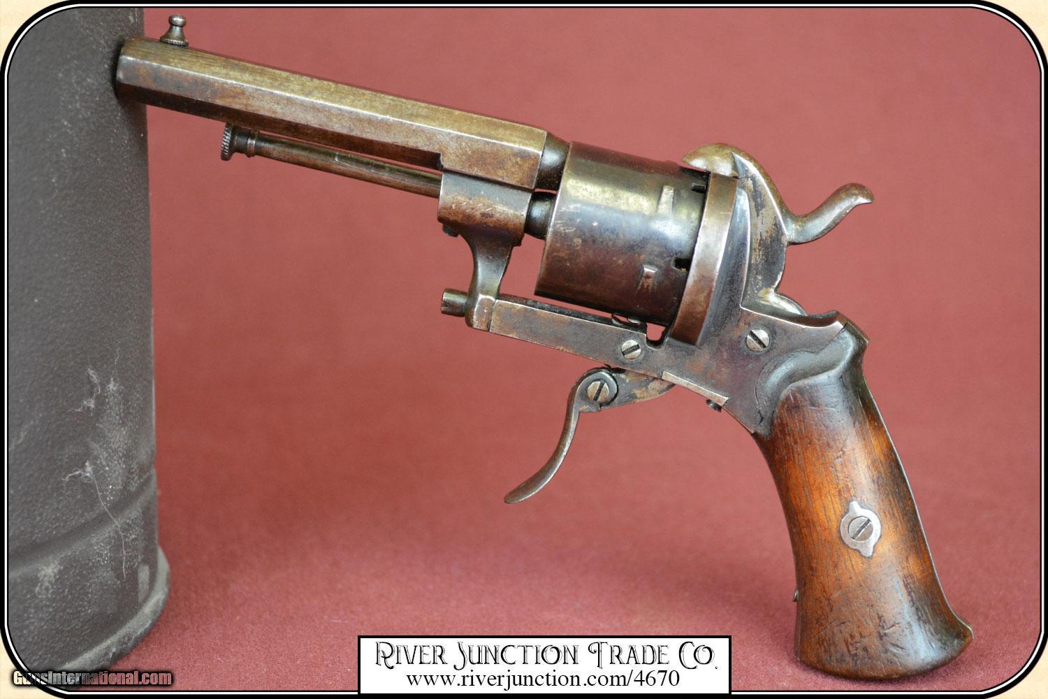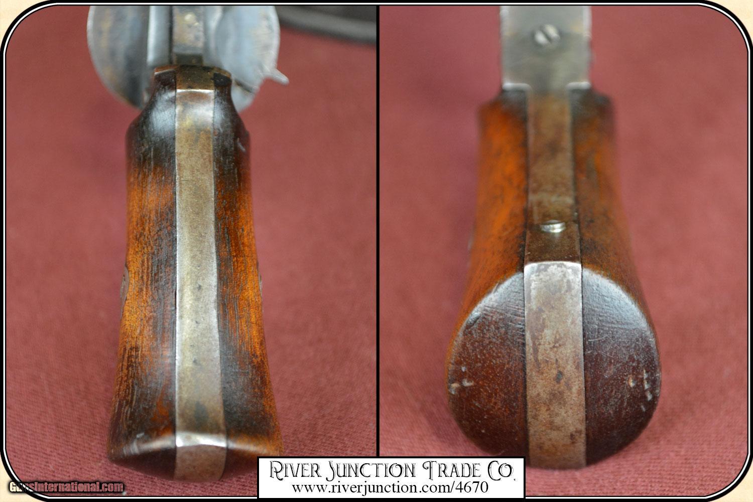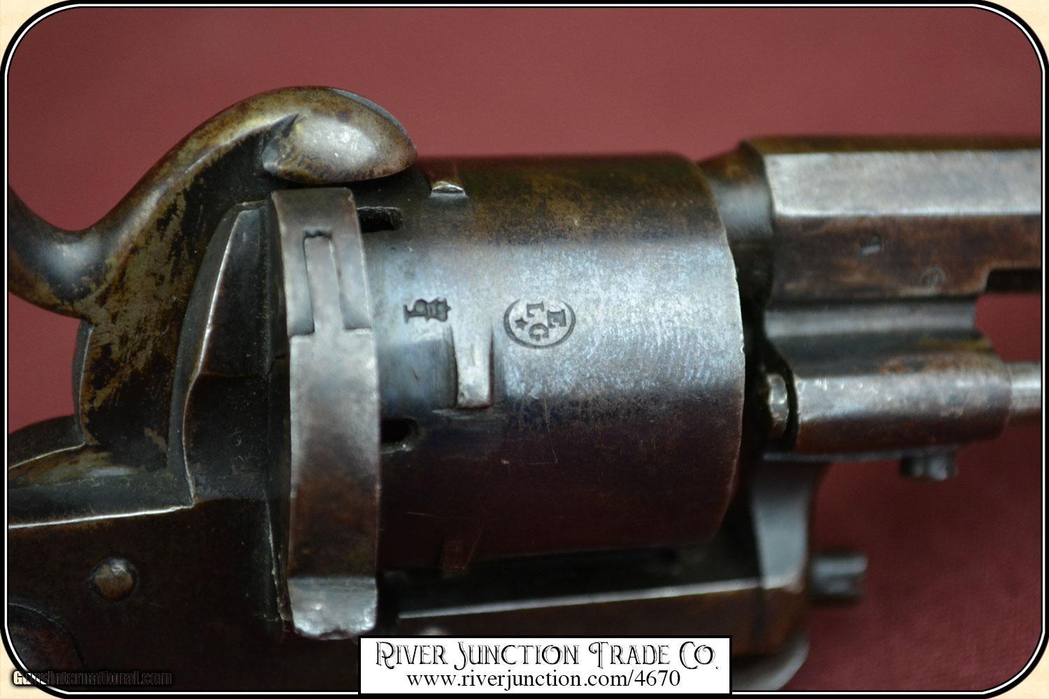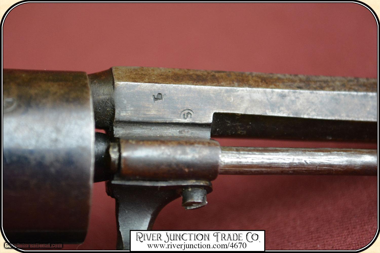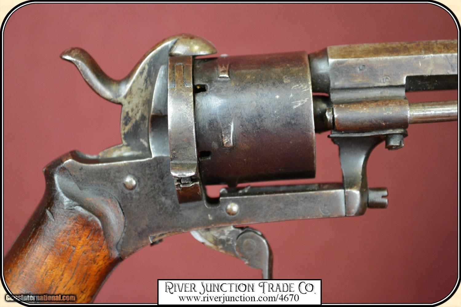 Description: This is a 7mm (about .32 ) Belgium Pin-fire revolver. This is a neat Civil War, or Indian War era revolver, probably used by ladies as a muff or garter pistol, or a gamblers hideaway revolver. This revolver is double action only. Lots of blue on the cylinder with very nice wood grips. A neat tiny example of the pin fire revolver that would be an unusual addition to your outfit. This is an ANTIQUE and can be shipped directly to you. Sold as an Antique ~ no guarantees, warranties, or liabilities for any actual usage. If any firearms are to be used for shooting purposes, a qualified gunsmith should inspect them first. We ship world wide. Payment Cash, postal money order, cashiers check, personal & business checks. Can be ordered with a credit card or paypal at wxx.riverjunction,cxx just type in the number 4670 in the search box. SOLD |