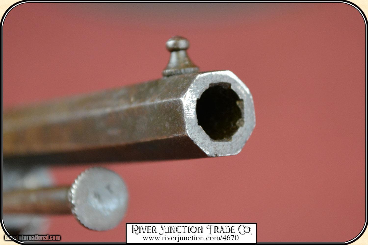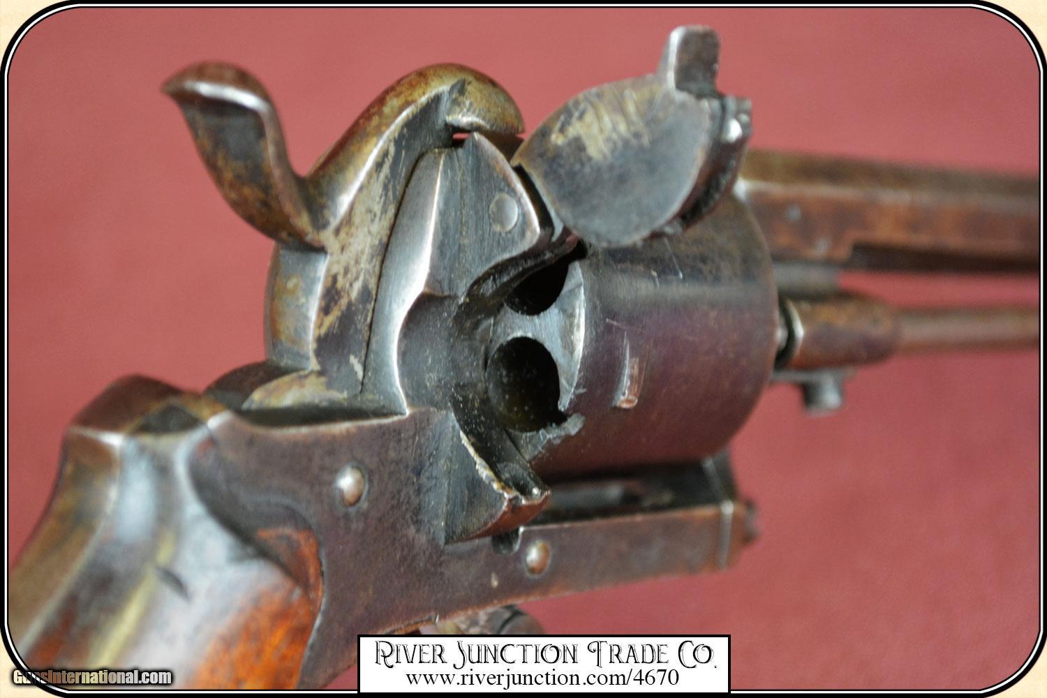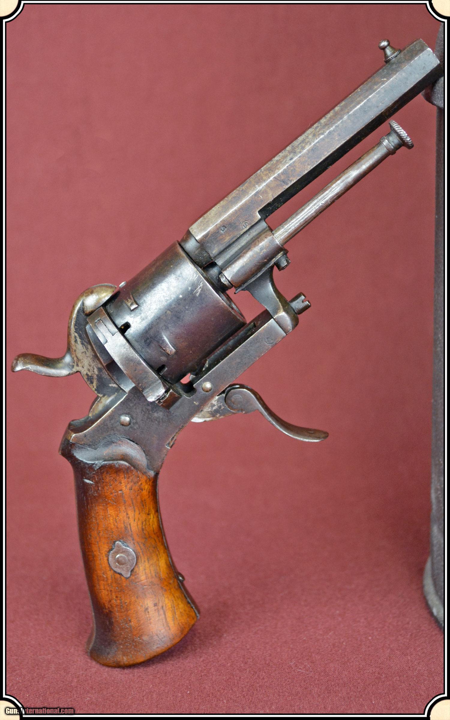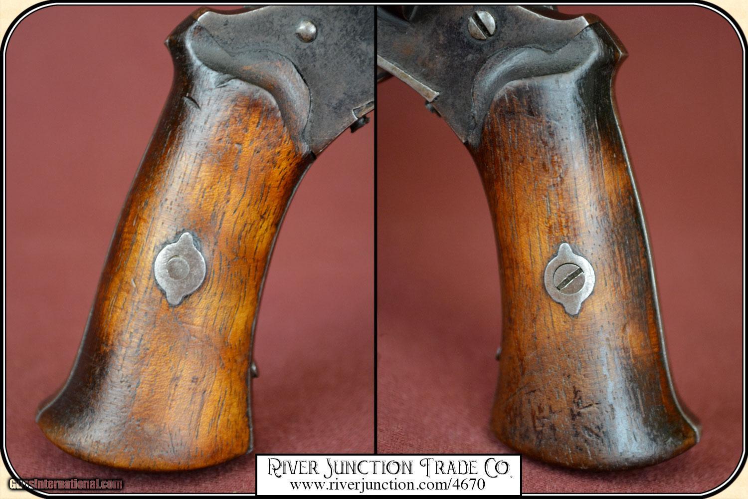 Description: This is a 7mm (about .32 ) Belgium Pin-fire revolver. This is a neat Civil War, or Indian War era revolver, probably used by ladies as a muff or garter pistol, or a gamblers hideaway revolver. This revolver is double action only. Lots of blue on the cylinder with very nice wood grips. A neat tiny example of the pin fire revolver that would be an unusual addition to your outfit. This is an ANTIQUE and can be shipped directly to you. Sold as an Antique ~ no guarantees, warranties, or liabilities for any actual usage. If any firearms are to be used for shooting purposes, a qualified gunsmith should inspect them first. We ship world wide. Payment Cash, postal money order, cashiers check, personal & business checks. Can be ordered with a credit card or paypal at wxx.riverjunction,cxx just type in the number 4670 in the search box. SOLD |