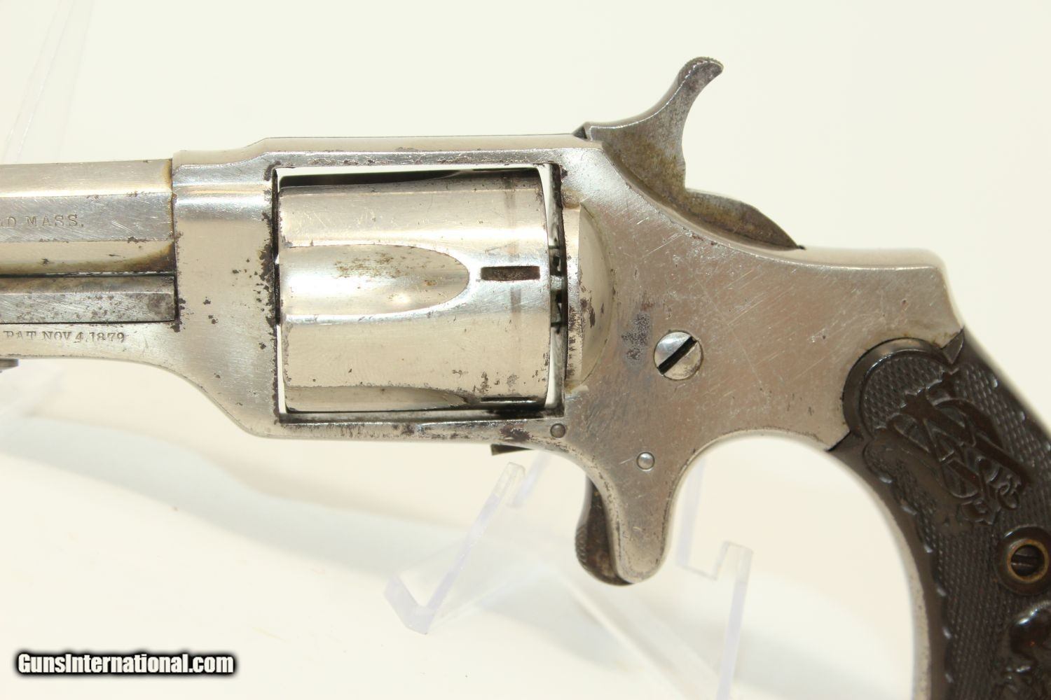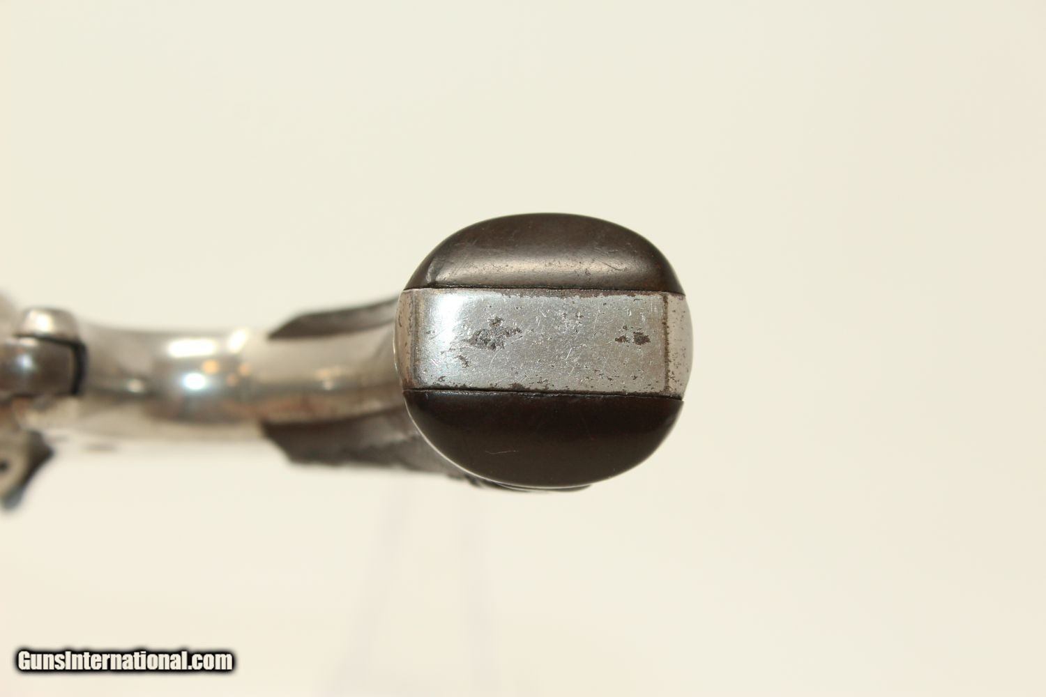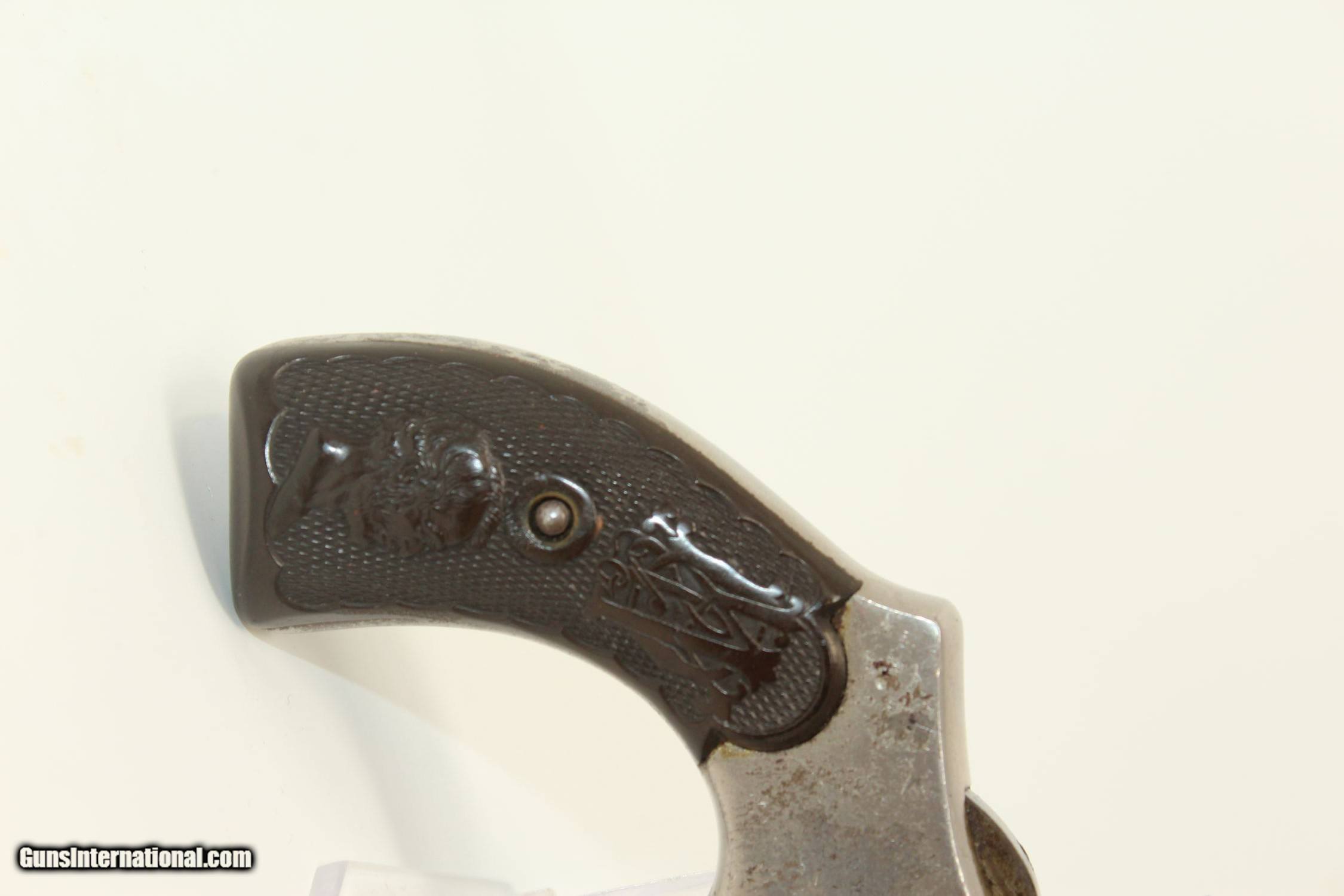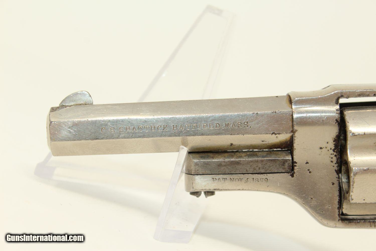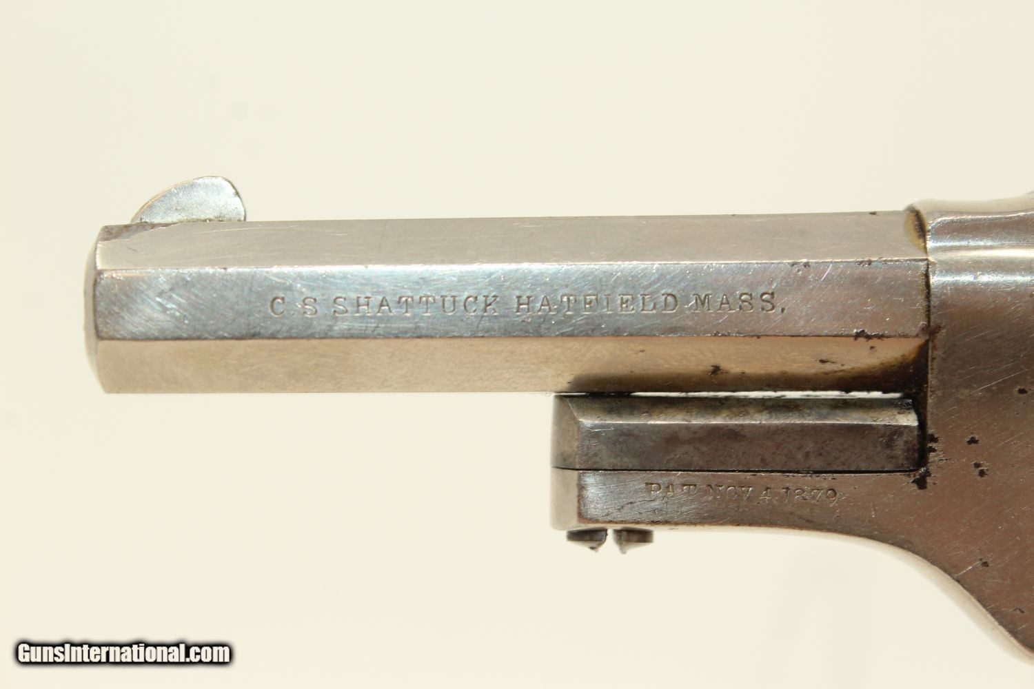 Description: Rare 1881 LINCOLN/GARFIELD Revolver by CS SHATTUCK 1 of 3000 Commemorating 2 Assassinated Presidents! Here we present an antique C. S. Shattuck Swing Out Pocket Revolver Commemorating Two Assassinated Presidents: Lincoln (1865) and Garfield (1881), made circa 1881 in Hatfield, Massachusetts. This little revolver features a neat, unique swing-out cylinder. Pressing the button behind the right recoil shield frees the cylinder arbor to pivot with the entire cylinder. The octagonal barrel has a front blade sight and a notch rear sight. The left side of the barrel reads “C.S. Shattuck Hatfield, Mass”. The left side of the casehardened frame reads “Pat Nov 4, 1879”. The hard rubber grips are monogrammed and have President Lincoln and President Garfield on them. These presidents were both Republicans and both were assassinated during their time in office. According to Flayderman, “There is an estimate of a few thousand total production” of this revolver. The overall condition is fine. The original nickel finish is 95% with some visible case colors. The markings are clear. The presidential grips are in fine shape. The bore is dark with sharp rifling. The action is excellent. Own the original! This is a legitimate antique and not a reproduction. Barrel is 2-3/4 octagon. Caliber: .32 Rimfire Overall condition as seen in photos. Very Fast. Very Safe. FREE SHIPPING WORLDWIDE. Delivered directly to your door by express mail! Guaranteed AUTHENTIC & Includes CERTIFICATE OF AUTHENTICITY. ancestryguns $975 #190191 SOLD Antique: Yes |