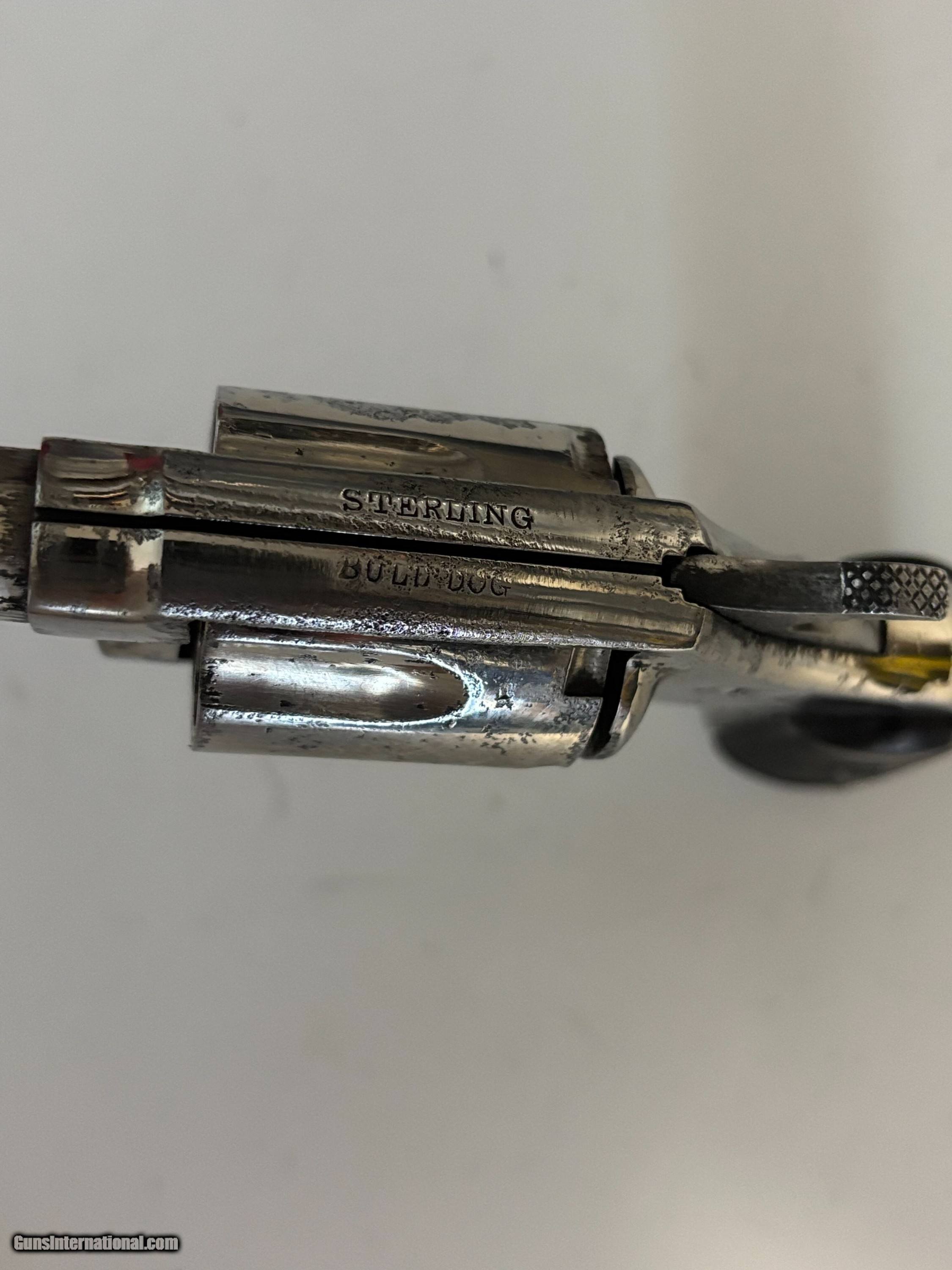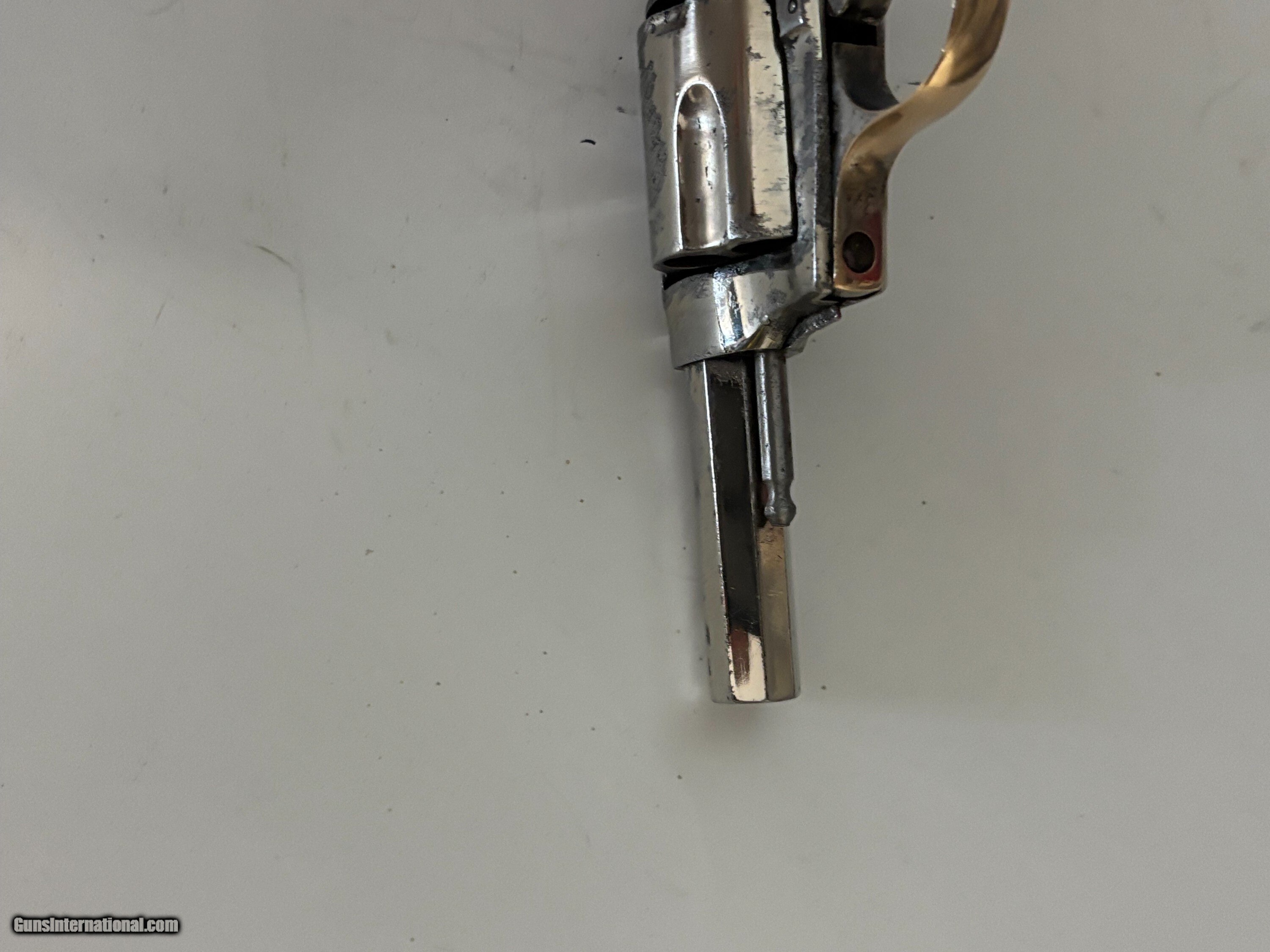 Description: Rare Antique Belgium .38 RF Pocket Bull Dog Revolver “ Sterling Bulldog “ nickel-plated brass construction 2 1/2’ octagon Barrel Double Action Pull pin cylinder release .38 RF Made for Black Powder Cartridges only A nice unusual piece to add to a double action antique revolver collection. Condition: 2 ½” octagon barrel. Bore has spot pitting from black powder use and evident rifling remaining. Metal finish retains most of the original nickel with some surface pitting , finish loss, scratches and wear marks. Finish loss mostly on the front of the receiver and cylinder. Please judge from the photos. Original black monogram checkered grips are in good condition for the revolvers age with a small repair done to the top left grip. Lettering is still crisp and legible. Mechanically works good in single action . Double action is very different . It needs a trigger pull which puts it in single action then another trigger pull releases the hammer. Almost like a 2 state trigger. Don’t know if that was the way it was designed ?? Some cylinder play at lock up. Single action spring is very tight and timing appears to be good. The hammer spur at some point broke off and cannot be fired unless the hammer is replaced. but this is a collectible not a shooter. This is an antique and no FFL required. Just proof of age. Will ship USPS priority mail at a cost of $15.00. This gun is sold "as-is" as a collectible with no refund and no return. Payment can be made with bank check, postal money order, or personal check. If you prefer instant payment and shipping please email me for account info. I can take Venmo Zelle or Cash App. For credit card purchase GunTab is available at check out. Antique: Yes Handgun Caliber: .38 Rimfire Manufacturer: Belgium Model: double action Barrel Length: 2 1/2 Price: $199.00 Shipping: $15.00 Buy Now Pay with