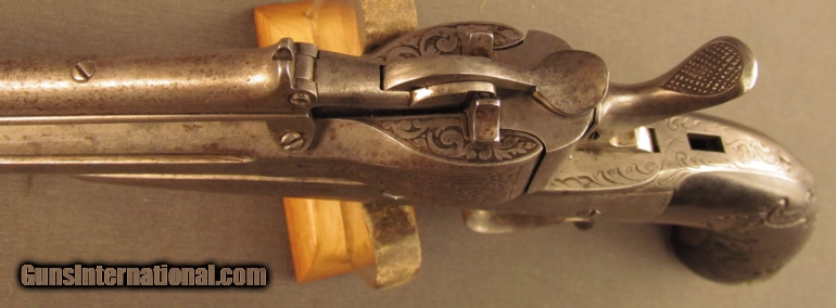 Description: Serial #2089/2191, .40 CF, 9" octagon barrel with a very good, bright bore that has some freckling and spots of mild pitting. The metal surfaces have an overall pewter gray patina with light freckling and some scattered very light handling marks from the years. The octagon barrel has milled accenting grooves along each corner and the flared breech has remnants of the original gold wash within the light scrollwork; much of the detail has now worn smooth. The frame shows some loose rococo scroll engraving on the left, right, gripstraps, and trigger guard bow while the steel gripcap has similar scroll engraving. The European walnut grip rates about very good some flattened checkering bordered by rococo scroll and floral carving accenting the checkered panels. These gravity fed magazine pistols were invented and patented by Jean Nicolas Herman who worked for Victor Collette of Liege, and doubtless manufactured them while under his employ (most known examples are "VC" marked and this one is so-marked on the underside of the barrel). The front of the magazine has a hinged trap door into which the "cartridges" are inserted. When the pistol is cocked the rising breech lines up with the magazine and a spring-loaded top lever allows a cartridge to be inserted therein. When the trigger is actuated the breech drops and the hammer falls almost simultaneously. There are some very plain and very ornate examples known; this one is a medium grade example of these very rare pistols. The sliding safety catch atop the tang is no longer present and the firing pin, which would originally have been a long and very fragile tapered spire with slight downward curve, was replaced at some point with a fairly short and squat pin. This is nevertheless, still a really nice example of one of these interesting, intricate, and very rarely encountered magazine parlor pistols. Antique SOLD Antique: Yes Manufacturer: Belgian Model: Parlor Pistol Serial Number: 2089/2191 Caliber Info: .40 Cal Gauge Info: .40 Cal |