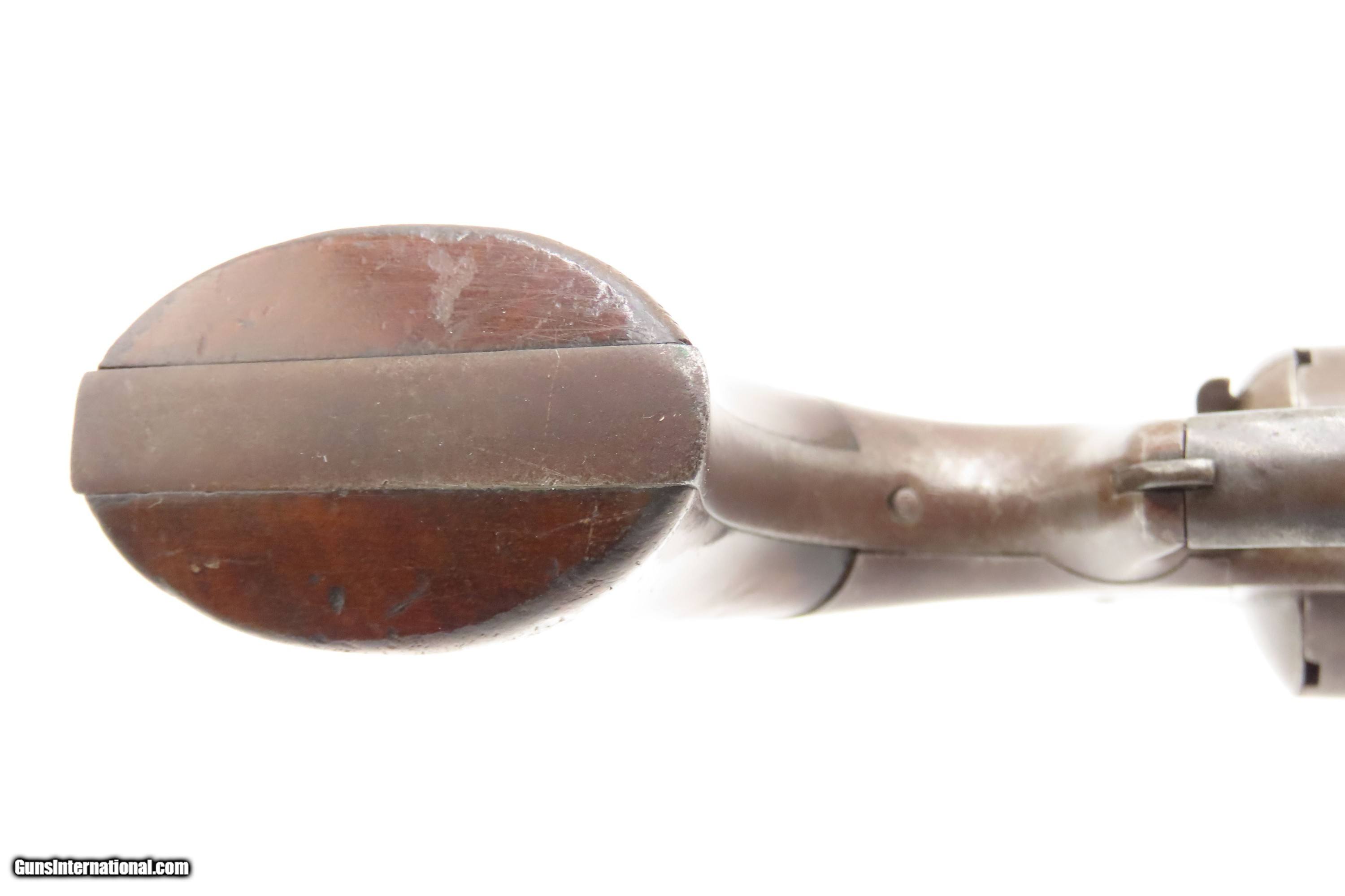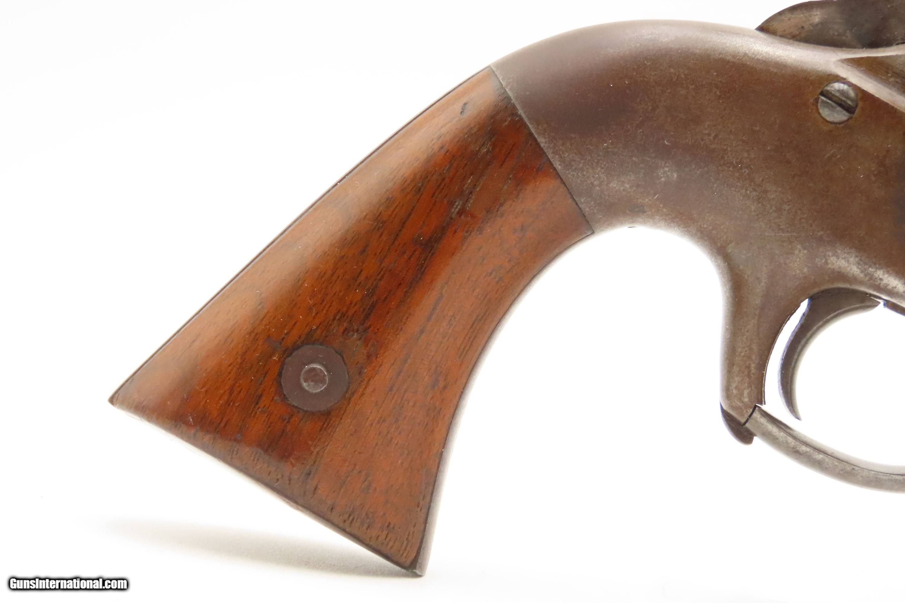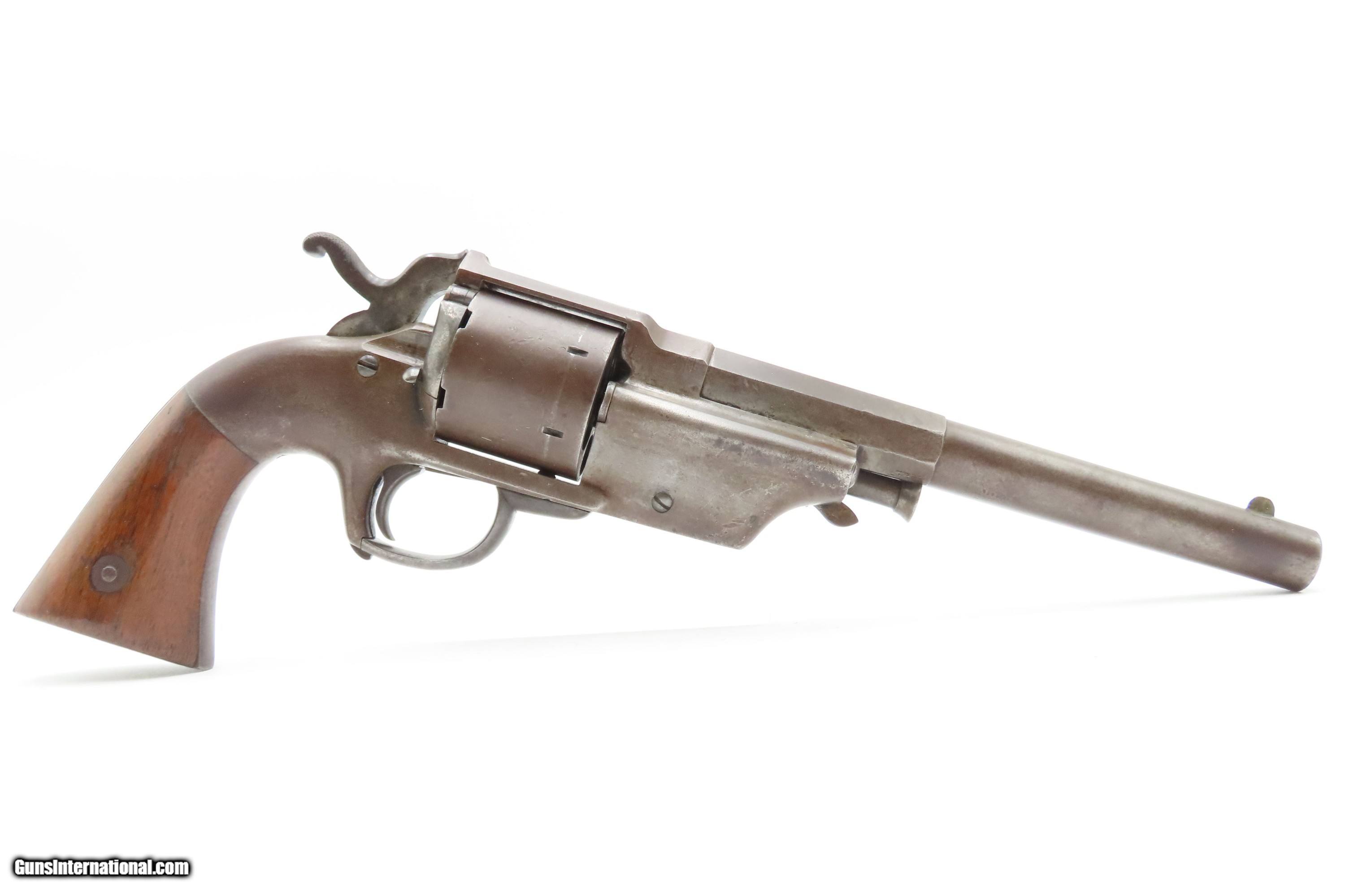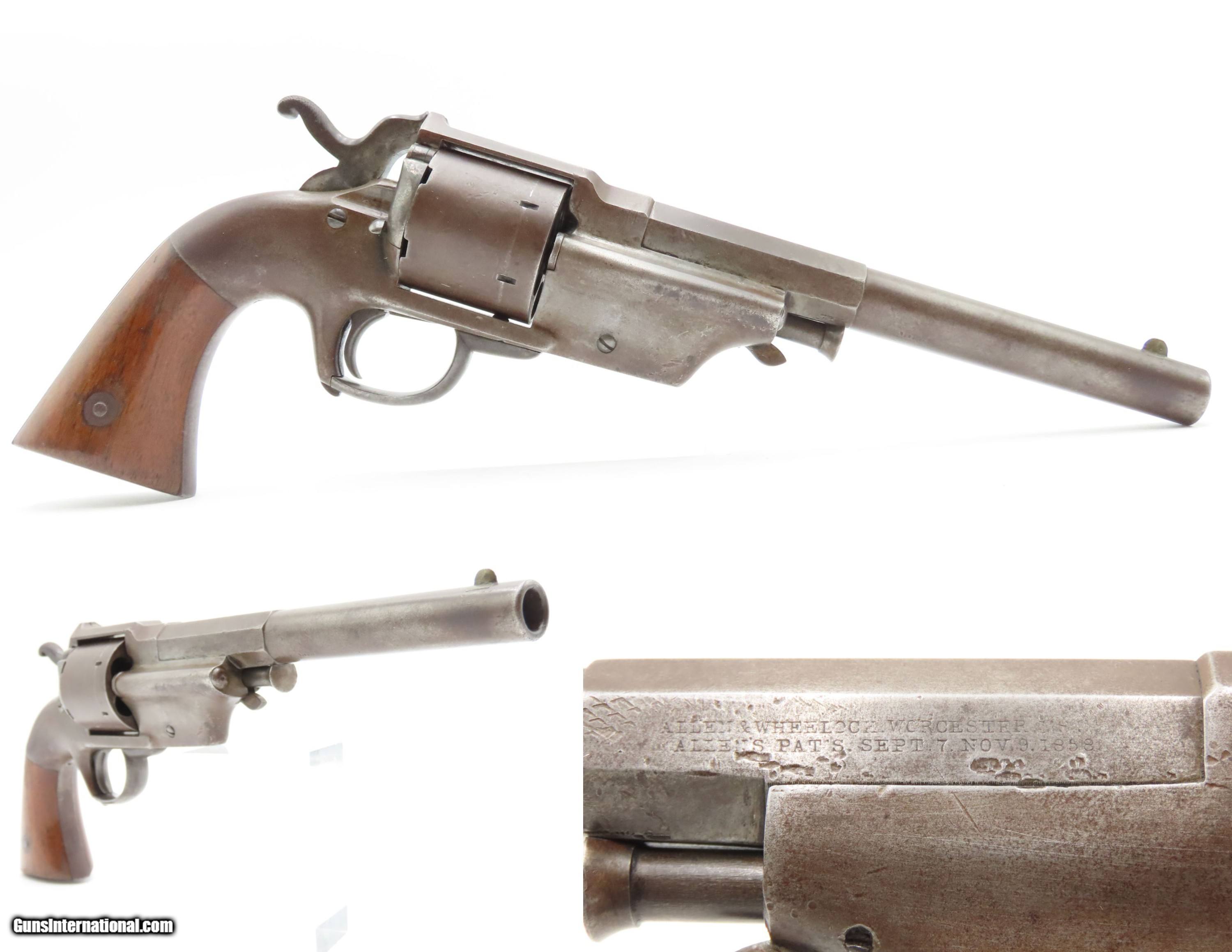 Description: RARE CIVIL WAR Antique ALLEN & WHEELOCK Center Hammer Lipfire ARMY Revolver 1 of 250 .44 Caliber LIPFIRE Revolvers Made c. 1861 Here Ancestry Guns presents a very rare antique Allen & Wheelock Center Hammer Lipfire Army Revolver, made circa 1861 in Worcester, Massachusetts, at the start of the American Civil War. These were produced in both .44 Army caliber and .36 Navy caliber. According to Flayderman, these revolvers only had a production of about 250 pieces till both Allen & Wheelock a ran into the Rollins White patent infringement. They were for the most part converted to percussion to resolve the problem. Of those 250 Lipfires manufactured, many were converted, so finding an original revolver still in Lipfire are few and far between. This Allen & Wheelock Army Revolver is a .44 caliber, six-shot, Lipfire single action revolver that had a 7-1/2” half-round and half-octagon barrel that utilized a unique ratcheting loading lever that formed the trigger guard of the revolver. The frames, cylinders and barrels of the revolvers were blued with the hammers and the combination loading lever and trigger guards color casehardened. The grips were smooth two-piece walnut that were usually varnished but appear to have been oil finished on some examples. Despite the relatively small number produced, the revolvers were manufactured in three distinct variants. The overall condition is very good. Original brown and gray patinas. The grips are very good, have been refinished, and show light handling wear. Matching visible numbers. Patent marking worn but remains legible. Excellent action. The bore is bright with sharp rifling. Here is a VERY RARE and attractive revolver from one of the 19th Century’s most prolific makers! Own the original! This is a legitimate antique and not a reproduction. Barrel is 7-1/2 inches. Caliber: .44 Lipfire Overall condition as seen in photos. Very Fast. Very Safe. FREE SHIPPING WORLDWIDE. Delivered directly to your door by express mail! Guaranteed AUTHENTIC & Includes CERTIFICATE OF AUTHENTICITY. $3500 #259337 Antique: Yes Price: $3,500.00 Buy Now Pay with