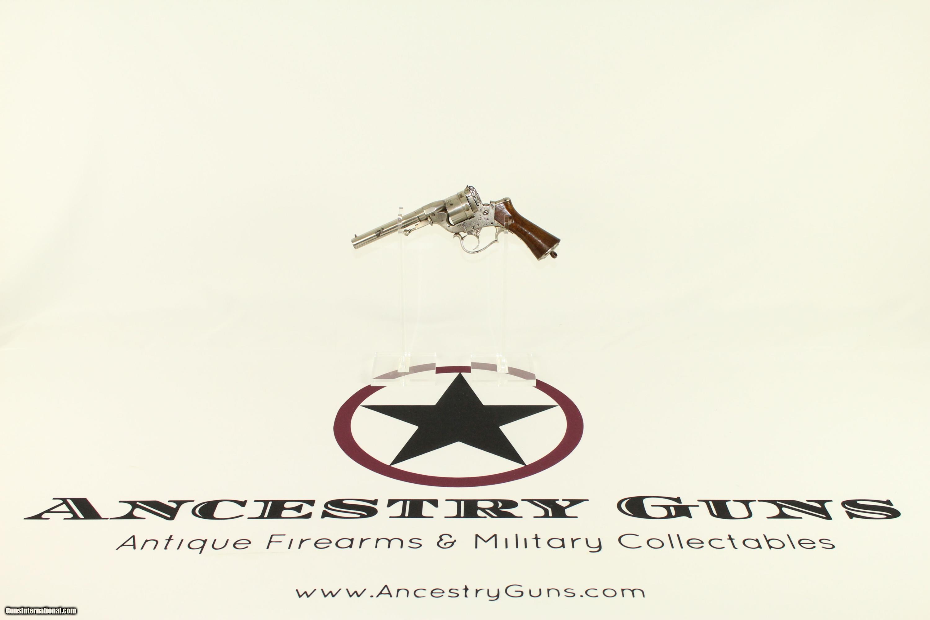 Description: Antique French Perrin Model 1859 Double Action Revolver Rare, Imported for Civil War, Low Serial Number Here we present an antique Perrin Double Action Revolver, made circa 1859 in Paris, France by L. Perrin & Cie. These are among the rarest of Civil War revolvers. The only known order was by the U.S. government for 1000 Perrins, of which only 550 are known to have been delivered by arms dealer Alexis Godillot. It is surmised that the Confederacy might have also purchased some of these, but no records remain. In addition to use during the American Civil War, France used these during the Franco-Prussian War of the early 1870s. These revolvers seemed to have specifically designed for military use, but were likely also sold to civilians. The Perrin utilized a unique, thick-rimmed, brass or copper, centerfire cartridge. The loading gate was thin, but sufficient on the right side of the gun. It was an early double action only revolver. The cartridge ejector pin acts as the cylinder axis pin and holds a rotating lug in place that would the cylinder to be removed. Those few who have gathered enough specimens to study have said that no two appear to be just alike, though they are very well made. This example is in very good overall condition. It is marked “Perrin & Cie Bte” and “Paris”. The original finish is 90% intact. The wood grip is in very good condition, with some light handling marks. The bore is fine. The action is excellent. Serial numbers match and are low at “220”. This revolver may look unwieldly, but it is actually quite comfortable. Own the original! This is a legitimate antique and not a reproduction. One other example found for $6000! Don’t miss out on a great and historical secondary U.S. martial handgun for less than half of the price. Barrel is 6 inches in length. Caliber: 12mm centerfire Bore is in very good condition and the revolver is in fantastic working order. Overall condition as seen in photos. Very Fast. Very Safe. FREE SHIPPING WORLDWIDE. Delivered directly to your door by express mail! Guaranteed AUTHENTIC & Includes CERTIFICATE OF AUTHENTICITY. ancestryguns $2500 #21574 SOLD Antique: Yes |
