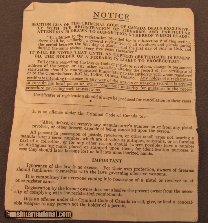 Description: Serial #*1317, .22 RF, 3 1/8” octagon barrel with a very good bore that has patches of dark freckling along its length. The revolver has an overall mottled gray patina on the barrel and cylinder while the brass frame has an overall dull ochre patina throughout with hints of verdigris around the cylinder opening. The revolver has a few traces of original white metal plating visible on the sides of the high spur hammer, and there is light-moderate damage to the frame and grip screw slots. The original walnut grips are in very good plus condition with scattered mild surface scratches and light handling marks on either side. The lock-up is still tight and the revolver is mechanically excellent. Included with the revolver is an original March 23, 1947 dated RCMP handgun registration certificate that lists the owner as Ms. Margaret Seeley of Dingwall, Victoria County, Nova Scotia. The gun is listed by serial number and is described as a “Keepsake” on the form. Antique SOLD Antique: Yes Manufacturer: Prescott Model: Pocket Revolver Serial Number: *1317 Caliber Info: .22 Gauge Info: .22 |