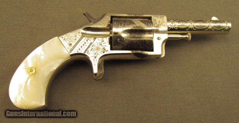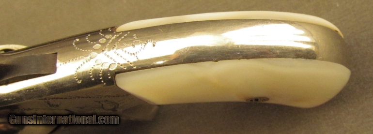 Description: S# 2749, 38 long rimfire, 3 inch barrel, very good bore with a few scattered areas of erosion. This little revolver was built from 1873-1887 and it remains in very good condition with 80% brilliant nickel finish showing loss on top strap, cylinder, barrel, and bottom of frame. Revolver has near full coverage punch dot engraving with lovely red inlays. Tow birds show on left side of frame, The Mother of Pearl grips fit well, right side shows an old crack by escution. Right grip is pencil numbered to gun. A really fine example that suffers from poor care and storage. Antique SOLD Manufacturer: Iver Johnson Model: Tycoon Caliber Info: .38RF Gauge Info: .38RF |