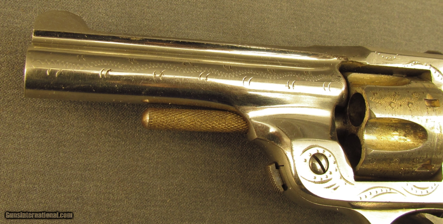 Description: Serial #15509, .32 S&W, 3 1/8" barrel with a fair bore that has dark freckling within the grooves. This is an interesting revolver, very close in appearance with many of the other pocket revolvers of the day but instead has a solid frame with thumb switch safety mounted on the frame knuckle. The revolver retains 95 - 97% of the original nickel with remnants of the original gold wash in the cylinder flutes and on the cylinder pin / ejector. Traces of the original blue remain on the trigger and top - mounted cylinder lock with the balance turned to a dark plum - brown color. The frame has Merwin Hulbert style line and punch dot engraving with some darker underlying metal visible on the edges where the nickel has flaked slightly. The checkered hard rubber grips are in excellent shape with a very attractive pattern and very little wear or flattening of the points evident. The mechanics are fully functional and the revolver is housed in the original two - piece blue box with "Gold Plated Engraved" surcharge on the end label. This is a great looking and unusual pocket revolver that is in excellent overall condition; a seldom seen high grade Maltby. Antique SOLD Antique: Yes Manufacturer: Maltby Henley & Co. Model: 1894 Serial Number: 15509 Caliber Info: .32 S&W Gauge Info: .32 S&W |