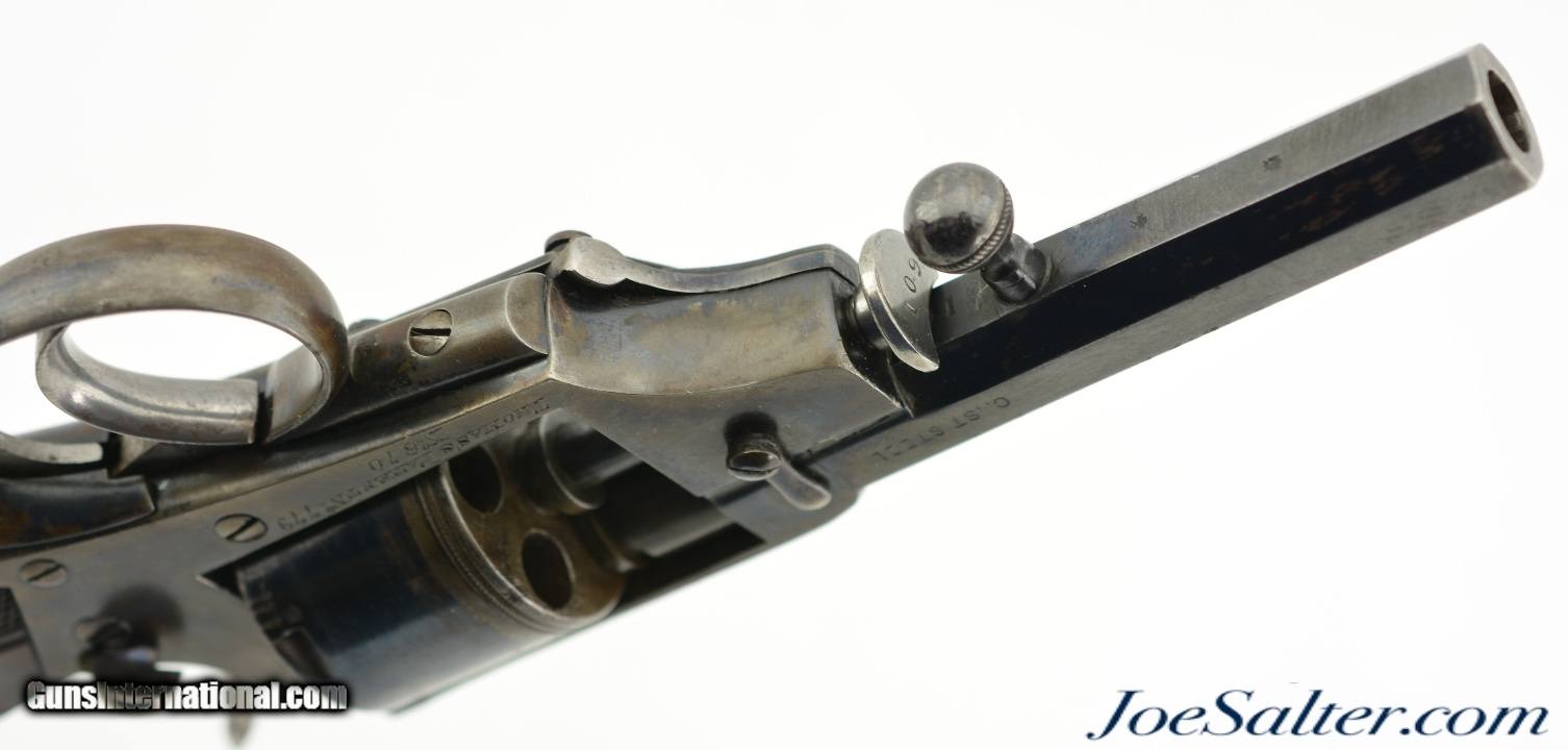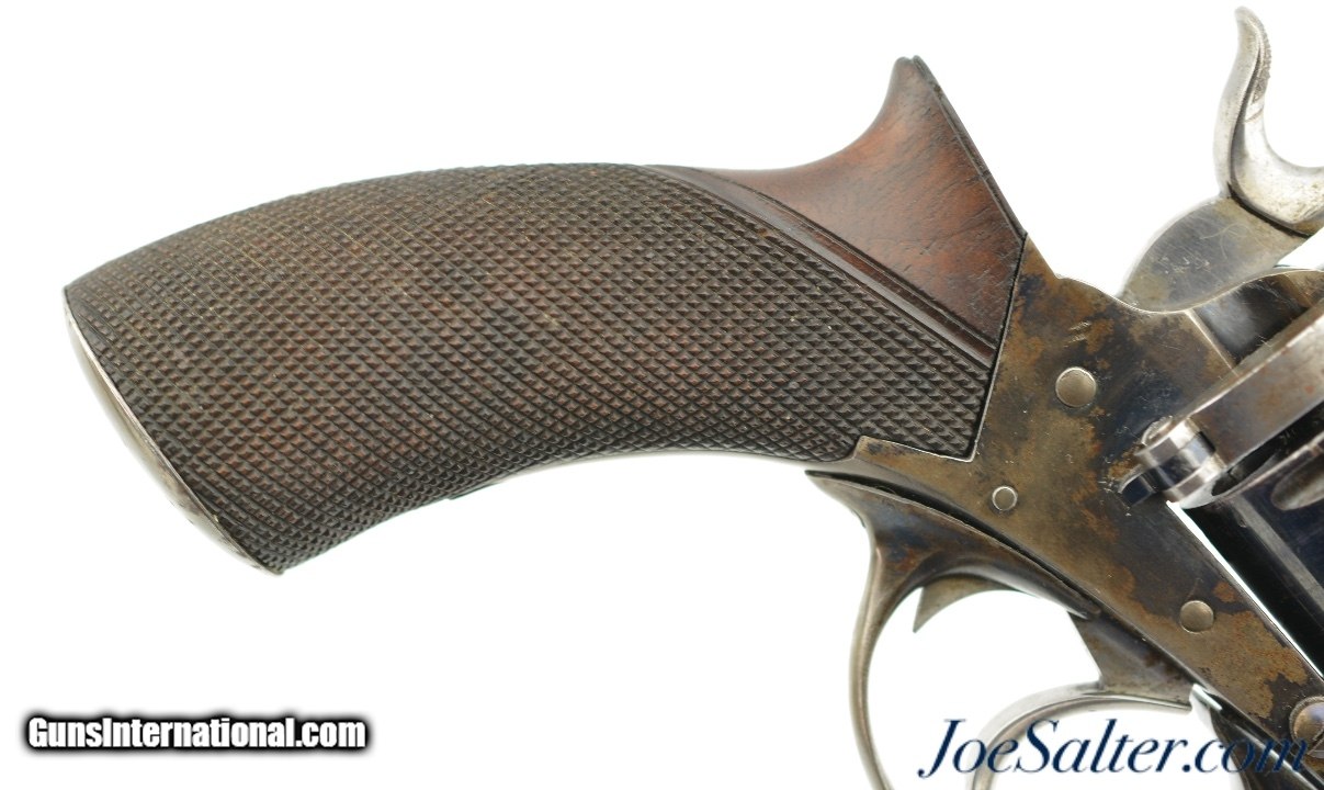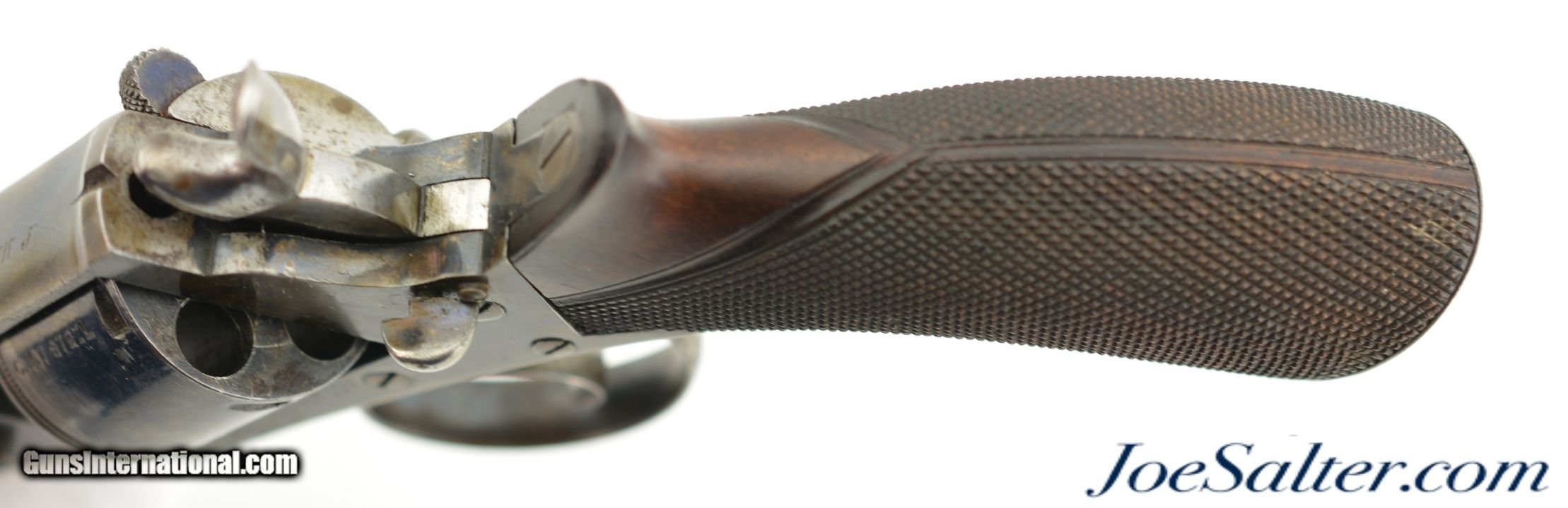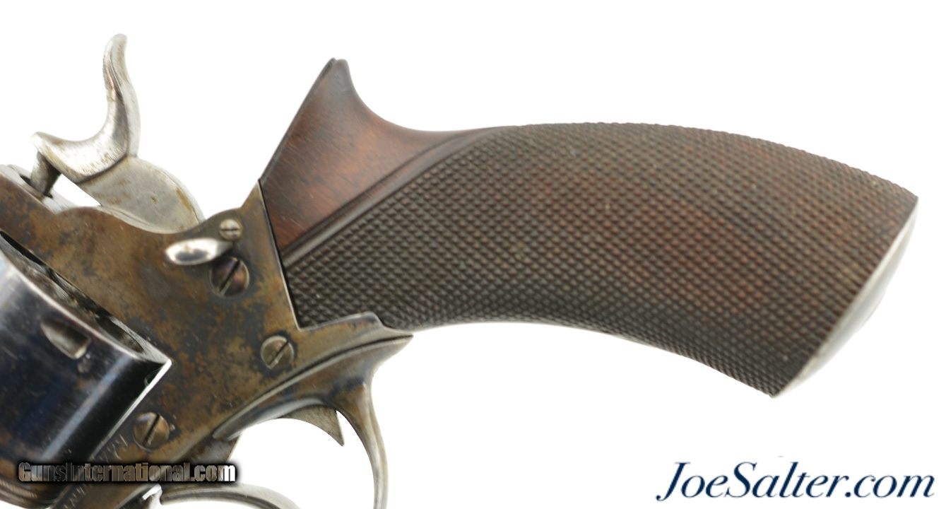 Description: Serial #670, .320 CF, 4" octagon barrel with a very good bore that has light-moderate freckling within the grooves. This is a "P. HAST. COLCHESTER" marked revolver that retains 70-75% of the original bright blue on the barrel and cylinder, with some fading and silvering along the raised edges of the barrel facets and the cylinder faces. The frame has a mottled patina with traces of original color case-hardening still visible, and the hammer and trigger retain some of the original armory bright finish. The checkered walnut grip has a pronounced saw-handle profile, and is in very good-fine shape with a few light handling marks, and some mild flattening of the points. The lock-up is tight, and the action functions flawlessly. This is the Tipping & Lawden Self-Extracting design which has a separate barrel that rotates and pulls away from the fixed extractor. It was made by Philip Hast, who was a Colchester gunmaker in the mid-late 19th century. This is a fine-example of a rarely seen British revolver, with a fascinating and complicated design. Antique SOLD Antique: Yes |