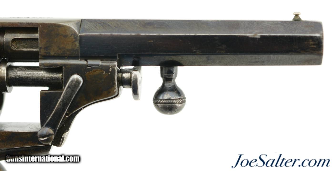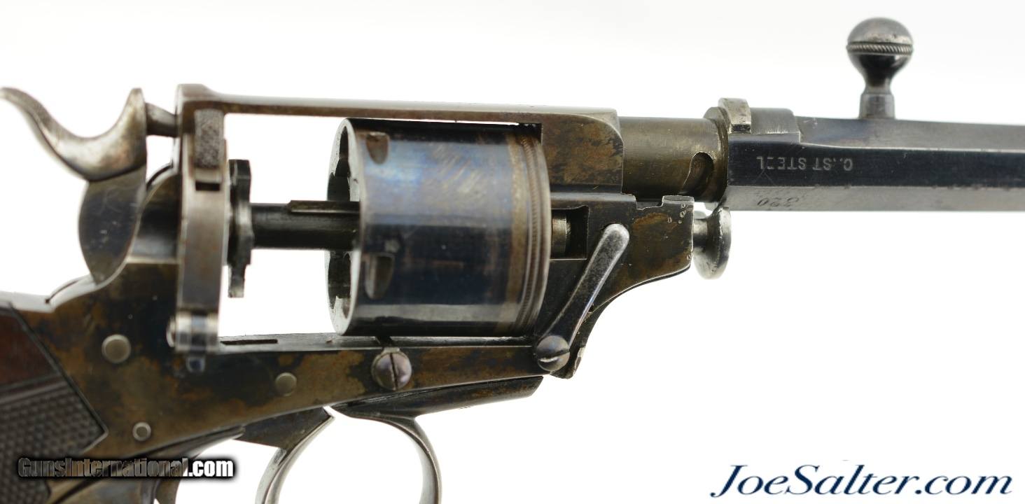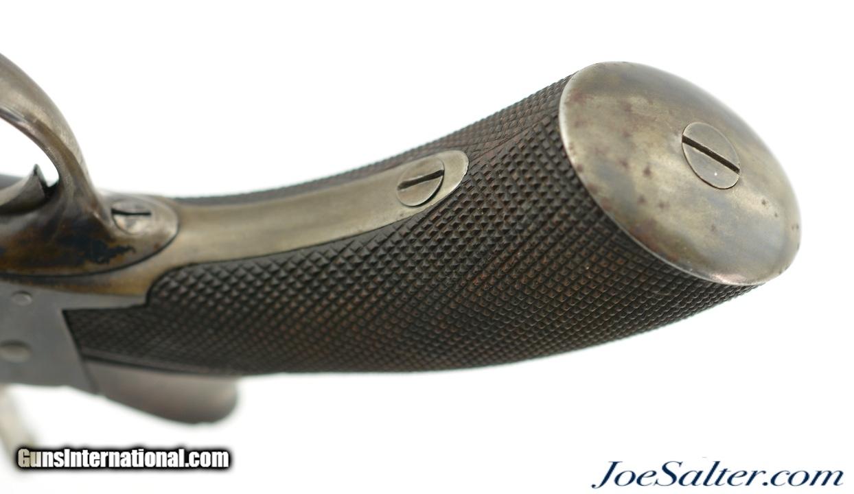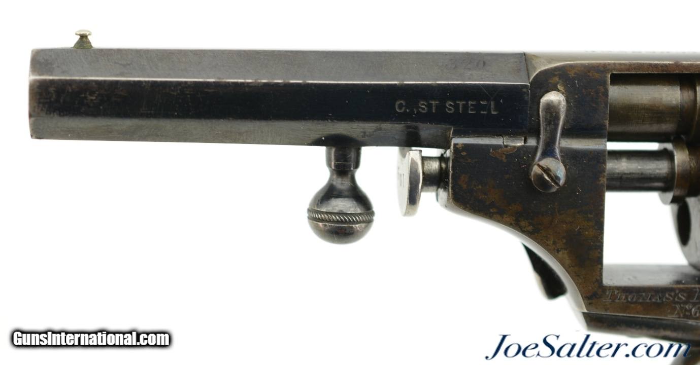 Description: Serial #670, .320 CF, 4" octagon barrel with a very good bore that has light-moderate freckling within the grooves. This is a "P. HAST. COLCHESTER" marked revolver that retains 70-75% of the original bright blue on the barrel and cylinder, with some fading and silvering along the raised edges of the barrel facets and the cylinder faces. The frame has a mottled patina with traces of original color case-hardening still visible, and the hammer and trigger retain some of the original armory bright finish. The checkered walnut grip has a pronounced saw-handle profile, and is in very good-fine shape with a few light handling marks, and some mild flattening of the points. The lock-up is tight, and the action functions flawlessly. This is the Tipping & Lawden Self-Extracting design which has a separate barrel that rotates and pulls away from the fixed extractor. It was made by Philip Hast, who was a Colchester gunmaker in the mid-late 19th century. This is a fine-example of a rarely seen British revolver, with a fascinating and complicated design. Antique SOLD Antique: Yes |