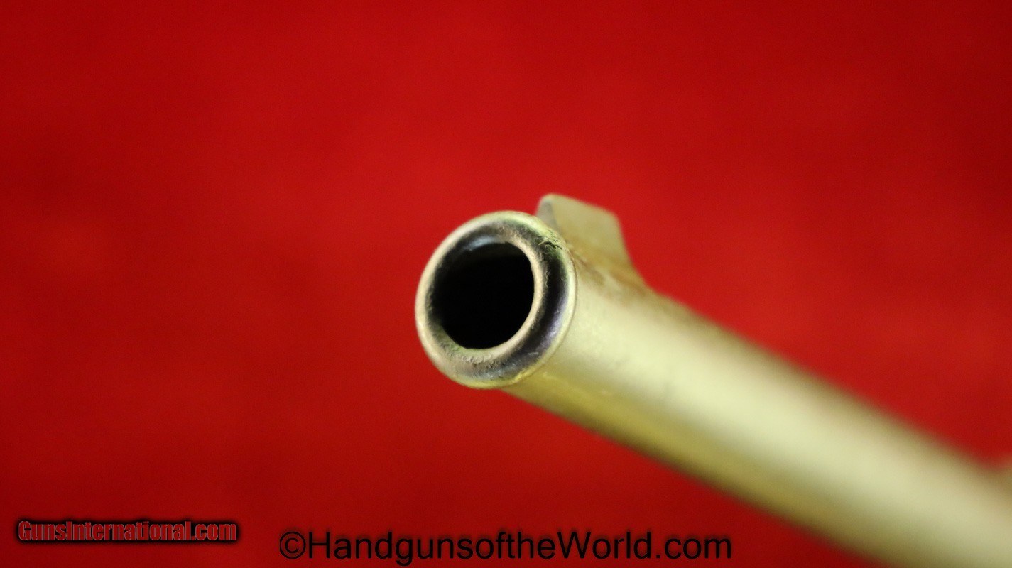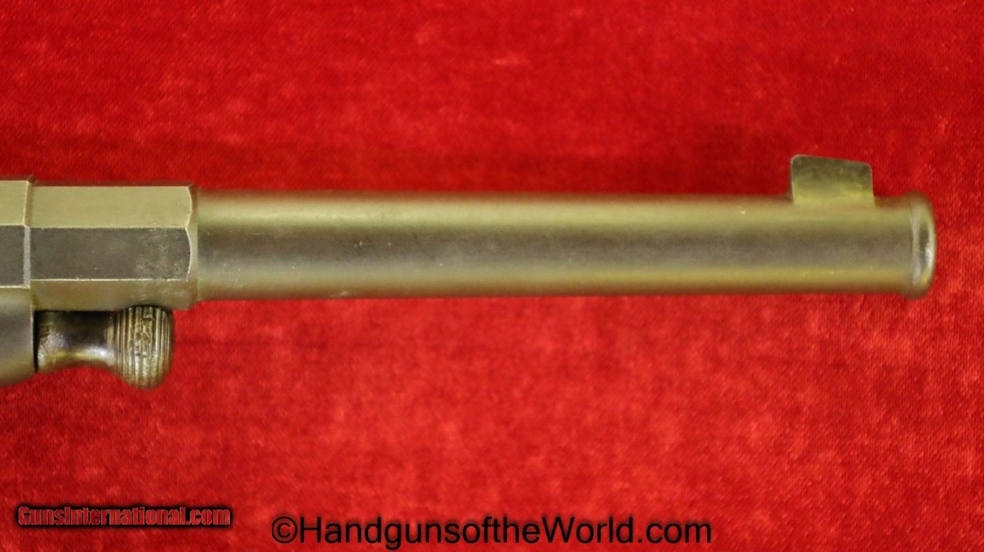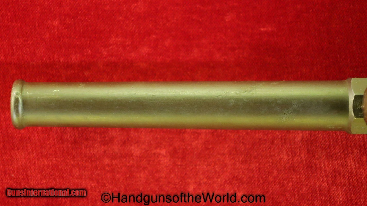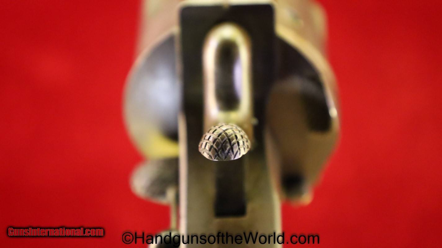 Description: Reich revolver, 10.6mm. Built by Dreyse and dated 1882 under the broke cylinder pin retainer. This has the proper smooth walnut grips, and is Division marked B.2.A.E.214 on the butt. The cylinder pin is from a different gun. This has a pleasing patina overall and a VG+ Bore. Antique. Antique: Yes Handgun Caliber: 10.6×25mmR German Ordnance Manufacturer: Dreyse Model: Reich Price: $1,250.00 Shipping: $35.00 Contact Seller |
