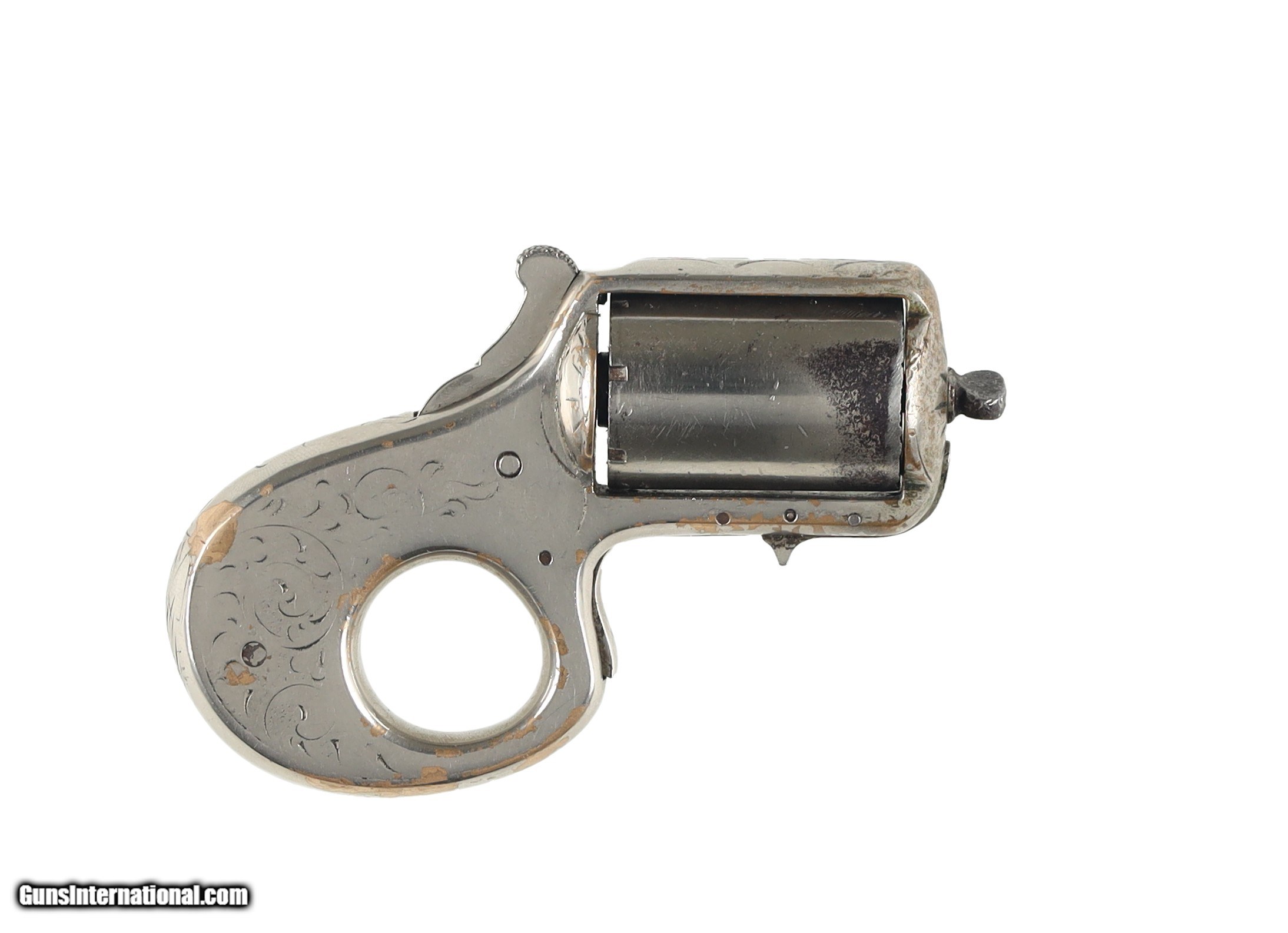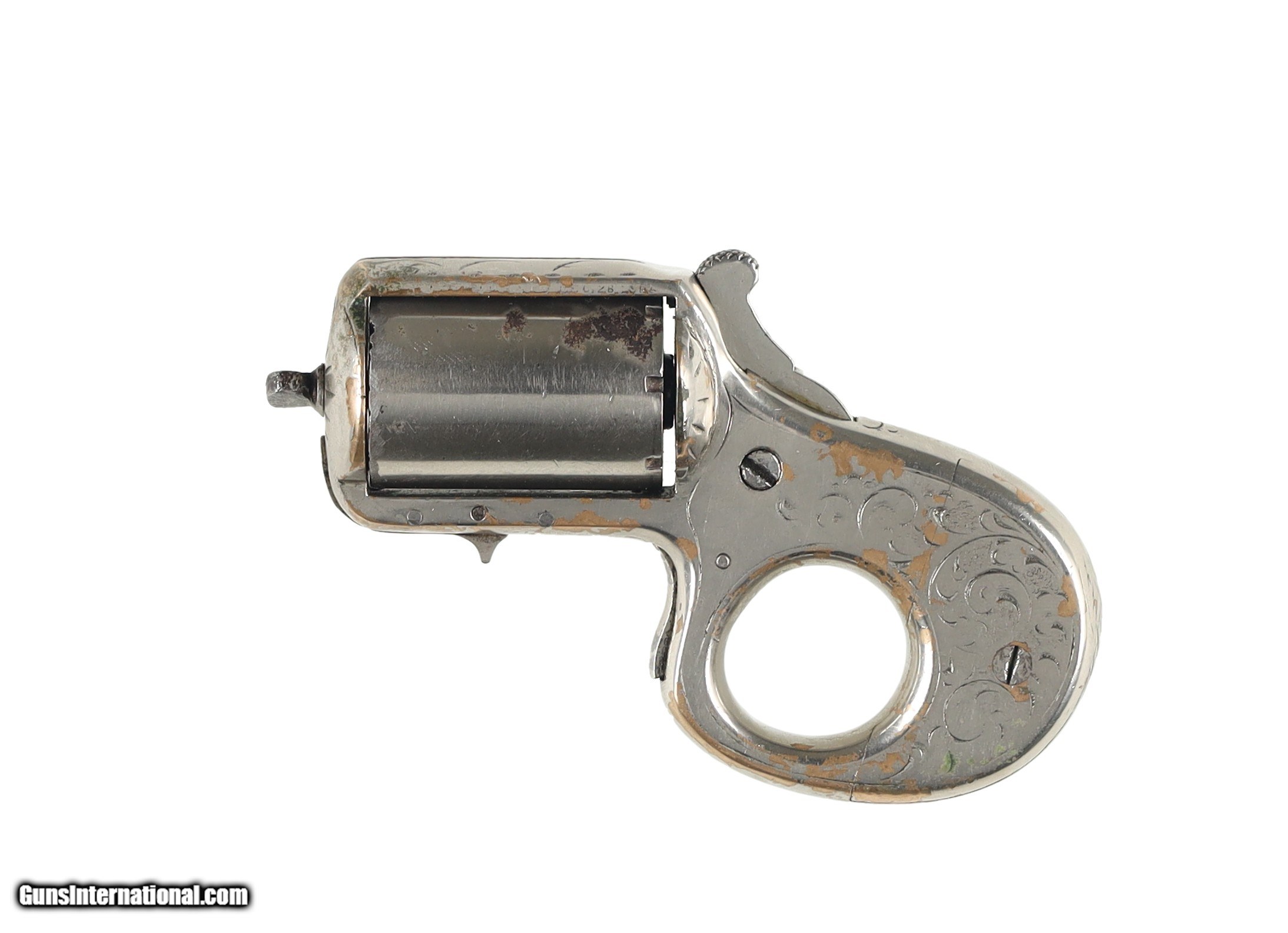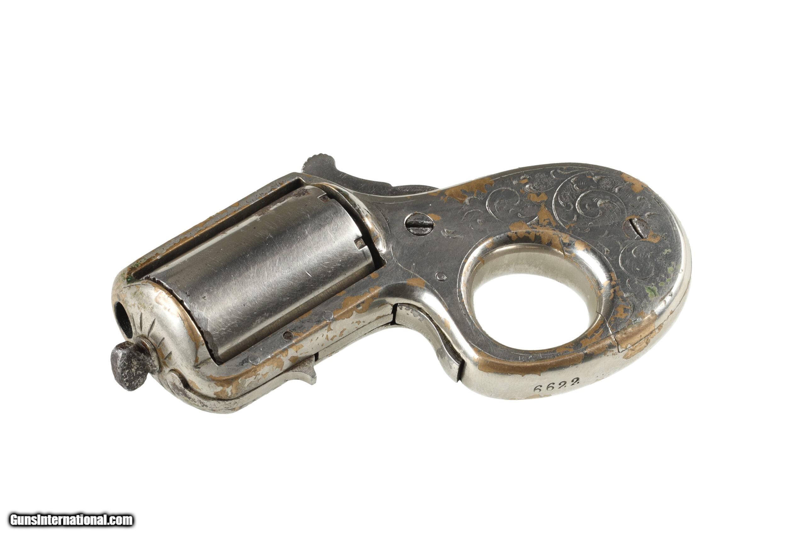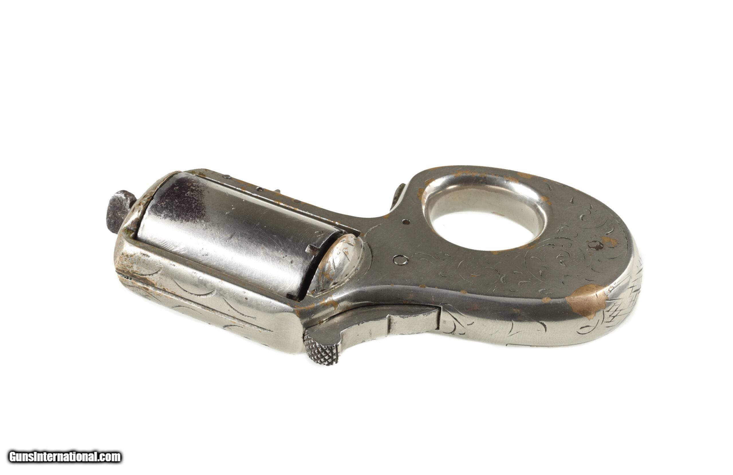 Description: The Ried "My Friend" Knuckle Duster was, at the time, an innovative design, incorporating a 7 shot .22 caliber revolver with the bludgeoning features of a knuckle duster. The sentiment of Mr. Ried behind these design features was "Never shoot a man if you can knock him down". The overall condition of this example is fair to good, looking to have possibly been replated at some point in the past, as the plating looks somewhat too thick to be the original silver plating. The mechanics also appear to have been worn down by time, as it doesn't quite cycle properly. Manufactured in: USA Action Finish: Nickel Plated Barrel Length: 1.5" Barrel Condition: Fair Manufacturer: Reid Model: My Friend" Knuckle Duster Caliber Info: .22 Short Condition: Preowned Metal Condition: Good Action: Revolver Triggers: Single Weight: .6 lbs Case: NONE Price: $2,000.00 Contact Seller |