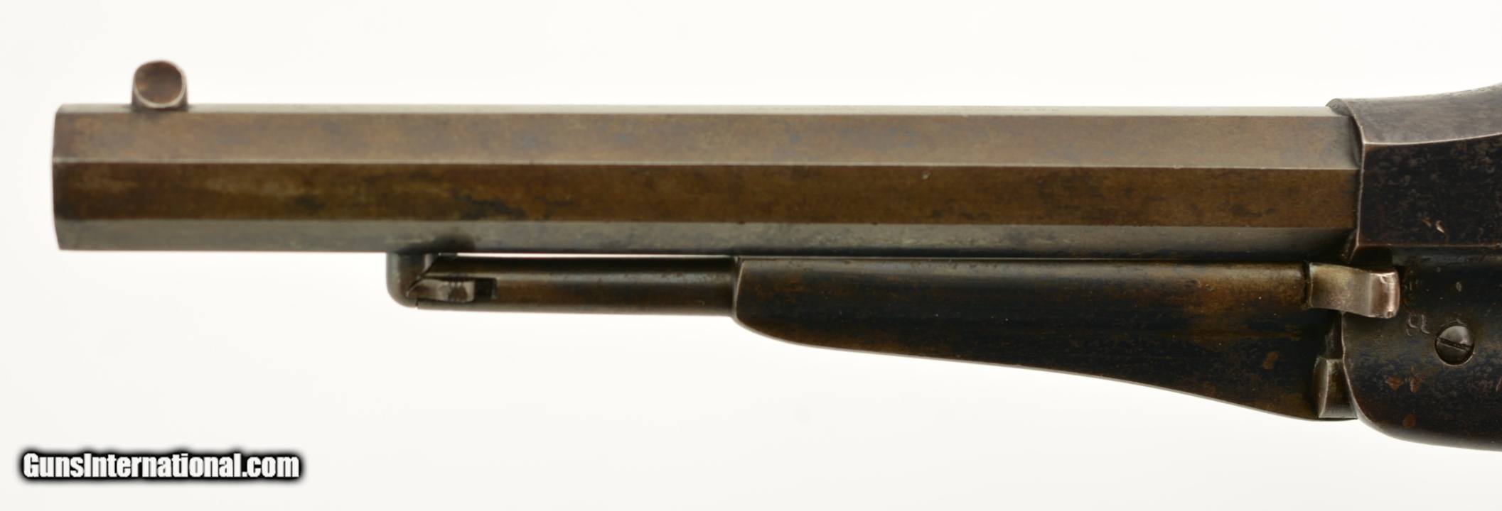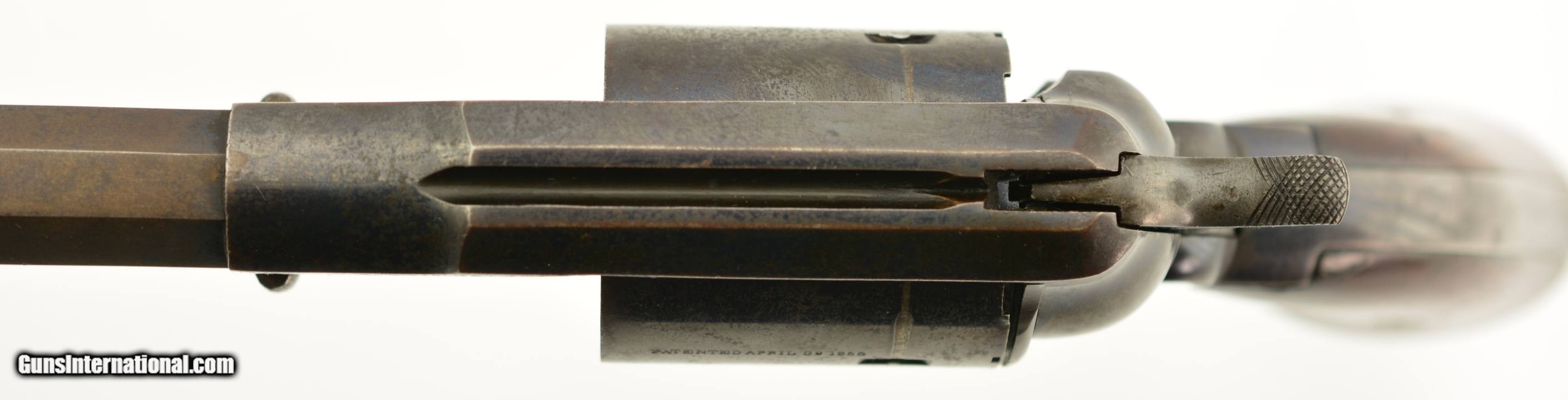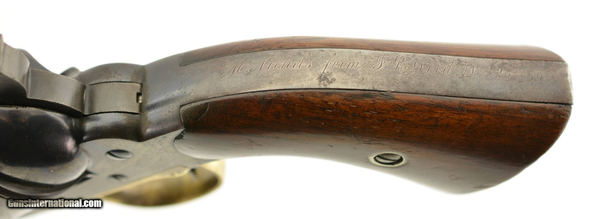 Description: Serial #85158, .46 RF, 8" octagon barrel with a very good, lightly freckled bore. This is an extremely handsome, Rollin White license-converted revolver that retains 75-80% of the original dark blue finish with the balance worn to a mixture of plum-brown and pewter gray. Specks of mild surface oxidation are present as well. The Rollin White patent marking on the cylinder is still sharp and crisp: "PATENTED APRIL 3D. 1855," as are the Remington markings on the top of the barrel, and conversion number on the bottom just ahead of the loading lever catch: "412." The brass trigger guard has a mostly bright yellow-ochre patina, and the walnut grips are in very good-fine shape, with scattered handling marks and minor blemishes in the oil finish. A Christmas presentation is engraved in flowing script along the backstrap: "M. Nichols from F.R. Lord, Dec. 25, 1869." Under an 1868 contract between Remington and Smith & Wesson, Remington was given the rights to convert 4,575 .44 New Model Army revolvers to .46 RF under Rollin White’s patent. Smith & Wesson was paid $1.00 per converted gun in royalties with distribution of 31 examples to M.W. Robinson of New York City, 400 to J.W. Storrs (S&W’s New York Agent), and the bulk of the run; 4,141 revolvers, to B.K. Kittredge & Co. of Cincinnati, Ohio. This example is in exceptionally fine condition, and would make a splendid addition to any collection of early American big bore cartridge revolvers. Antique SOLD Antique: Yes |