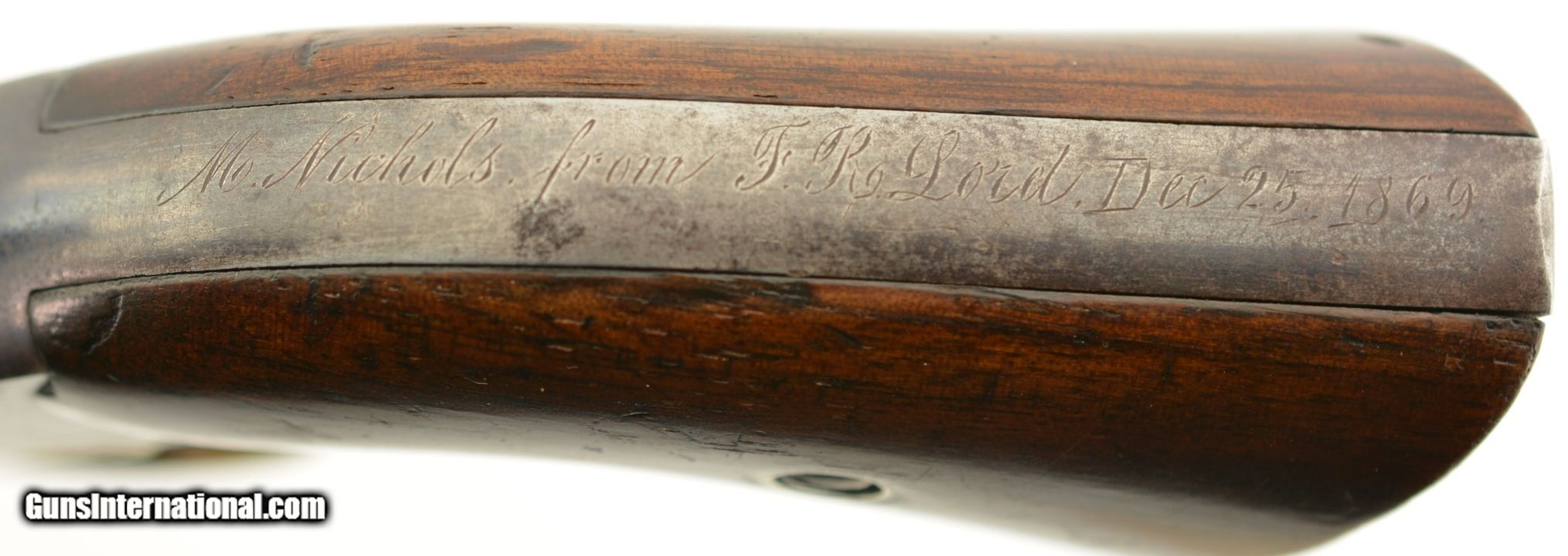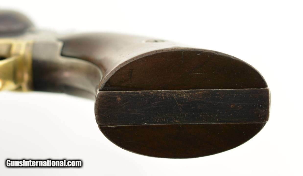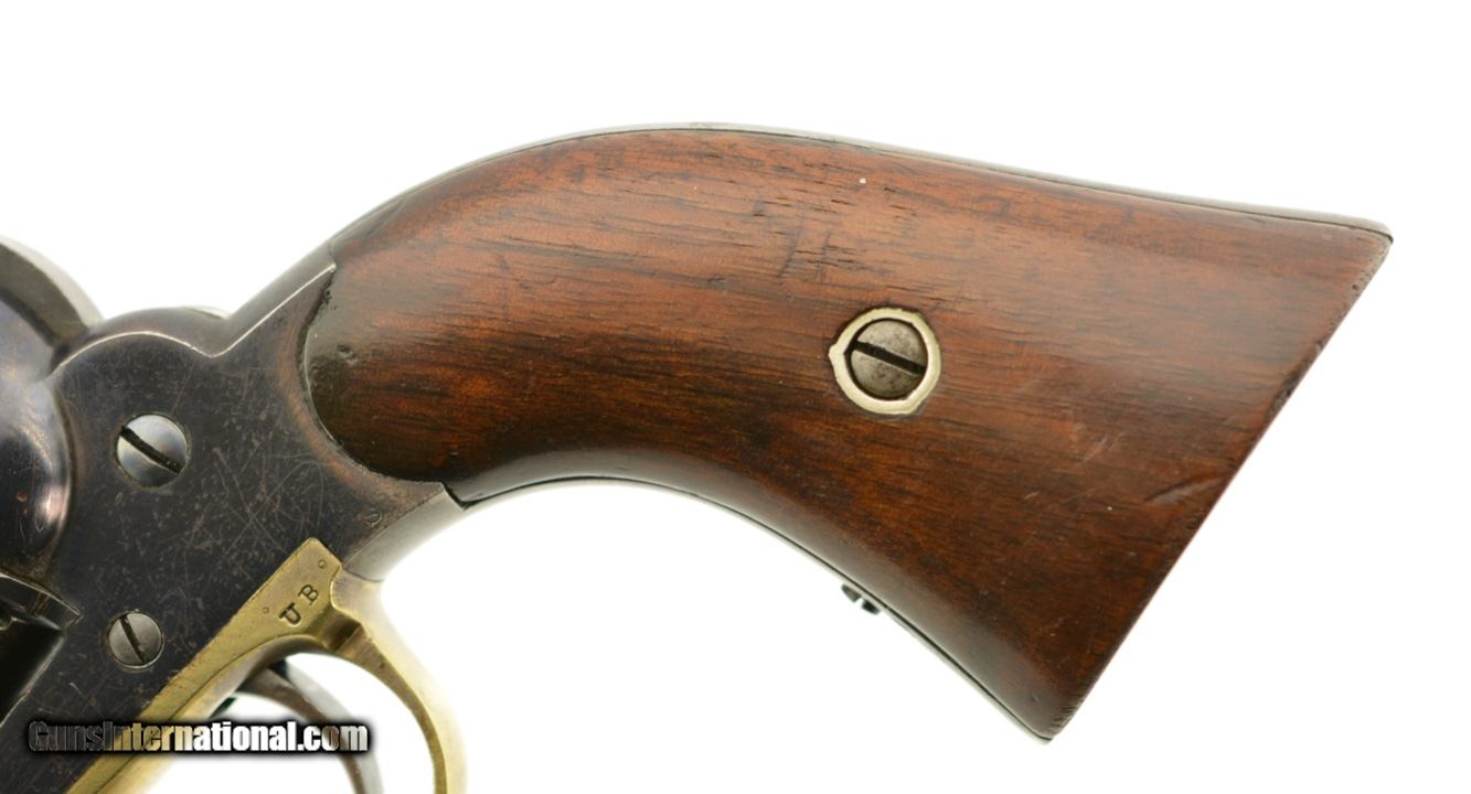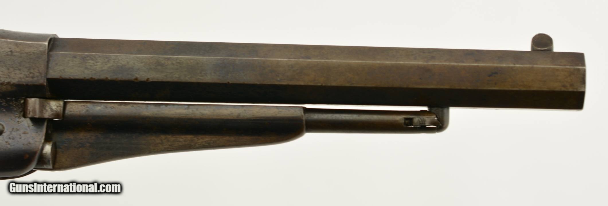 Description: Serial #85158, .46 RF, 8" octagon barrel with a very good, lightly freckled bore. This is an extremely handsome, Rollin White license-converted revolver that retains 75-80% of the original dark blue finish with the balance worn to a mixture of plum-brown and pewter gray. Specks of mild surface oxidation are present as well. The Rollin White patent marking on the cylinder is still sharp and crisp: "PATENTED APRIL 3D. 1855," as are the Remington markings on the top of the barrel, and conversion number on the bottom just ahead of the loading lever catch: "412." The brass trigger guard has a mostly bright yellow-ochre patina, and the walnut grips are in very good-fine shape, with scattered handling marks and minor blemishes in the oil finish. A Christmas presentation is engraved in flowing script along the backstrap: "M. Nichols from F.R. Lord, Dec. 25, 1869." Under an 1868 contract between Remington and Smith & Wesson, Remington was given the rights to convert 4,575 .44 New Model Army revolvers to .46 RF under Rollin White’s patent. Smith & Wesson was paid $1.00 per converted gun in royalties with distribution of 31 examples to M.W. Robinson of New York City, 400 to J.W. Storrs (S&W’s New York Agent), and the bulk of the run; 4,141 revolvers, to B.K. Kittredge & Co. of Cincinnati, Ohio. This example is in exceptionally fine condition, and would make a splendid addition to any collection of early American big bore cartridge revolvers. Antique SOLD Antique: Yes |