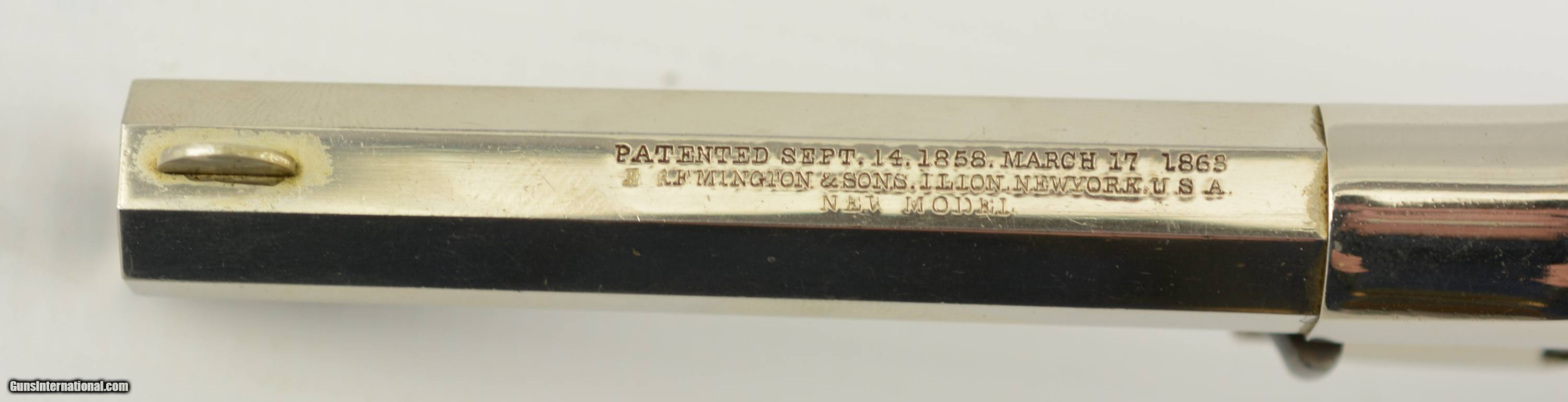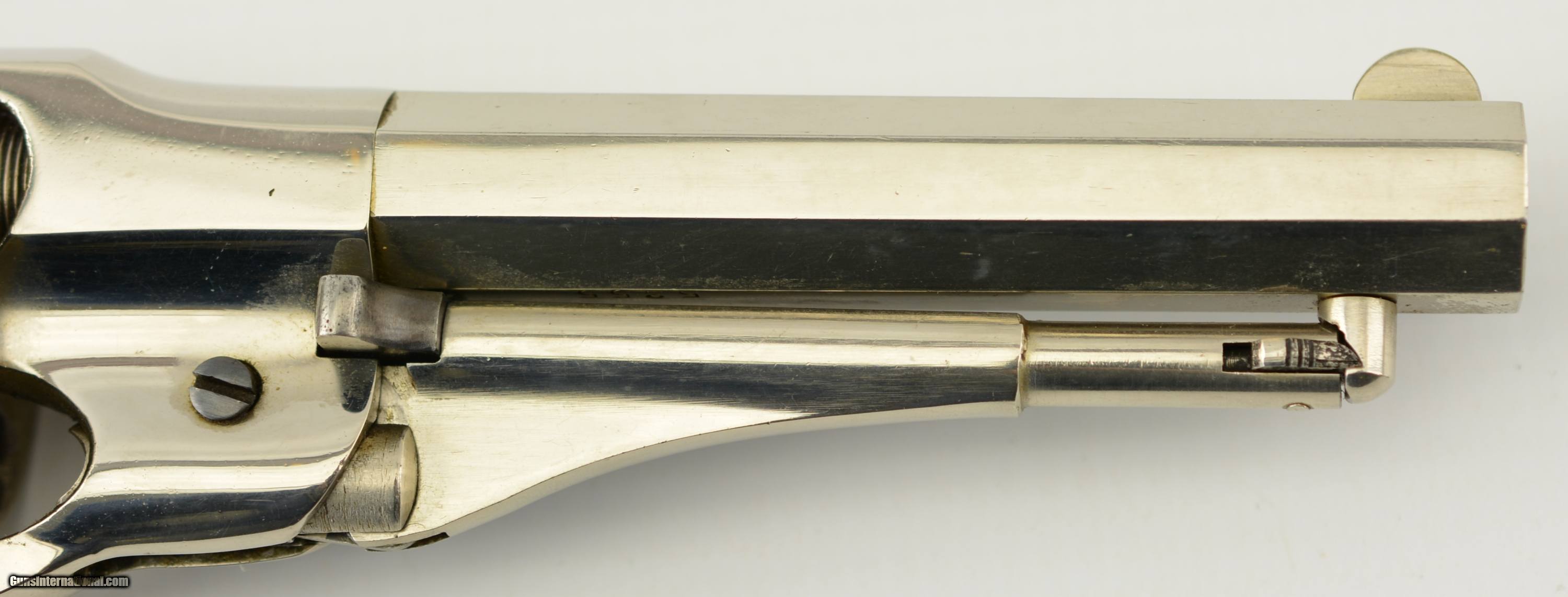 Description: Serial #3480 (Conversion #209), .38 RF, 4 1/2" octagon barrel with a very good, lightly freckled bore. This is a very nice little Remington conversion that has matching conversion numbers on the two-piece cylinder, and mismatched numbers on the frame and barrel (3480 and 5255 respectively). The metal retains 98-99% of a mixed original (on the barrel and cylinder), and re-nickel finish that has flaked in some spots and also exhibits spots of dark freckling, heaviest around the exterior of the cylinder and on the gripstraps which have visible dark underlying metal. The walnut grips are in fine condition with scattered minor handling marks and light blemishes, and the lock-up is still tight with good timing and an fully functional action. This is a very good plus, small frame Remington cartridge conversion and would make a great addition to any collection. Antique SOLD Antique: Yes Manufacturer: Remington Model: New Model Police Serial Number: 3480 Caliber Info: .38RF Gauge Info: .38RF |
