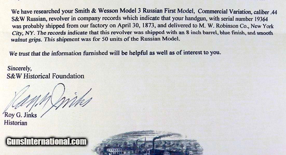 Description: PENDING>> The "Old Old Model Russian" was developed for the Russian Government in 1871 and is the same design as the Model 3 American, except it was designed to fire the .44 S&W Russian cartridge. >>> (with copy of the historical foundation letter) >>>This revolver, is a "Commercial First Model Russian". The revolver is mostly a soft gray patina with blue in the protected areas. The gun indexes, ejects and fires perfectly. All matching barrel, cylinder, and latch. The grips are numbered to another S&W. In very good overall condition. Antique, made and shipped from the Smith & Wesson Factory in 1873. SOLD Antique: Yes |