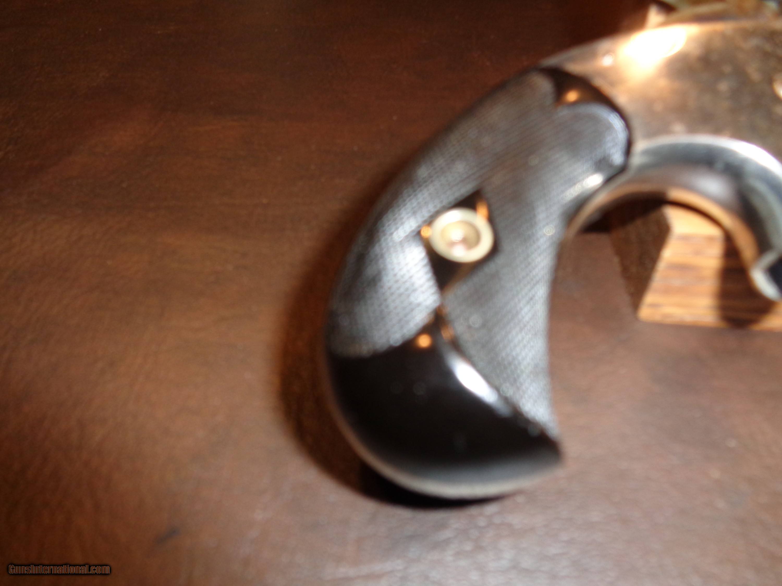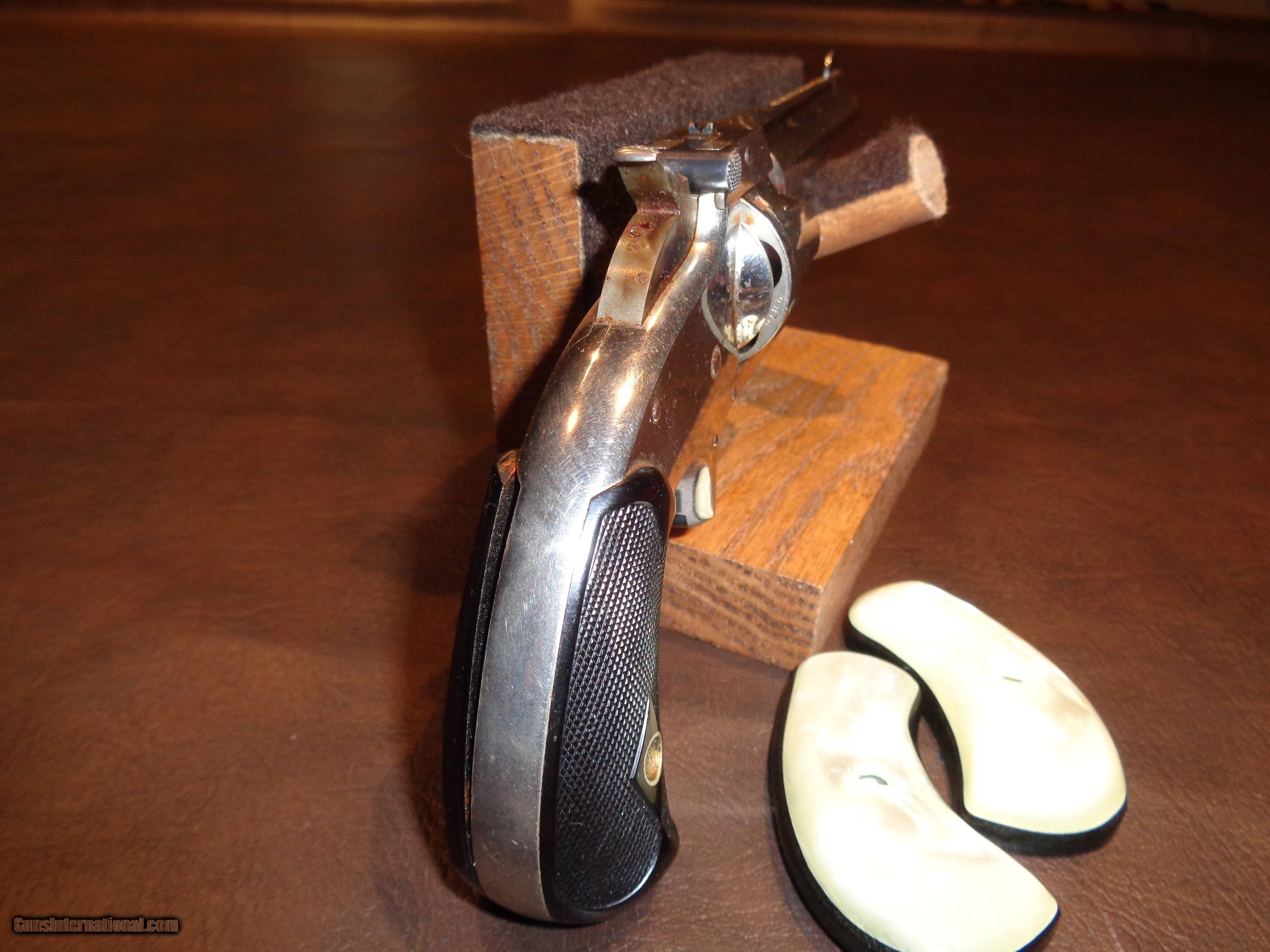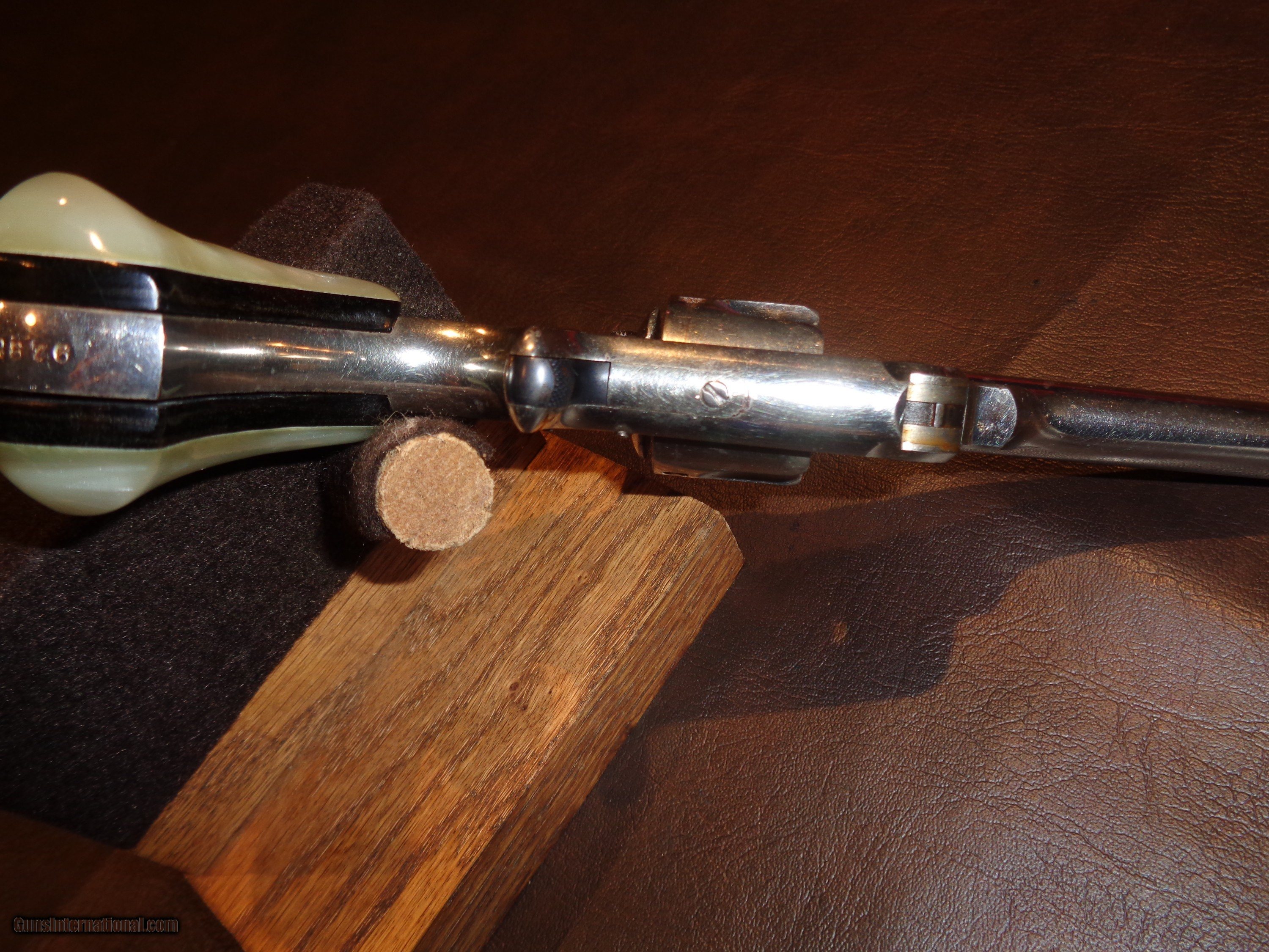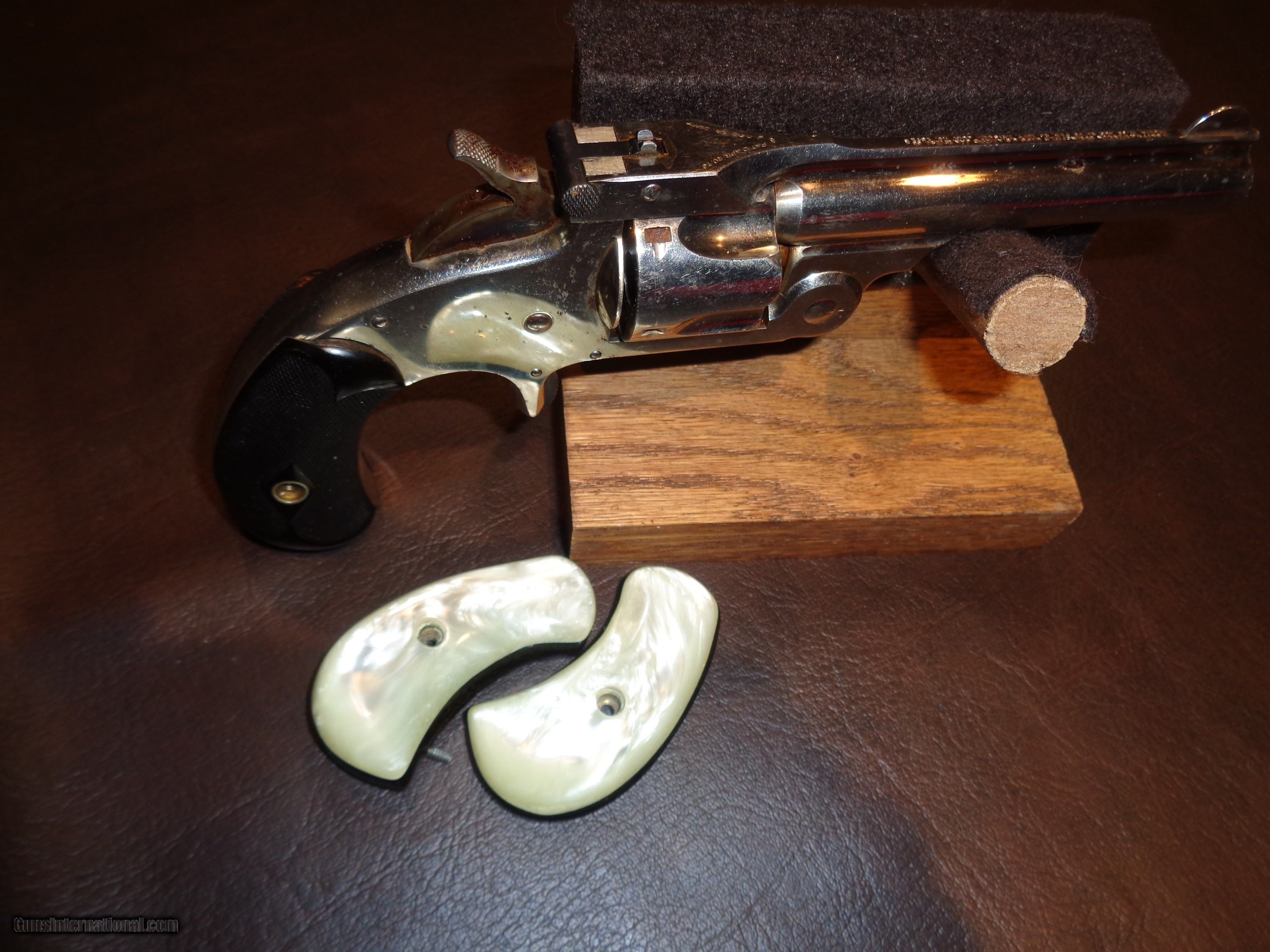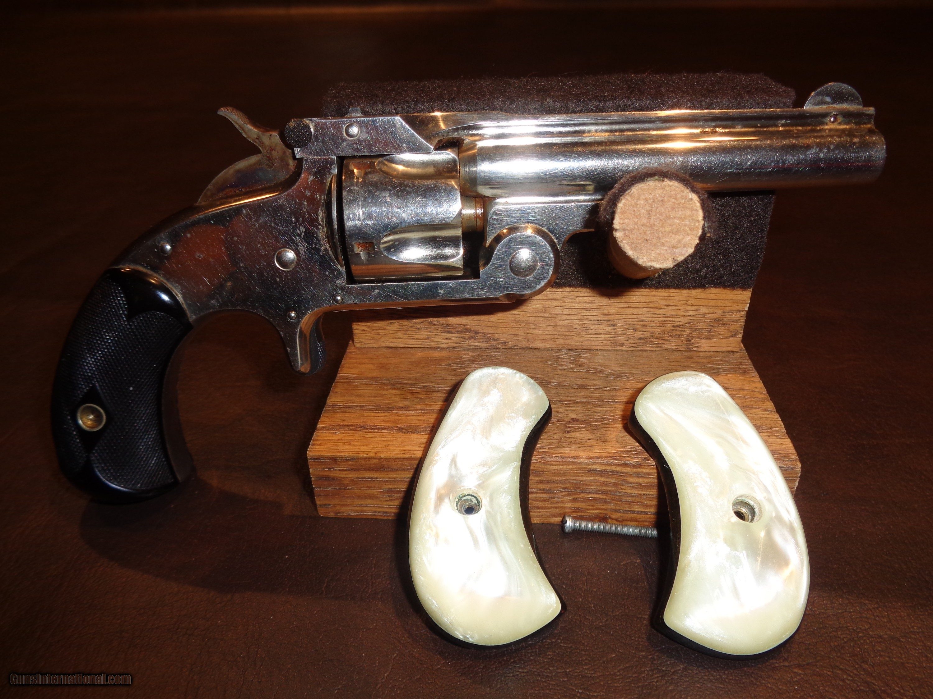 Description: S&W Model 1 1/2 .32 Centerfire Revolver made in 1878, with a 3 1/2" round barrel, 5 shot fluted cylinder, and checkered wood birdshead grips. This revolver was very popular in the era for personal defense and concealed carry because of its size, reliability, caliber and its rebounding hammer which allowed it to be carried when fully loaded - and it is an early 1st year production of the 97,574 revolvers S&W would make from 1878 thru 1892. The bore and cylinder are in mint condition, the mechanics are excellent, and it has 95+% of its nickel finish remaining - excellent overall condition! This revolver is an antique and requires only proof of being over 21 years of age to purchase. Shipping is $25. SOLD Antique: Yes Handgun Caliber: .32 S&W |