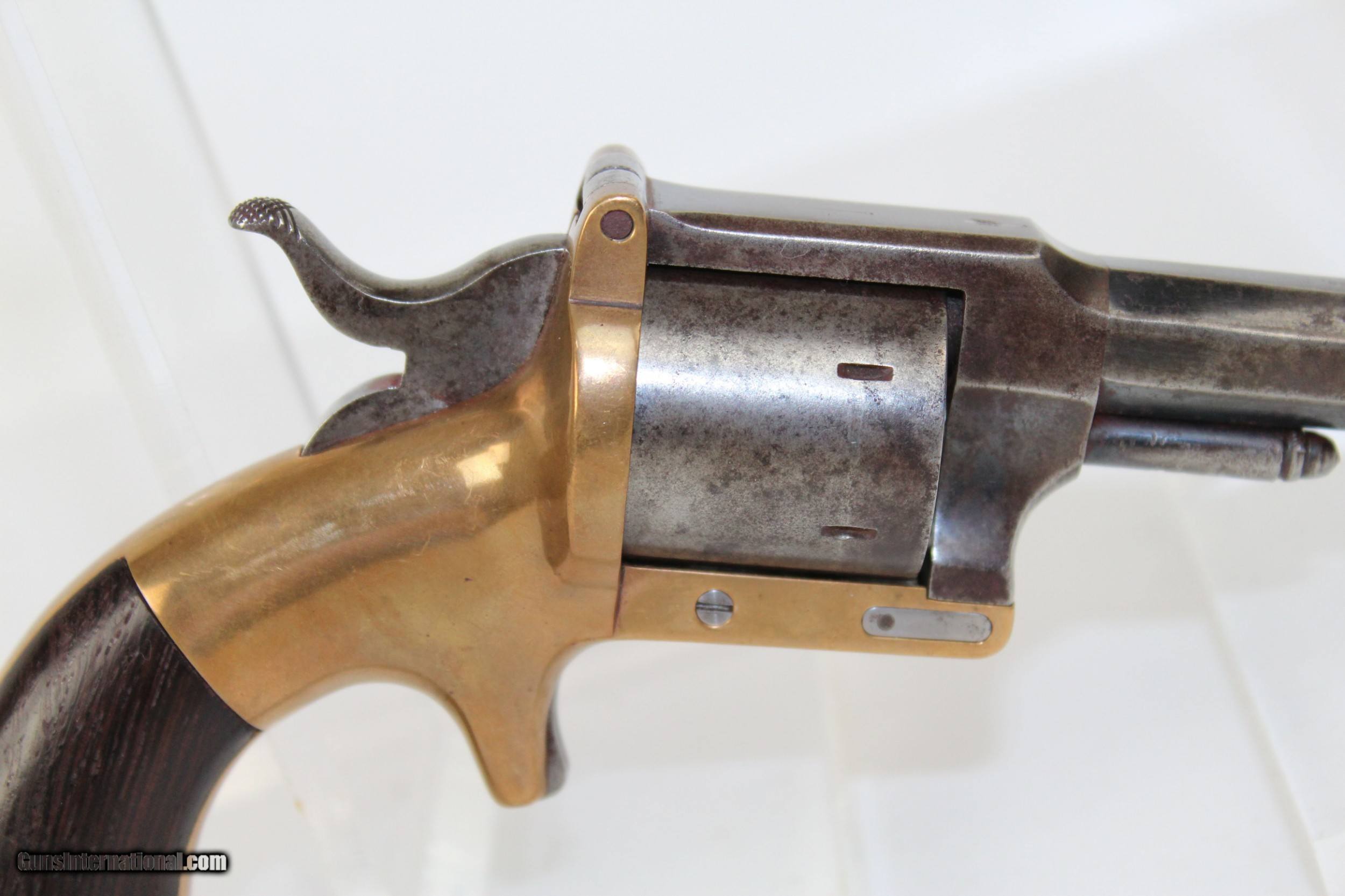 Description: SCARCE 1860’s Antique LUCIUS W. POND Belt Revolver Patent Infringement Revolver Sued by S&W Here we present an antique Brass Frame Lucius W. Pond Belt Revolver, manufactured circa 1862 in Worcester, Massachusetts. This Civil War era single action revolver was the subject of a patent infringement lawsuit in 1862, by Pond, of the Rollin White Patent from 1855, which was owned by Smith and Wesson. The court ruled in favor of Smith and Wesson. However, Pond, along with Bacon, Moore, and Warner (who were also found infringing on the patent) were able to continue producing the Belt Revolver on the grounds that they would be marked “Manuf’d for Smith & Wesson Pat’d April 5, 1855”. The final run of 4,486 were marked as the court demanded, with production ending in 1870. The Belt Revolver had several distinctive features. The most notable of them is the small trigger and no trigger guard. This was combined with a single action mechanism and a break open frame, allowing the shooter to load the cylinder. However, the hinge was located above the cylinder, rather than below as had become the norm. This allowed the cartridges to fall out of the cylinder, as it would be pointed downwards. The Belt Revolver was chambered to fire one of two different calibers. Those designated as “Navy” models were chambered for .32 rimfire cartridges, while the “Army” model was chambered to accept .44 rimfire cartridges. This revolver features six shots of .32 rimfire, making it the “Navy” model. The left side of the barrel is marked “MANUF’D FOR SMITH & WESSON PAT’D APRIL 3, 1855”. The top of the barrel is marked “L.W. POND WORCESTER MASS. PAT’D JULY 10, 1860”. This revolver is similar to the S&W Model No. 2 in several ways, including the tip up barrel design for loading and unloading. However, the Pond’s hinge is located at the rear of the frame and is more robust, making it less prone to wobble. This revolver has a distinctive brass front sight blade and a simple notch in the middle of the barrel hinge. The overall condition is near fine. The blue is about 60% remaining on the barrel and cylinder. The markings are clear. The numbers match. The rosewood grips are in great shape. The bore is very good and mostly bright. The action is excellent. Here is a great looking, scarce Pond Revolver with Smith & Wesson markings and history! Own the original! This is a legitimate antique and not a reproduction. Barrel is 5 inches. Caliber: .32 Rimfire Overall condition as seen in photos. Very Fast. Very Safe. FREE SHIPPING WORLDWIDE. Delivered directly to your door by express mail! Guaranteed AUTHENTIC & Includes CERTIFICATE OF AUTHENTICITY. ancestryguns $1250 #7300 SOLD Antique: Yes |