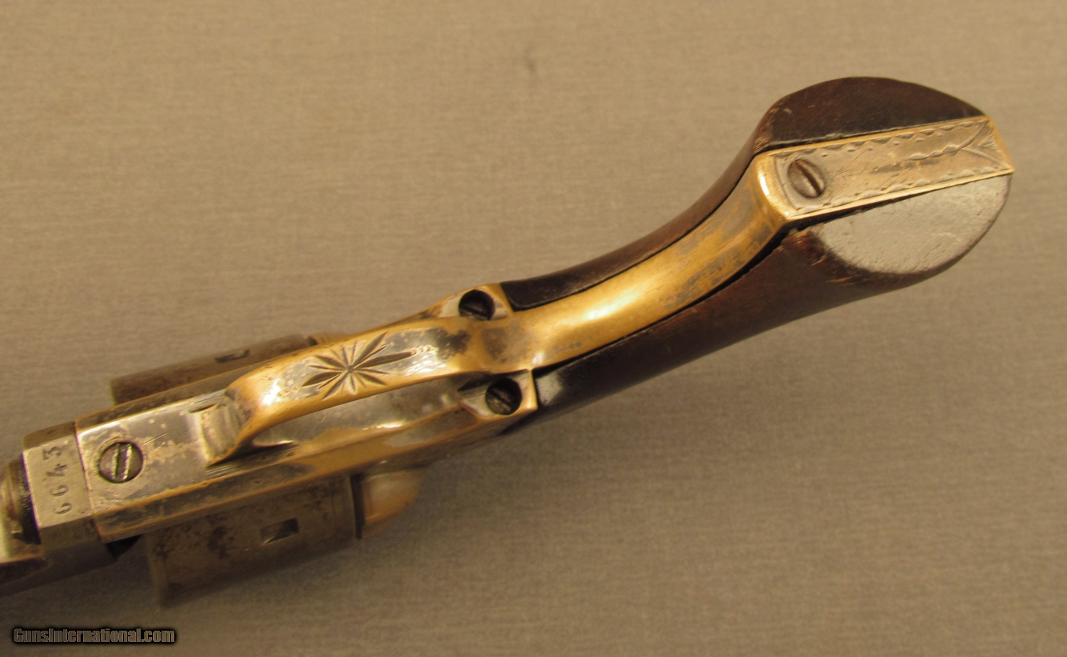 Description: Serial #6643, .32 RF, 6” octagon barrel with a very good bore that has light freckling within the grooves. This Civil War era revolver has an overall mottled gray-brown patina on the barrel and 7-shot cylinder mixing with plum-brown freckling and some pinprick pitting on the sides of the barrel at the breech. The brass frame, which has extensive New York scroll engraving, retains about 25% of the original nickel finish and has a medium, yellow-ochre patina on the balance. The walnut grip is in good plus condition retaining a dark brown oil finish, but does have some small handling marks and moderate wear to the flare at the butt. The ejector rod is missing, but the mechanism is tight and fully functional. This is a nice looking example of a secondary Civil War revolver and is in good plus-very good condition. Antique SOLD Antique: Yes Manufacturer: Moore Model: Belt Serial Number: 6643 Caliber Info: .32 RF Gauge Info: .32 RF |