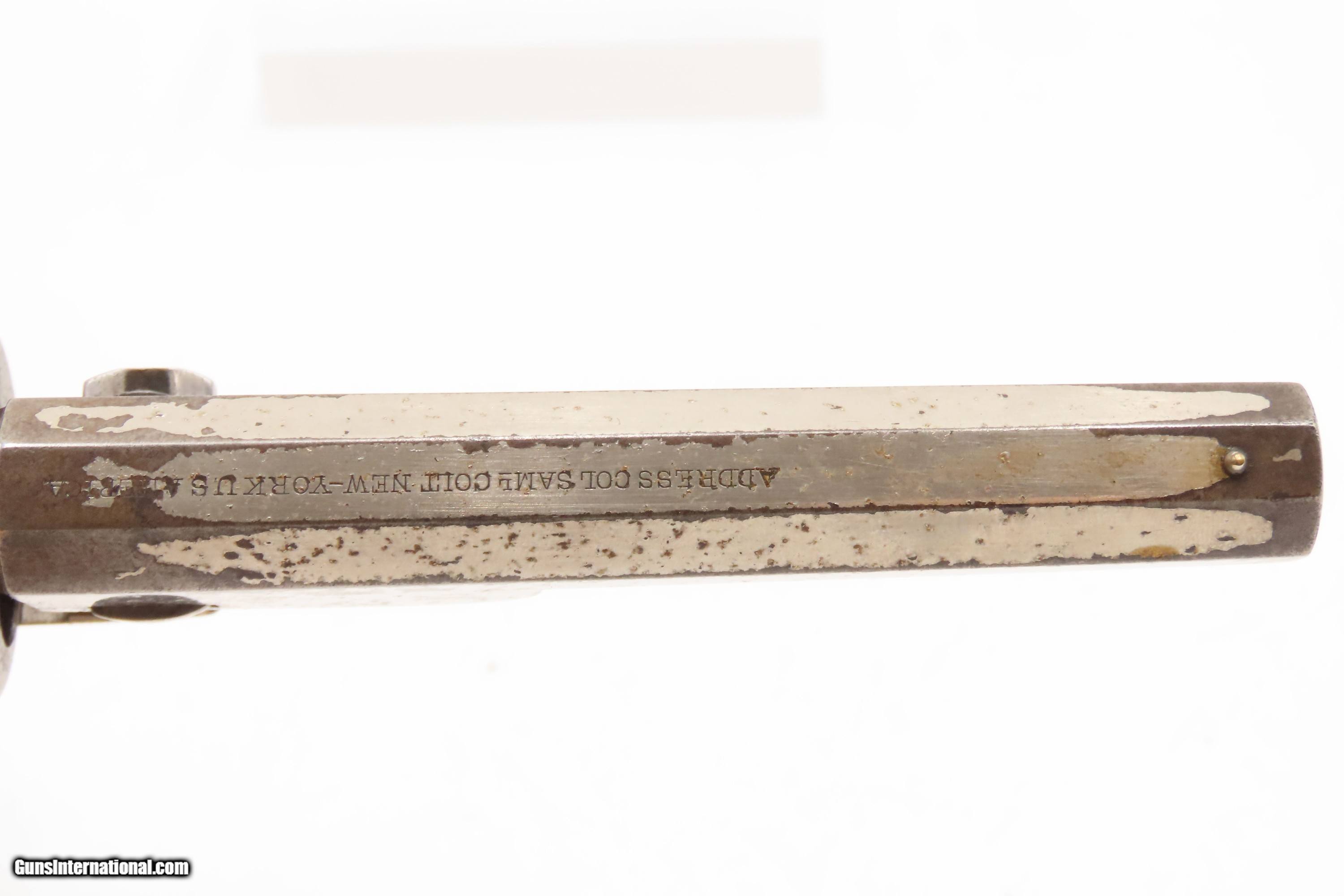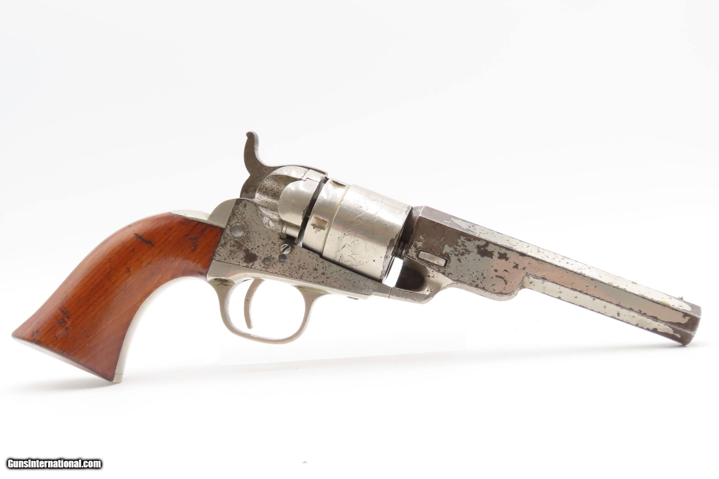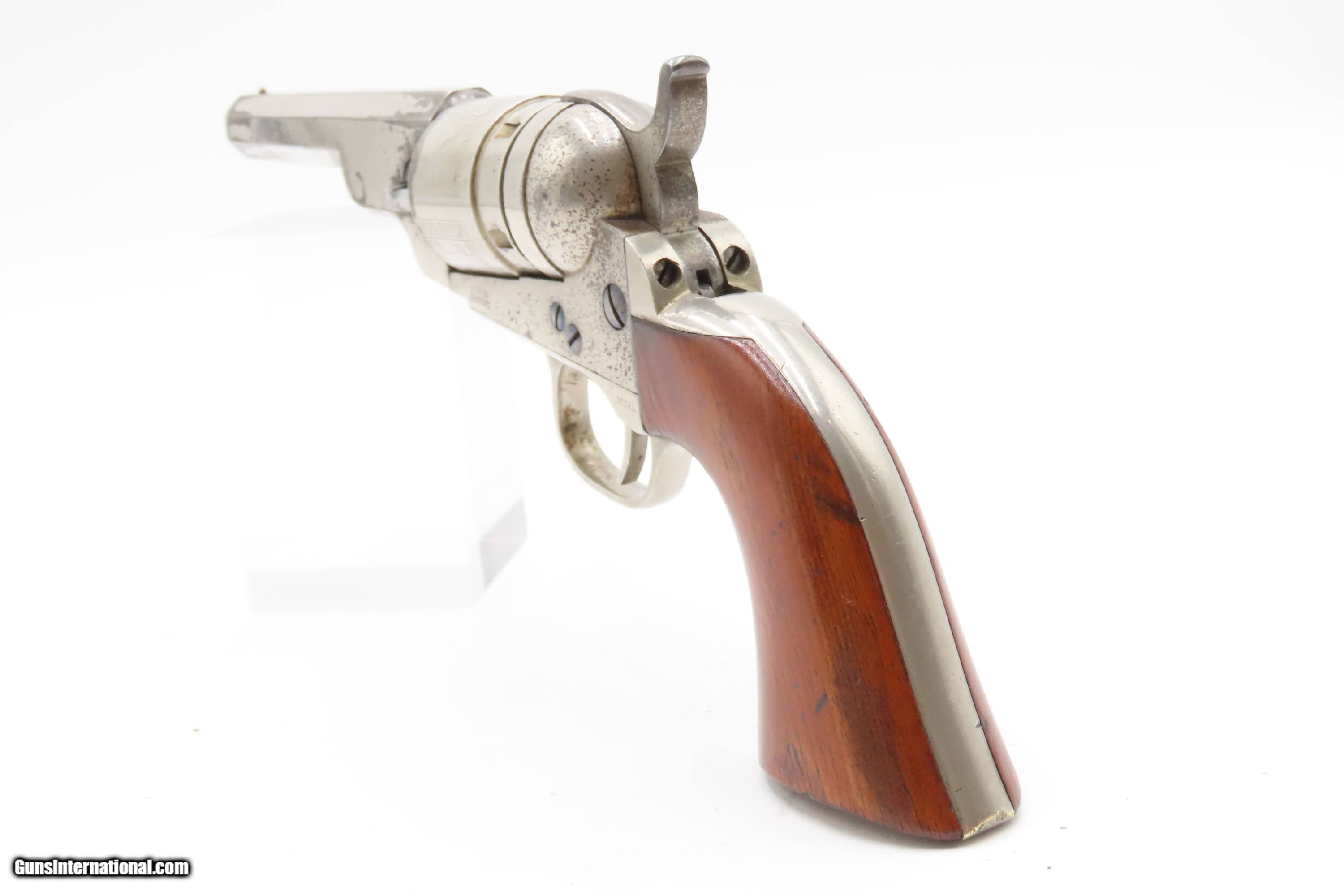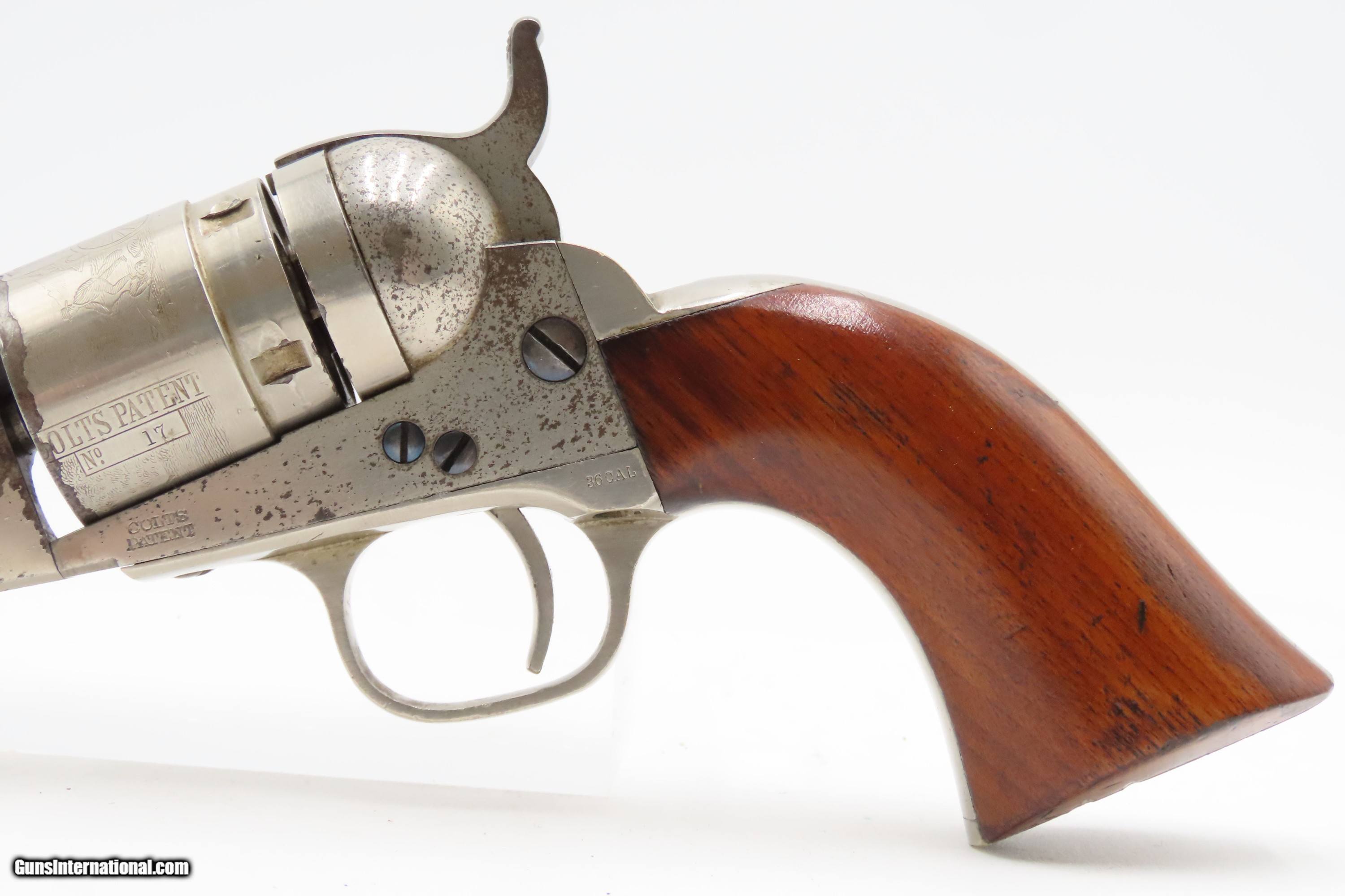 Description: SERIAL #17 COLT Antique POCKET NAVY Cartridge Conversion .38 RF Revolver One of 2,000 4-1/2” Barrel Cartridge Revolvers Here Ancestry Guns presents an antique Colt Pocket Navy Model Cartridge Conversion Revolver in .38 Rimfire, made circa 1873-75 in Hartford, Connecticut. This very early production example is bearing serial number 17. There were somewhere around 10,000 of these made using existing percussion revolvers or parts and manufacturing new components to accept cartridges, with only around 2,000 of these revolvers converted to the 4 1/2 inch octagon barrel chambered in .38 rimfire per “Flayderman's Guide” (9th Edition, 5B-127). The factory conversion of Colt’s percussion line coincided with the expiration of the S&W owned Rollin White Patent, from which Smith & Wesson benefitted greatly as they dominated the market for cartridge revolvers for over a decade. This one is the same size as the 1849 pocket and was probably partially assembled from Model 1849 parts. This revolver would have made an excellent companion for a civilian or lawman in the late 19th Century! One of the most aesthetically pleasing aspects of this revolver is its cylinder scene. Cylinder scenes during this period were common, especially for Colt, not only for their visual appeal, but because it made a revolver more difficult to forge. The scene on this example and on the 1849 Pocket is that of a stagecoach robbery. The focal point is the stagecoach drawn by four horses. A woman in a dress is seen framed in the doorway of the side of the coach. The driver is standing alongside wielding his pistol against multiple assailants as the horses rear and struggle against their harnesses. Several of the bandits lay dying on the ground, one tries to control the horses, two are running away and one is in the process of falling dead after being shot. Not a bad way to show interested buyers what a pistol like this would be good for. The overall condition is fine. Much original nickel is preserved. Excellent action. The bore is bright with crisp rifling. Markings are sharp. The cylinder scene is intact. Very good, solid grip with less than average handling evidence. Numbers match. The wedge is un-numbered. Here is a scarce Colt revolver in great condition that would have been among their first cartridge revolvers! Own the original! This is a legitimate antique and not a reproduction. Barrel is 4-1/2 inches. Caliber: .38 Rimfire Overall condition as seen in photos. Very Fast. Very Safe. FREE SHIPPING WORLDWIDE. Delivered directly to your door by express mail! Guaranteed AUTHENTIC & Includes CERTIFICATE OF AUTHENTICITY. $4200 #259624 Antique: Yes Price: $4,200.00 Buy Now Pay with