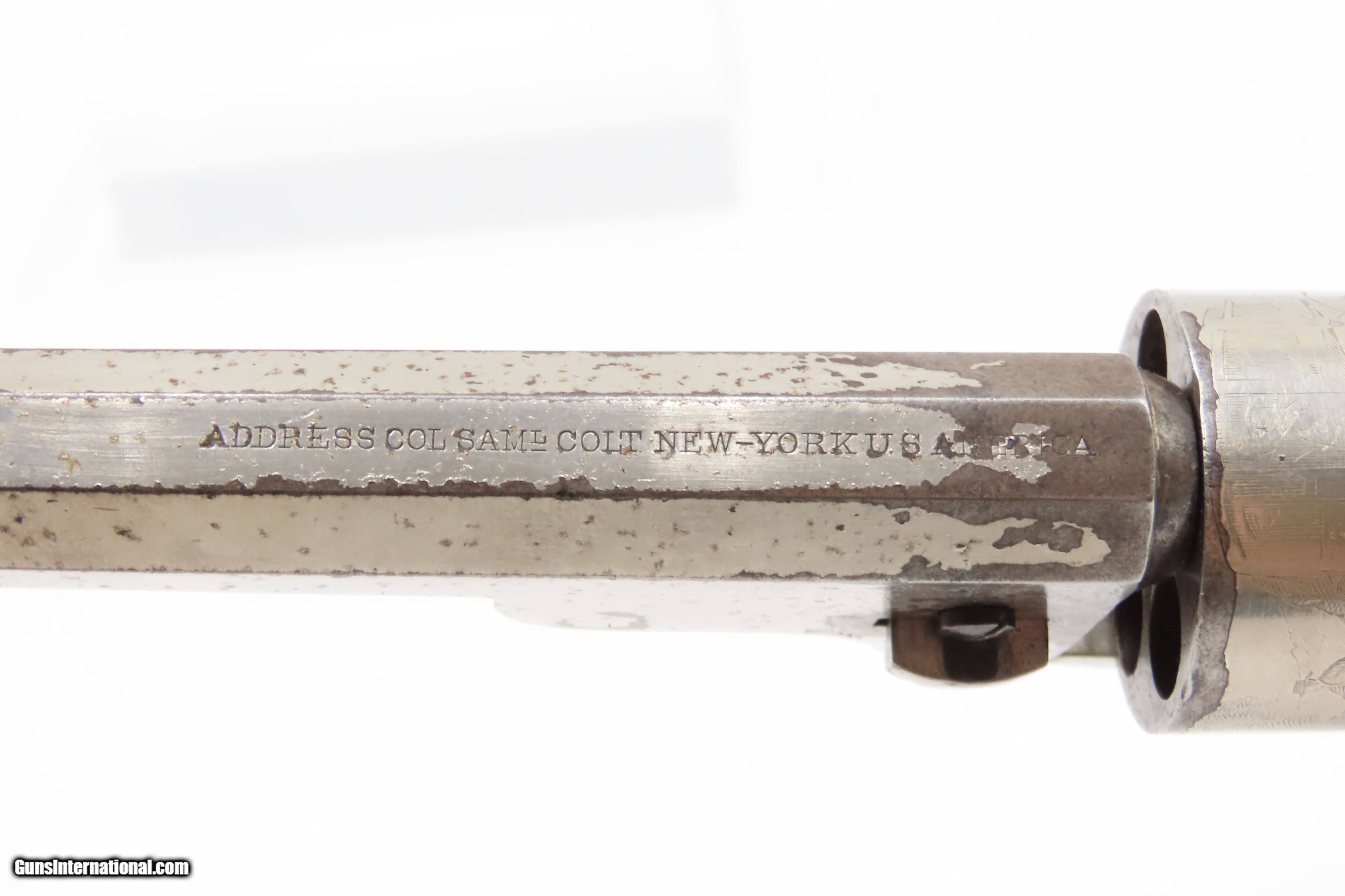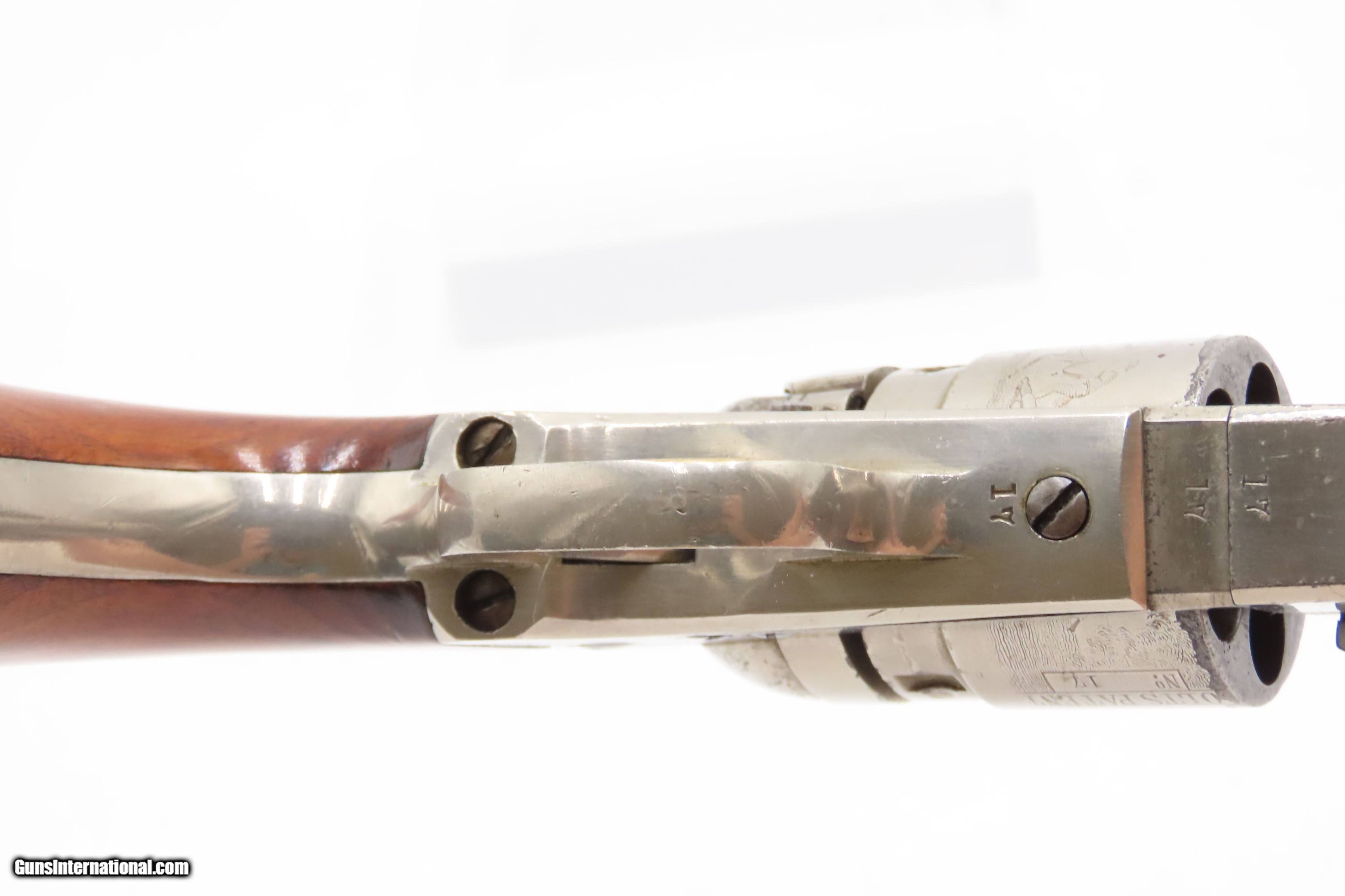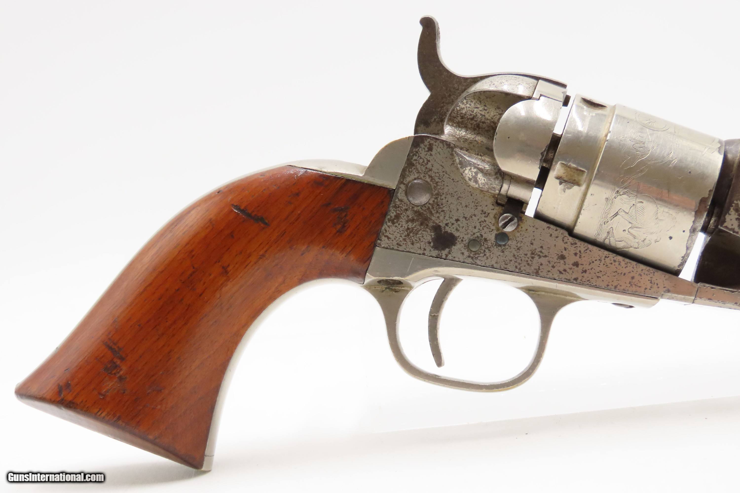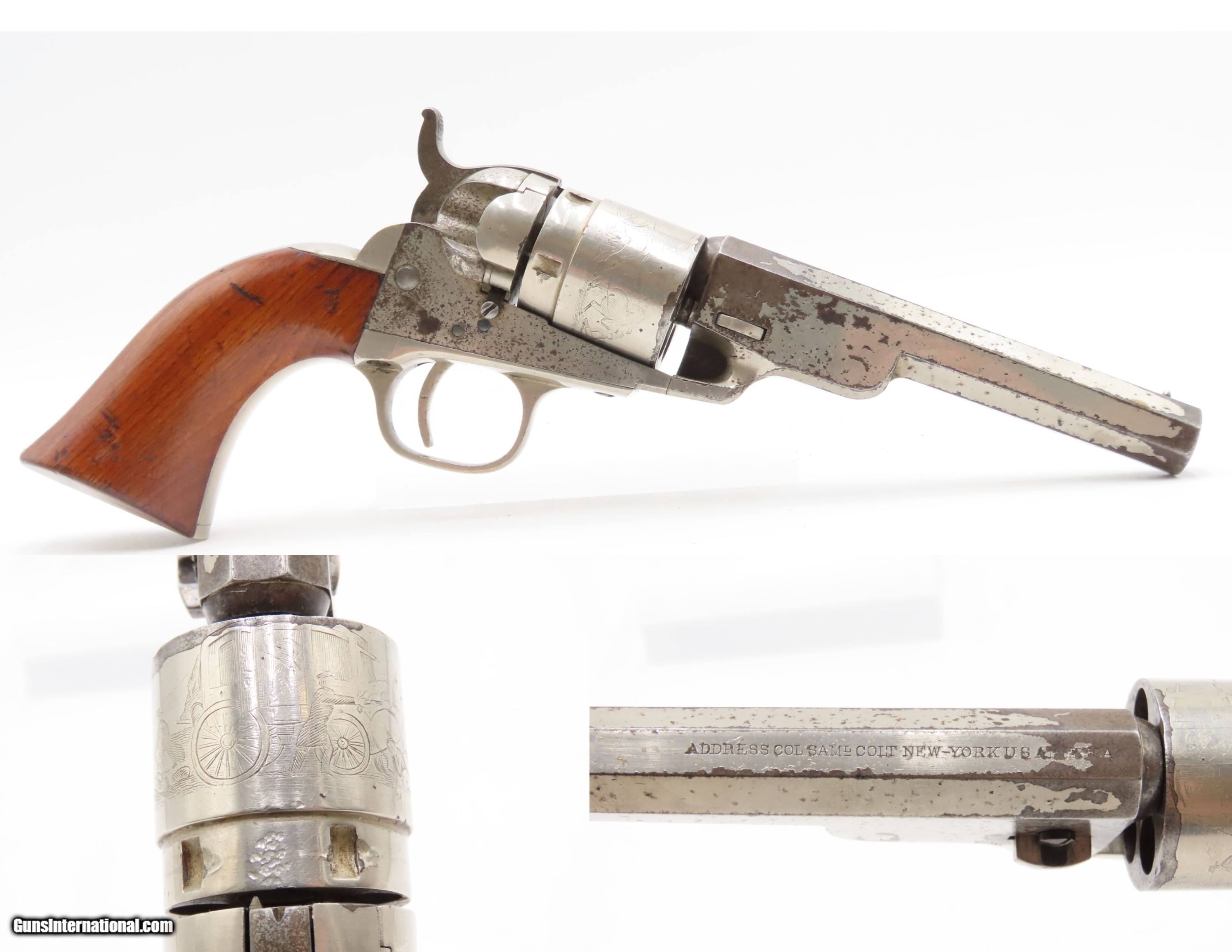 Description: SERIAL #17 COLT Antique POCKET NAVY Cartridge Conversion .38 RF Revolver One of 2,000 4-1/2” Barrel Cartridge Revolvers Here Ancestry Guns presents an antique Colt Pocket Navy Model Cartridge Conversion Revolver in .38 Rimfire, made circa 1873-75 in Hartford, Connecticut. This very early production example is bearing serial number 17. There were somewhere around 10,000 of these made using existing percussion revolvers or parts and manufacturing new components to accept cartridges, with only around 2,000 of these revolvers converted to the 4 1/2 inch octagon barrel chambered in .38 rimfire per “Flayderman's Guide” (9th Edition, 5B-127). The factory conversion of Colt’s percussion line coincided with the expiration of the S&W owned Rollin White Patent, from which Smith & Wesson benefitted greatly as they dominated the market for cartridge revolvers for over a decade. This one is the same size as the 1849 pocket and was probably partially assembled from Model 1849 parts. This revolver would have made an excellent companion for a civilian or lawman in the late 19th Century! One of the most aesthetically pleasing aspects of this revolver is its cylinder scene. Cylinder scenes during this period were common, especially for Colt, not only for their visual appeal, but because it made a revolver more difficult to forge. The scene on this example and on the 1849 Pocket is that of a stagecoach robbery. The focal point is the stagecoach drawn by four horses. A woman in a dress is seen framed in the doorway of the side of the coach. The driver is standing alongside wielding his pistol against multiple assailants as the horses rear and struggle against their harnesses. Several of the bandits lay dying on the ground, one tries to control the horses, two are running away and one is in the process of falling dead after being shot. Not a bad way to show interested buyers what a pistol like this would be good for. The overall condition is fine. Much original nickel is preserved. Excellent action. The bore is bright with crisp rifling. Markings are sharp. The cylinder scene is intact. Very good, solid grip with less than average handling evidence. Numbers match. The wedge is un-numbered. Here is a scarce Colt revolver in great condition that would have been among their first cartridge revolvers! Own the original! This is a legitimate antique and not a reproduction. Barrel is 4-1/2 inches. Caliber: .38 Rimfire Overall condition as seen in photos. Very Fast. Very Safe. FREE SHIPPING WORLDWIDE. Delivered directly to your door by express mail! Guaranteed AUTHENTIC & Includes CERTIFICATE OF AUTHENTICITY. $4200 #259624 Antique: Yes Price: $4,200.00 Buy Now Pay with