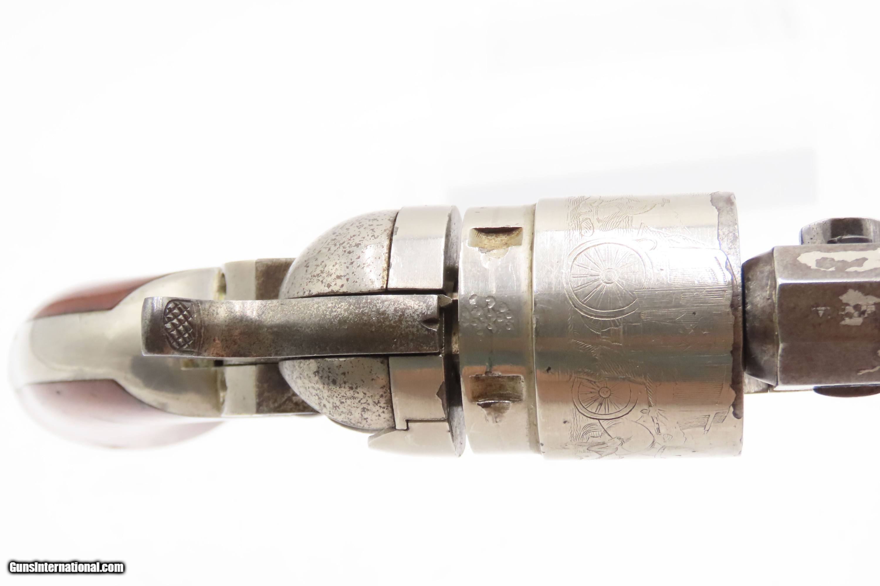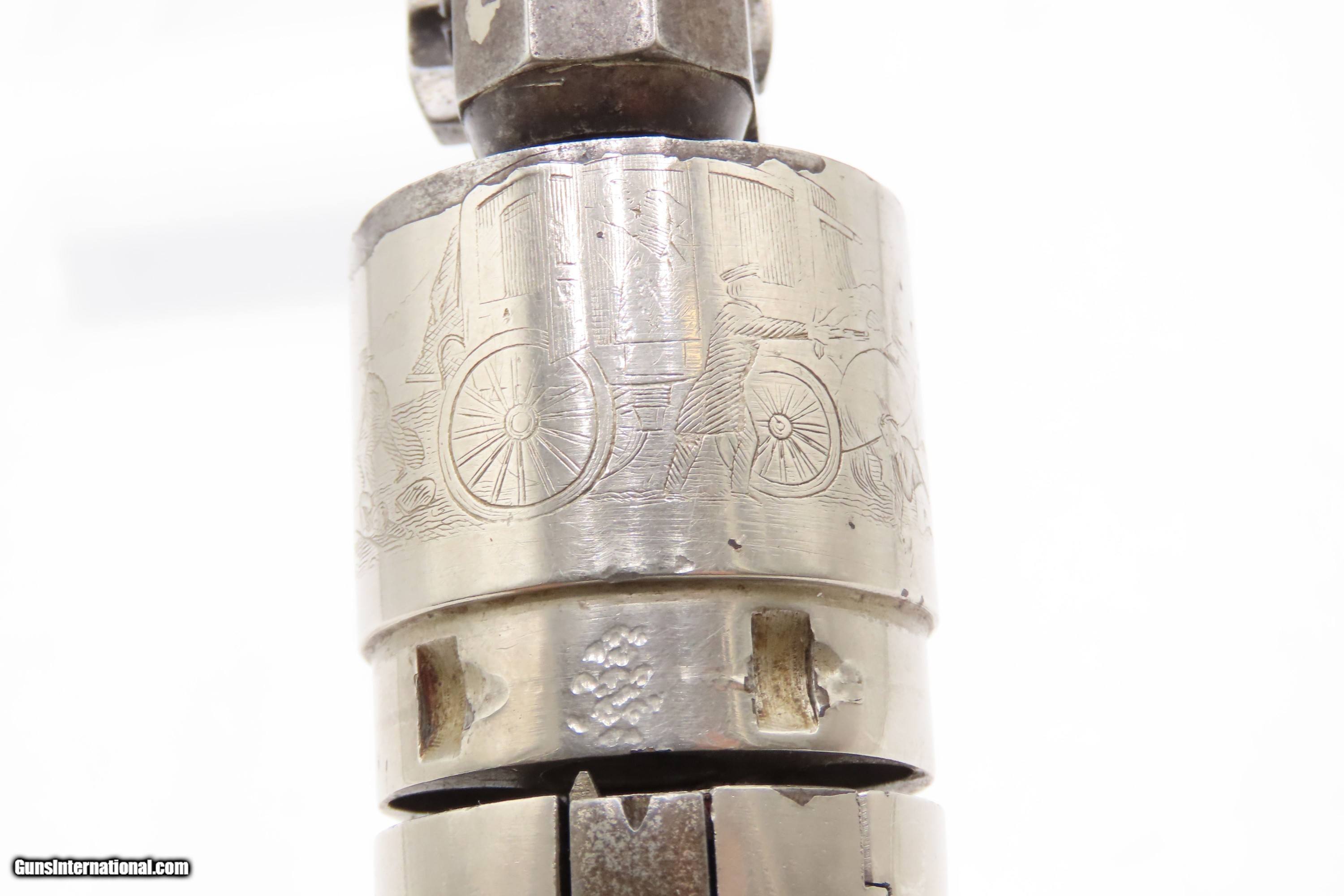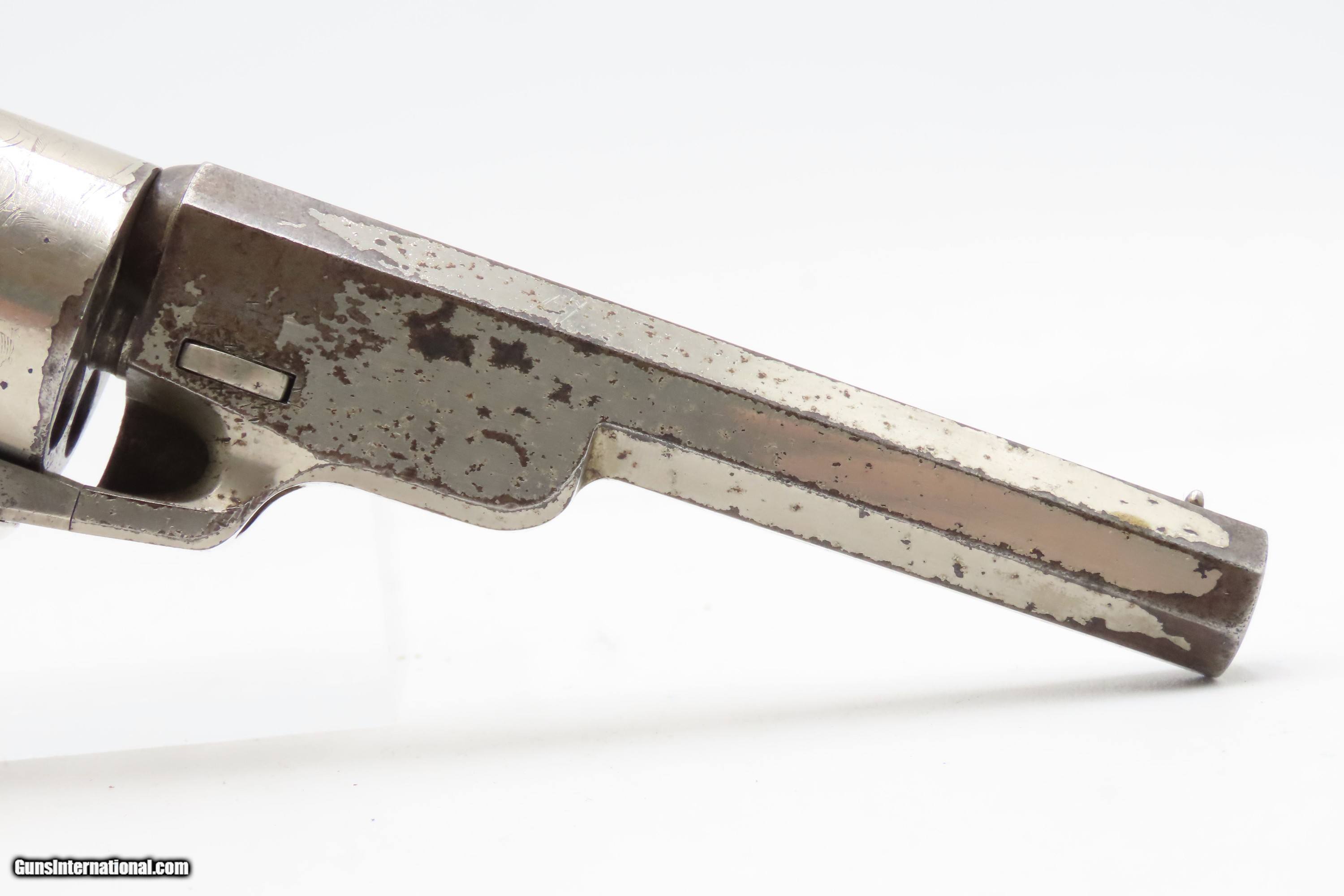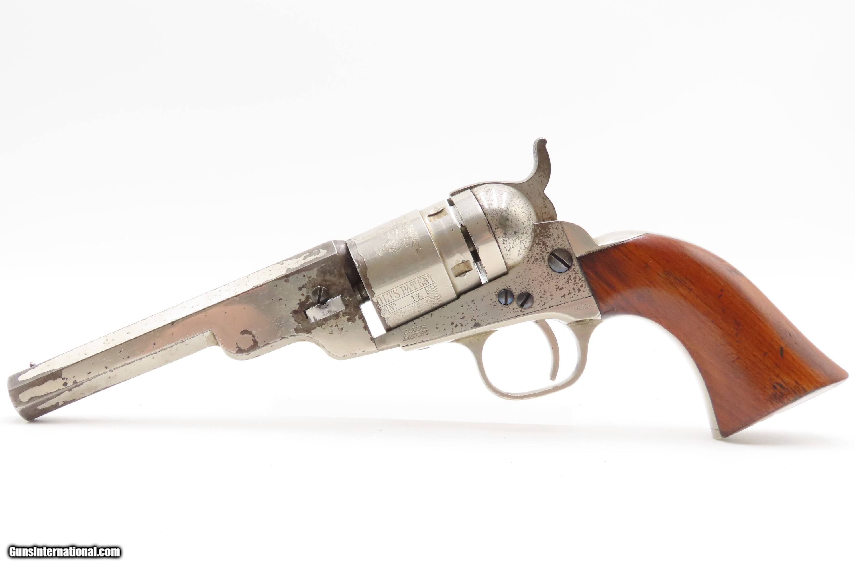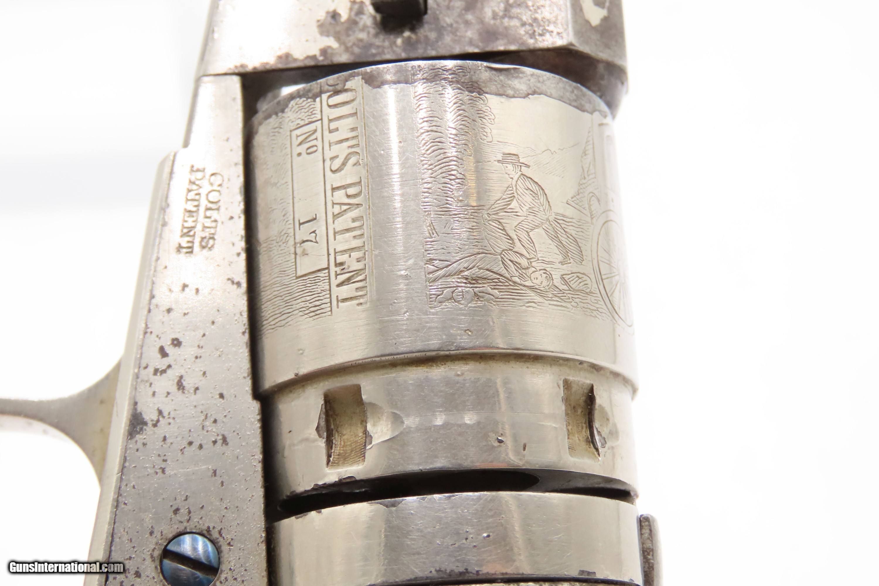 Description: SERIAL #17 COLT Antique POCKET NAVY Cartridge Conversion .38 RF Revolver One of 2,000 4-1/2” Barrel Cartridge Revolvers Here Ancestry Guns presents an antique Colt Pocket Navy Model Cartridge Conversion Revolver in .38 Rimfire, made circa 1873-75 in Hartford, Connecticut. This very early production example is bearing serial number 17. There were somewhere around 10,000 of these made using existing percussion revolvers or parts and manufacturing new components to accept cartridges, with only around 2,000 of these revolvers converted to the 4 1/2 inch octagon barrel chambered in .38 rimfire per “Flayderman's Guide” (9th Edition, 5B-127). The factory conversion of Colt’s percussion line coincided with the expiration of the S&W owned Rollin White Patent, from which Smith & Wesson benefitted greatly as they dominated the market for cartridge revolvers for over a decade. This one is the same size as the 1849 pocket and was probably partially assembled from Model 1849 parts. This revolver would have made an excellent companion for a civilian or lawman in the late 19th Century! One of the most aesthetically pleasing aspects of this revolver is its cylinder scene. Cylinder scenes during this period were common, especially for Colt, not only for their visual appeal, but because it made a revolver more difficult to forge. The scene on this example and on the 1849 Pocket is that of a stagecoach robbery. The focal point is the stagecoach drawn by four horses. A woman in a dress is seen framed in the doorway of the side of the coach. The driver is standing alongside wielding his pistol against multiple assailants as the horses rear and struggle against their harnesses. Several of the bandits lay dying on the ground, one tries to control the horses, two are running away and one is in the process of falling dead after being shot. Not a bad way to show interested buyers what a pistol like this would be good for. The overall condition is fine. Much original nickel is preserved. Excellent action. The bore is bright with crisp rifling. Markings are sharp. The cylinder scene is intact. Very good, solid grip with less than average handling evidence. Numbers match. The wedge is un-numbered. Here is a scarce Colt revolver in great condition that would have been among their first cartridge revolvers! Own the original! This is a legitimate antique and not a reproduction. Barrel is 4-1/2 inches. Caliber: .38 Rimfire Overall condition as seen in photos. Very Fast. Very Safe. FREE SHIPPING WORLDWIDE. Delivered directly to your door by express mail! Guaranteed AUTHENTIC & Includes CERTIFICATE OF AUTHENTICITY. $4200 #259624 Antique: Yes Price: $4,200.00 Buy Now Pay with