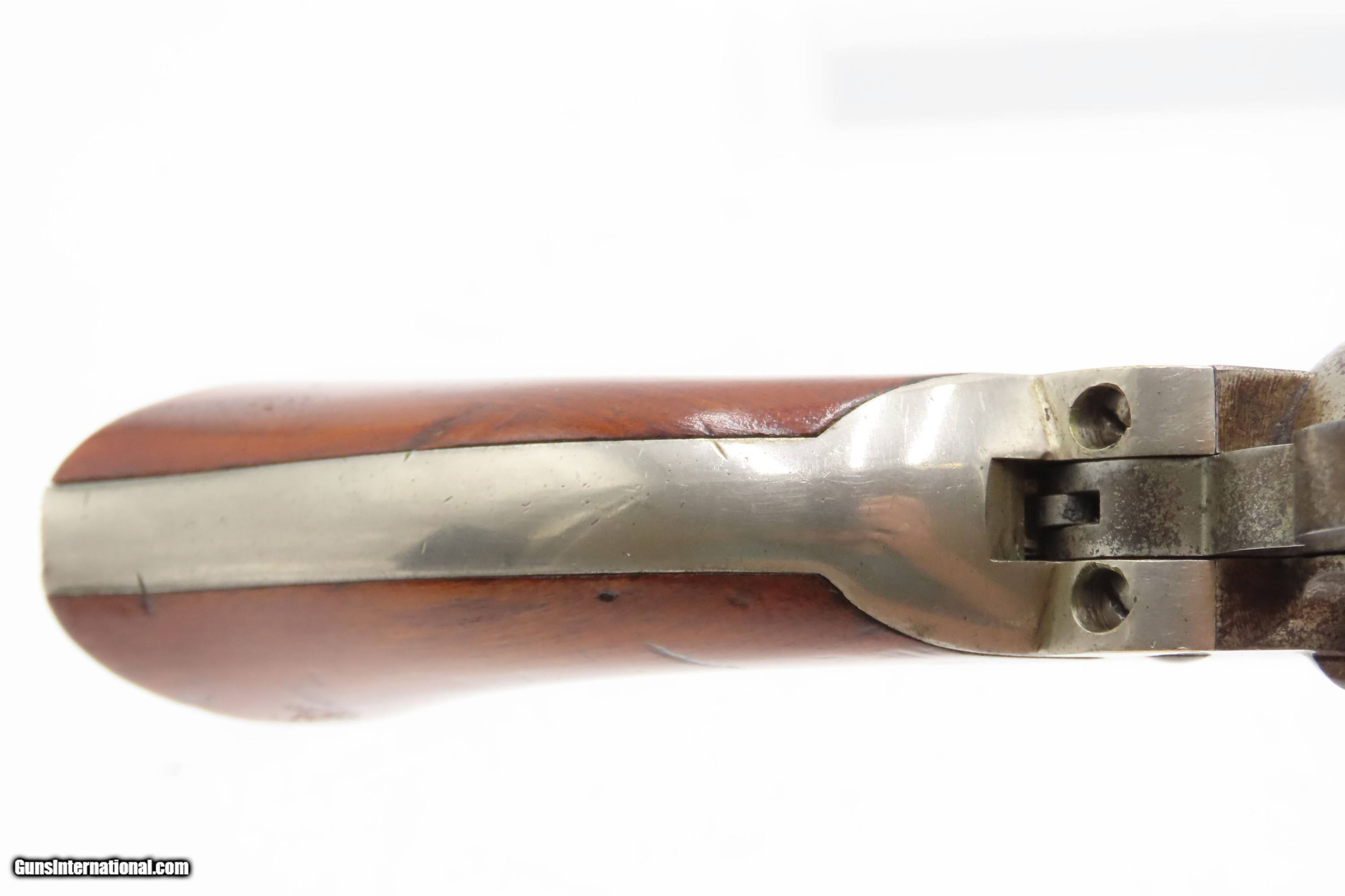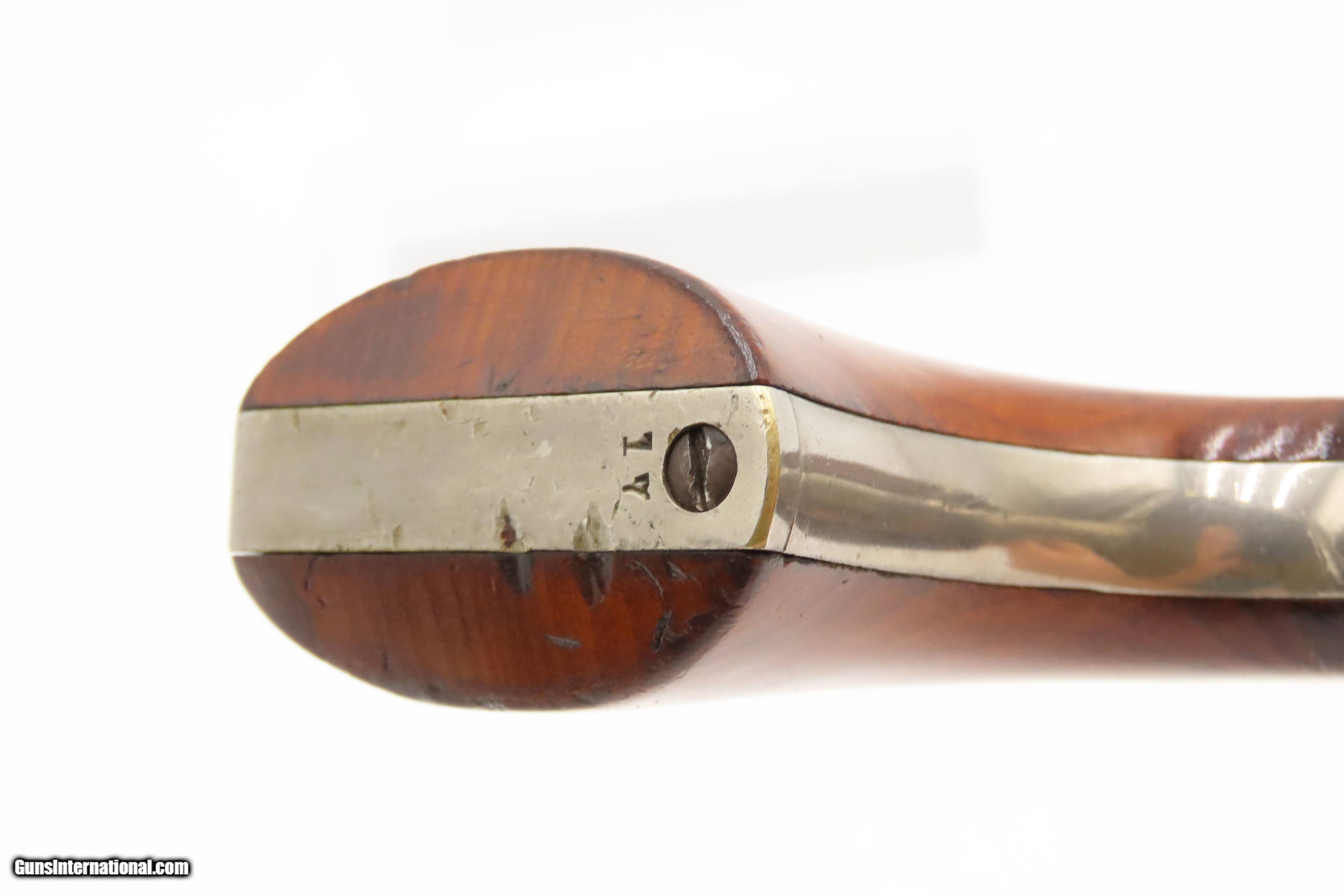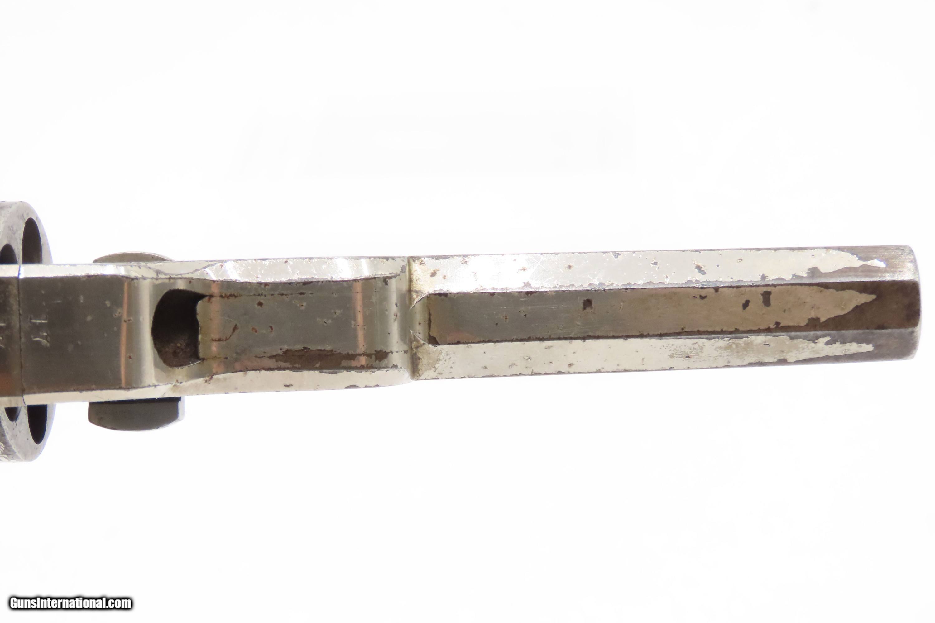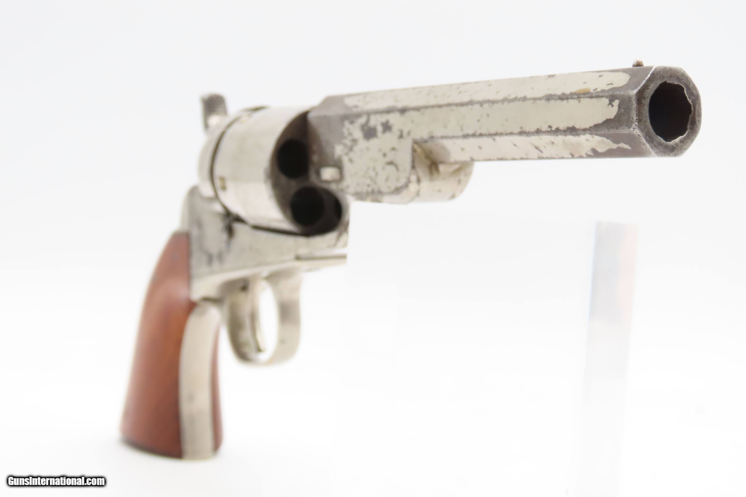 Description: SERIAL #17 COLT Antique POCKET NAVY Cartridge Conversion .38 RF Revolver One of 2,000 4-1/2” Barrel Cartridge Revolvers Here Ancestry Guns presents an antique Colt Pocket Navy Model Cartridge Conversion Revolver in .38 Rimfire, made circa 1873-75 in Hartford, Connecticut. This very early production example is bearing serial number 17. There were somewhere around 10,000 of these made using existing percussion revolvers or parts and manufacturing new components to accept cartridges, with only around 2,000 of these revolvers converted to the 4 1/2 inch octagon barrel chambered in .38 rimfire per “Flayderman's Guide” (9th Edition, 5B-127). The factory conversion of Colt’s percussion line coincided with the expiration of the S&W owned Rollin White Patent, from which Smith & Wesson benefitted greatly as they dominated the market for cartridge revolvers for over a decade. This one is the same size as the 1849 pocket and was probably partially assembled from Model 1849 parts. This revolver would have made an excellent companion for a civilian or lawman in the late 19th Century! One of the most aesthetically pleasing aspects of this revolver is its cylinder scene. Cylinder scenes during this period were common, especially for Colt, not only for their visual appeal, but because it made a revolver more difficult to forge. The scene on this example and on the 1849 Pocket is that of a stagecoach robbery. The focal point is the stagecoach drawn by four horses. A woman in a dress is seen framed in the doorway of the side of the coach. The driver is standing alongside wielding his pistol against multiple assailants as the horses rear and struggle against their harnesses. Several of the bandits lay dying on the ground, one tries to control the horses, two are running away and one is in the process of falling dead after being shot. Not a bad way to show interested buyers what a pistol like this would be good for. The overall condition is fine. Much original nickel is preserved. Excellent action. The bore is bright with crisp rifling. Markings are sharp. The cylinder scene is intact. Very good, solid grip with less than average handling evidence. Numbers match. The wedge is un-numbered. Here is a scarce Colt revolver in great condition that would have been among their first cartridge revolvers! Own the original! This is a legitimate antique and not a reproduction. Barrel is 4-1/2 inches. Caliber: .38 Rimfire Overall condition as seen in photos. Very Fast. Very Safe. FREE SHIPPING WORLDWIDE. Delivered directly to your door by express mail! Guaranteed AUTHENTIC & Includes CERTIFICATE OF AUTHENTICITY. $4200 #259624 Antique: Yes Price: $4,200.00 Buy Now Pay with