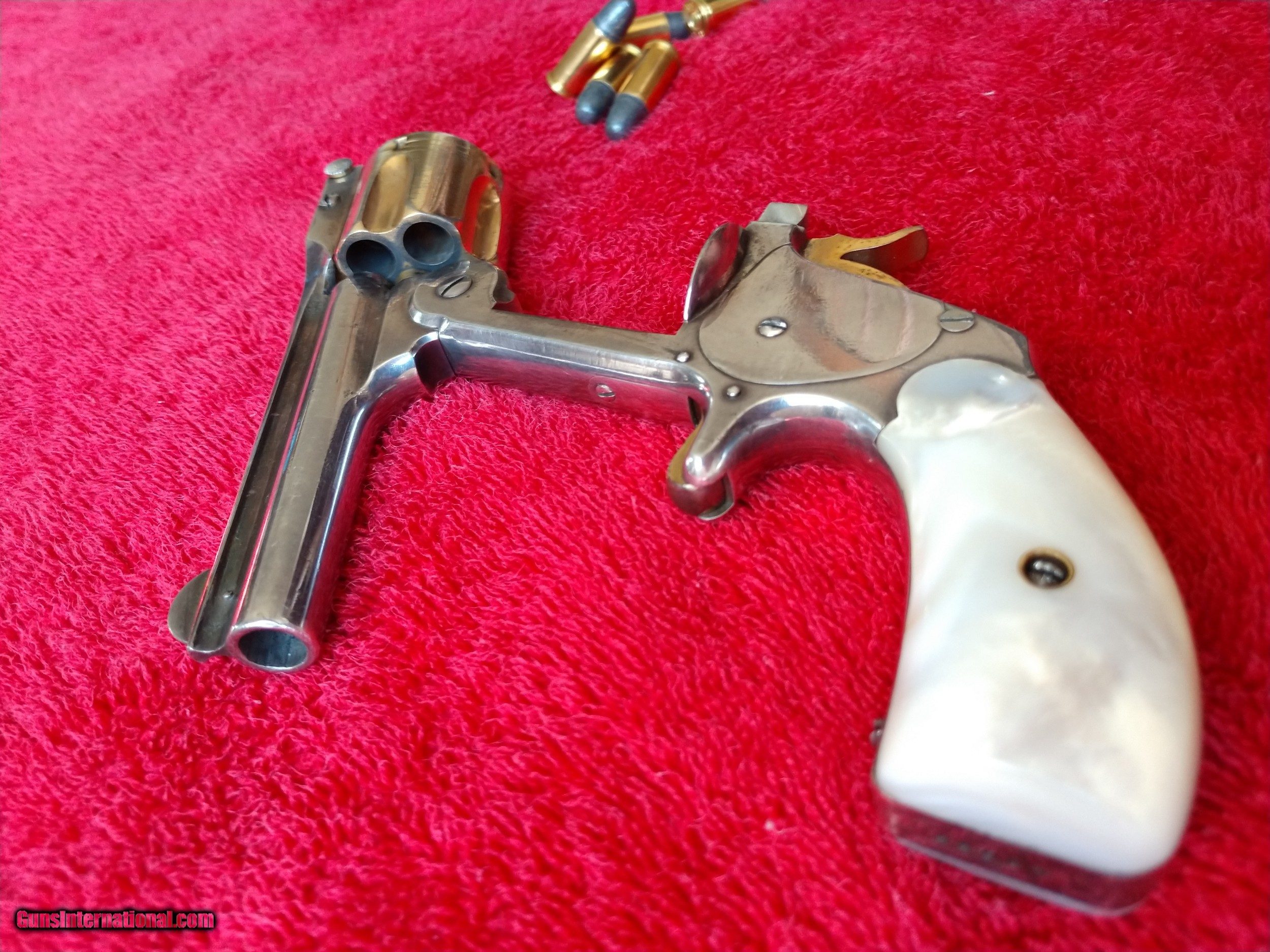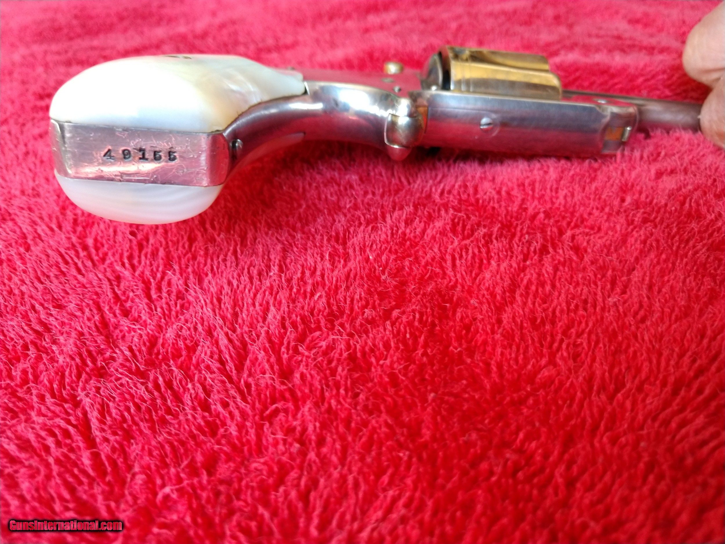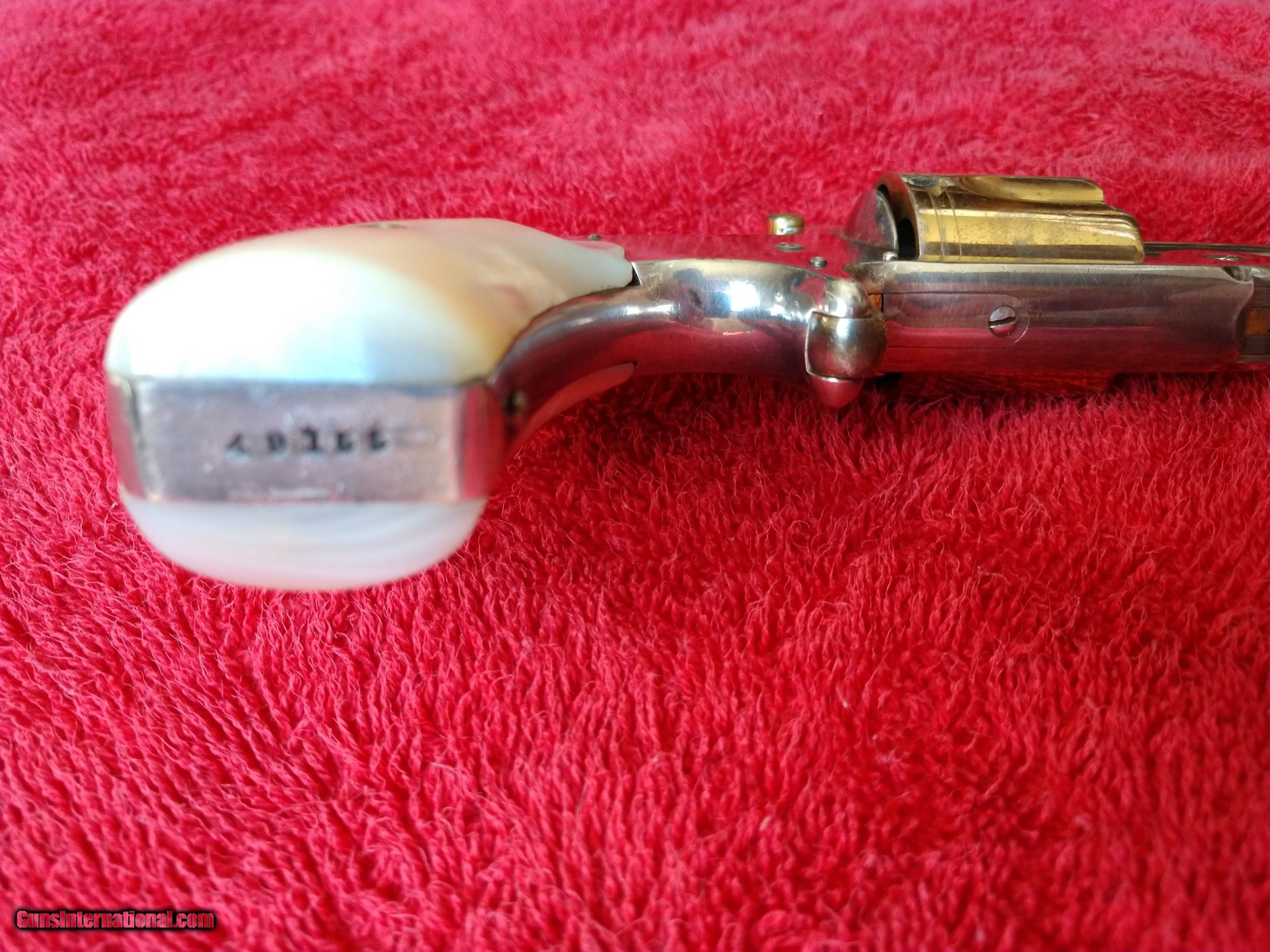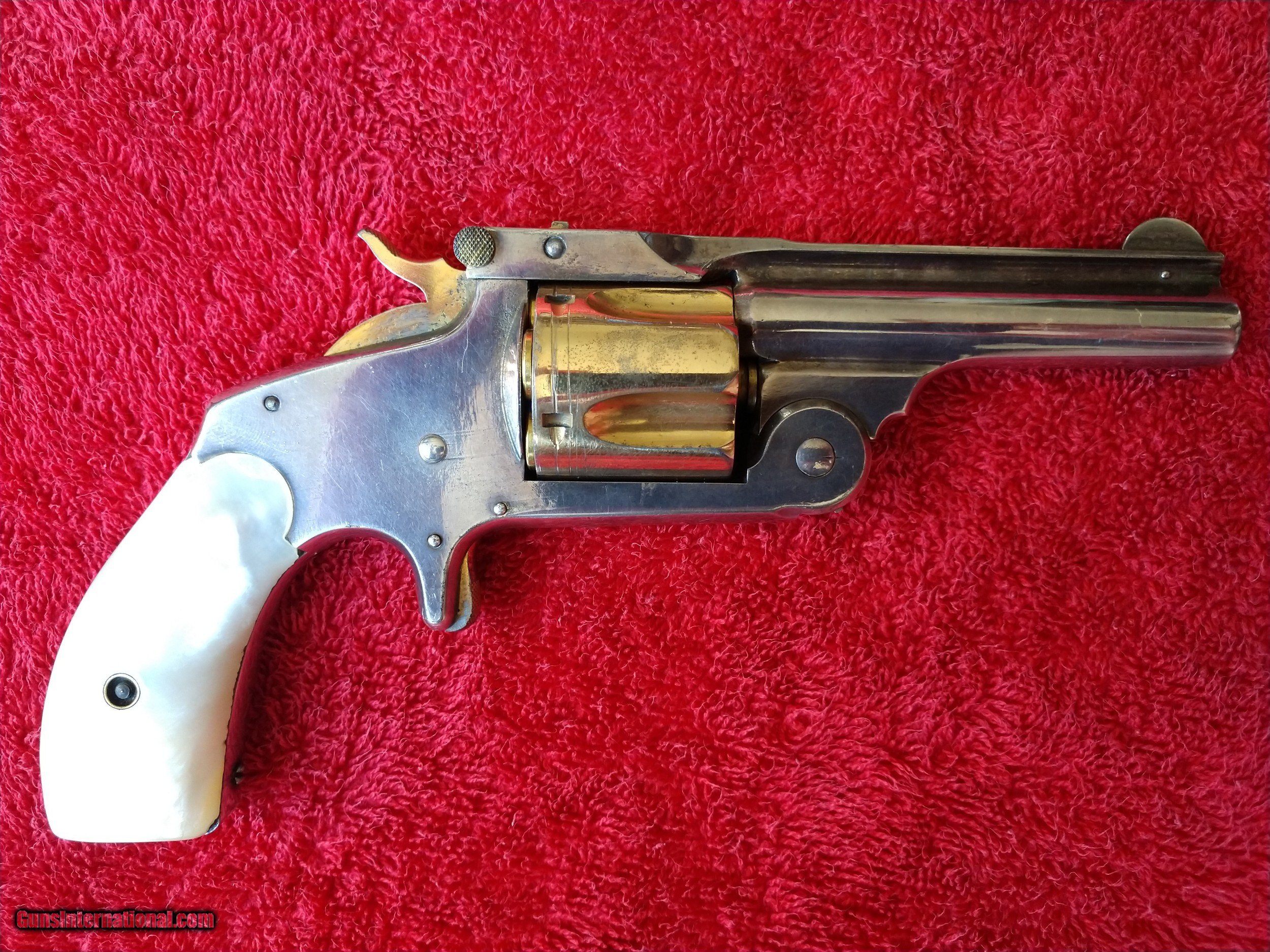 Description: 30 years of experience and this is the nicest model 2 Smith and Wesson to move through here. Action is original and like new. The barrel to frame lock is tight. The cylinder locks up tight and the timing is perfect. I have had this S&W in my personal collection for years and fired it accurately with delight. The face of the cylinder shows powder from that. It can be cleaned. The grips are very nice pearl. All matching serial numbers. Being an antique this beautiful break top revolver will ship directly to you and make a FANTASTIC addition to your collection that you will enjoy for years. SOLD Antique: Yes Handgun Caliber: .38 S&W (.38 Colt New Police, .38 Super Police) Manufacturer: Smith and Wesson Model: 2 Serial Number: 49155 Barrel Length: 3 1/4 inches Chambers: 5 Ejectors: "auto Condition: NRA excellent Barrel Type: Ribbed Action: Single Stock: Pearl Finish: Silver and GOLD |