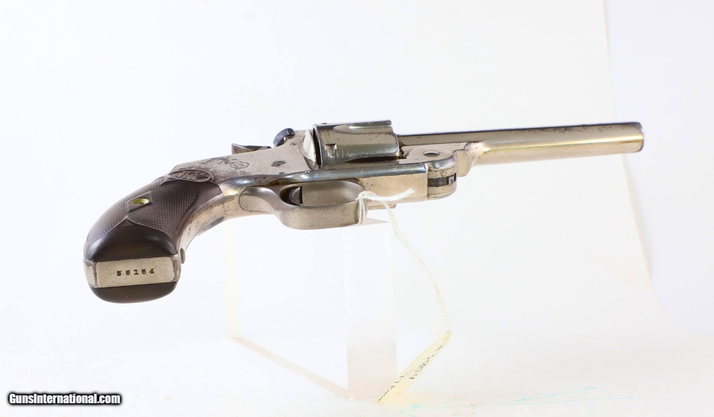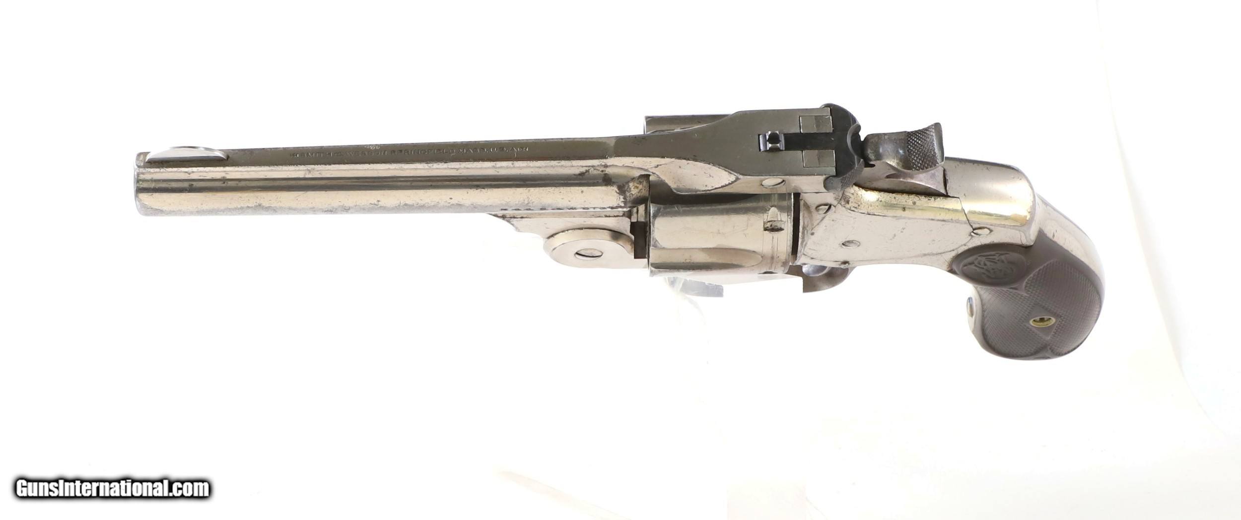 Description: Introduced in 1878. The rare, non-standard 5 inch barrel has the one-line address on the rib and "44 S&W CTG" on the left side . The Caliber marked New Model No. 3's are rarely encountered, and the standard barrel length was 6 1/2 inches. Pinned blade front sight and a notch rear sight on the catch. The matching serial number 35154 is stamped on the butt, rear cylinder face, barrel and latch. Nickel finish with casehardened hammer and trigger guard. Fit with Factory hard rubber grips. In Fine Condition. The revolver retains 80% + Original Nickel finish, the grips are excellent with some very scattered minor handling marks and overall crisp checkering. The bore is clean and in excellent condition. Mechanically fine throughout. SOLD Antique: Yes |