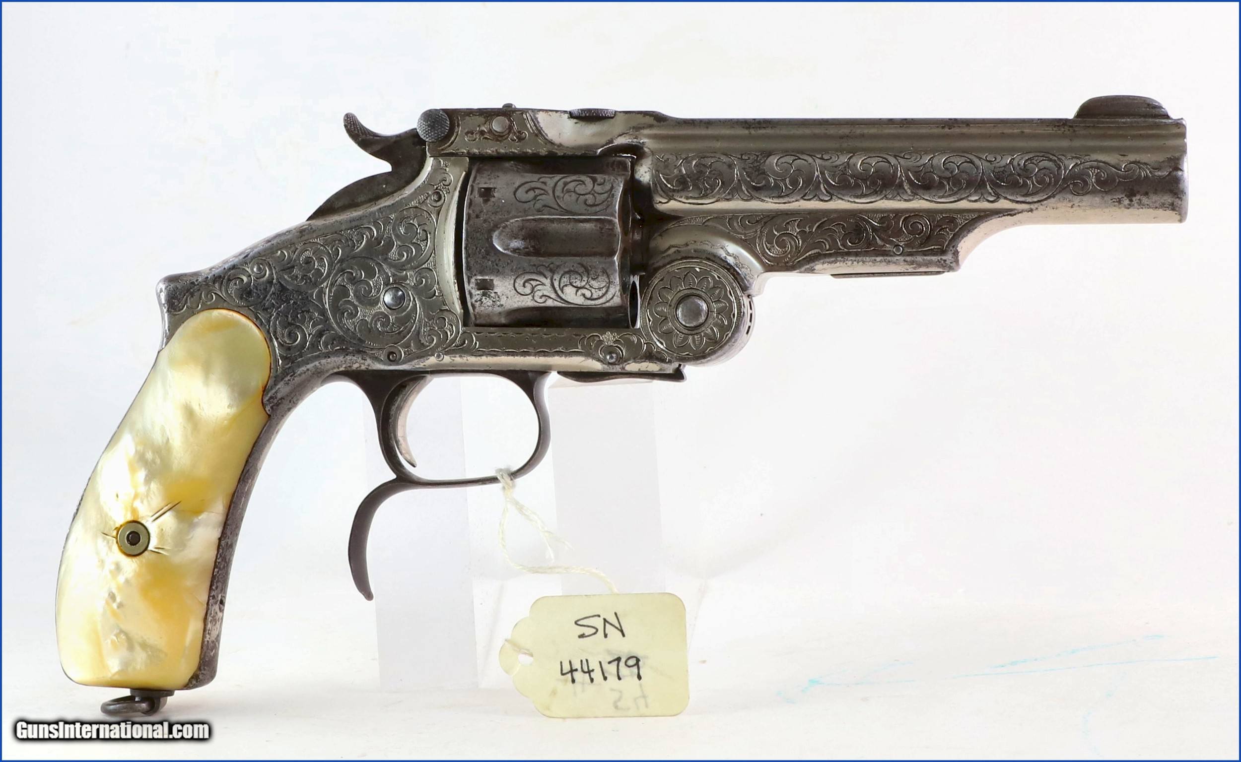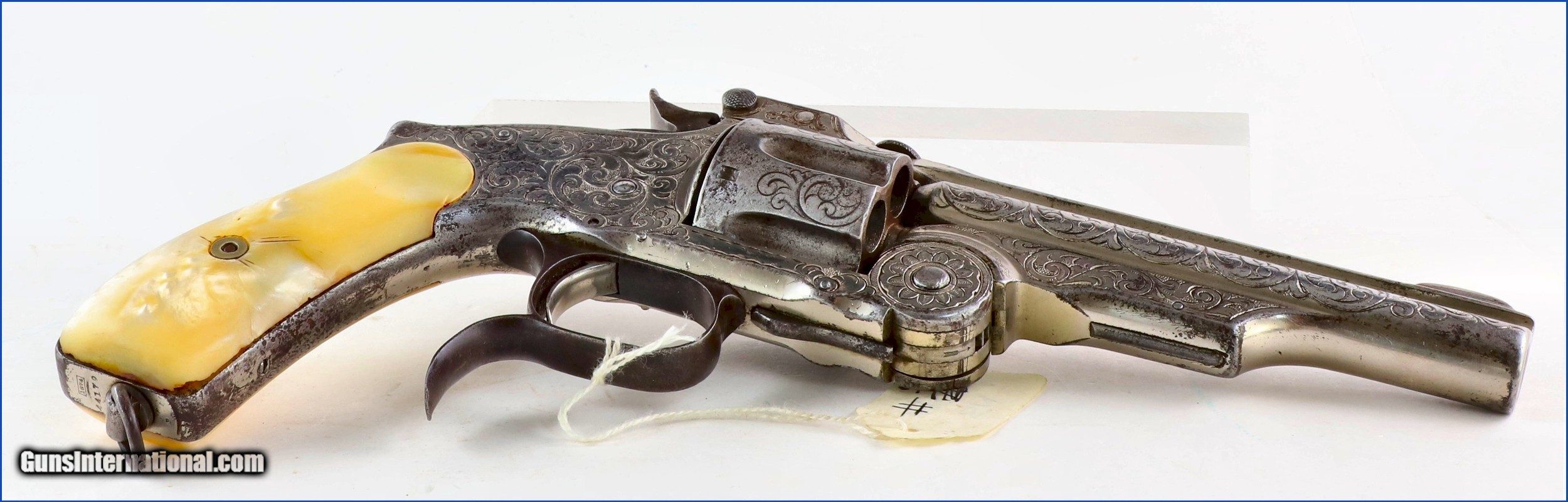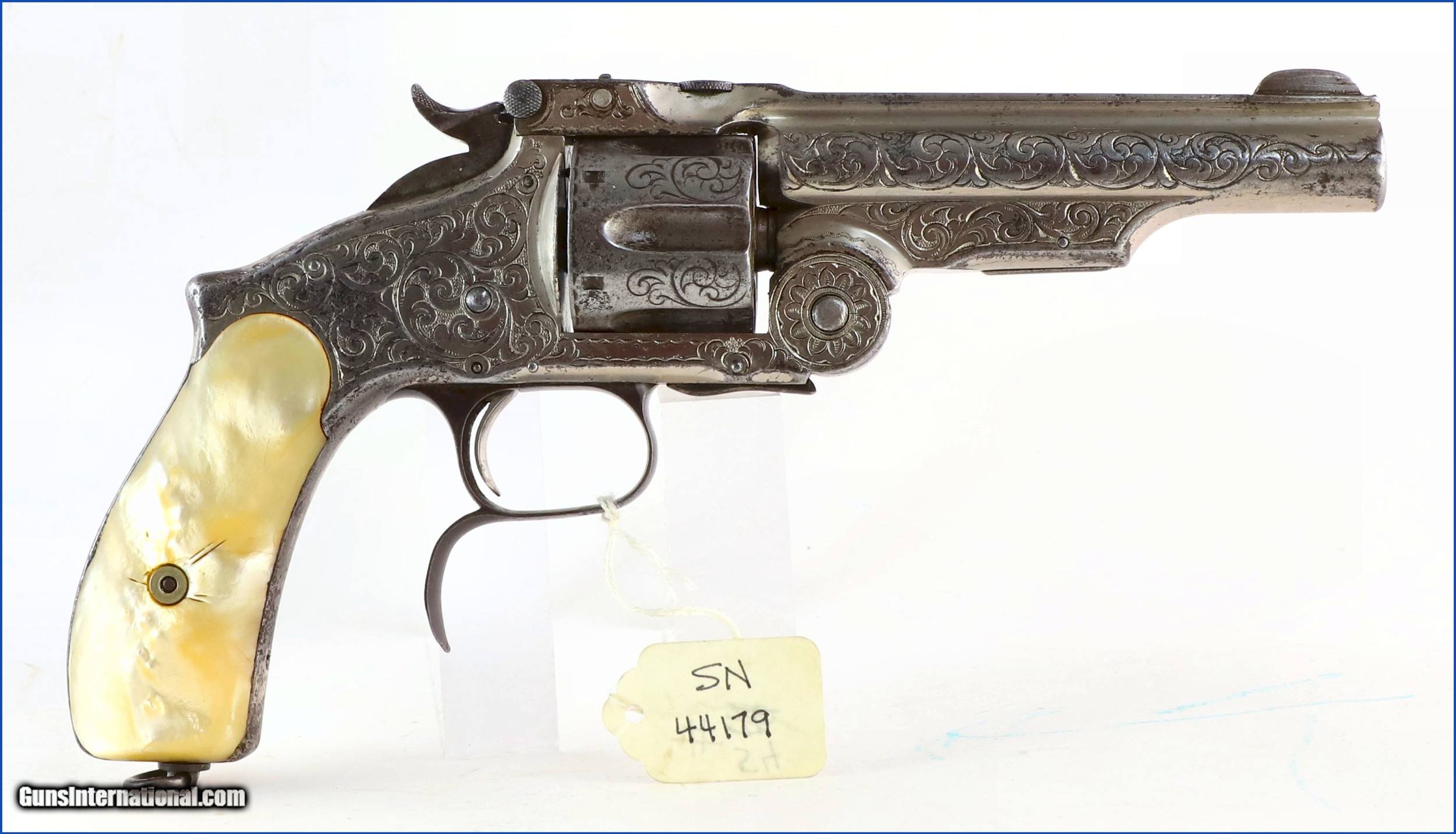 Description: A SMITH & WESSON ENGRAVED THIRD MODEL RUSSIAN, IN FINE CONDITION BEAUTIFULLY PERIOD ENGRAVED in the fancy scroll, New York style... the barrel and frame retaining about 60% Old Nickel. The Engraving and Markings remain Crisp, the barrel was reduced to 4.8 inches during it's period of use and the bore has distinct rifling, the revolver is excellent mechanically. The lovely Old Pearl grips show deep color from age, with some tiny losses at the edges. Included is the Smith & Wesson Historic Factory letter stating, serial # 44179 shipped to Schyler, Hartley & Graham in 1876, also noting "this revolver is not factory engraved but is in what is termed New York City style" engraving. I purchased this revolver and many other wonderful "One of a Kind" frontier single-action revolvers, from an "Old Town Station" catalog about 20 years ago. A Great Looking Old West Revolver. SOLD Antique: Yes |