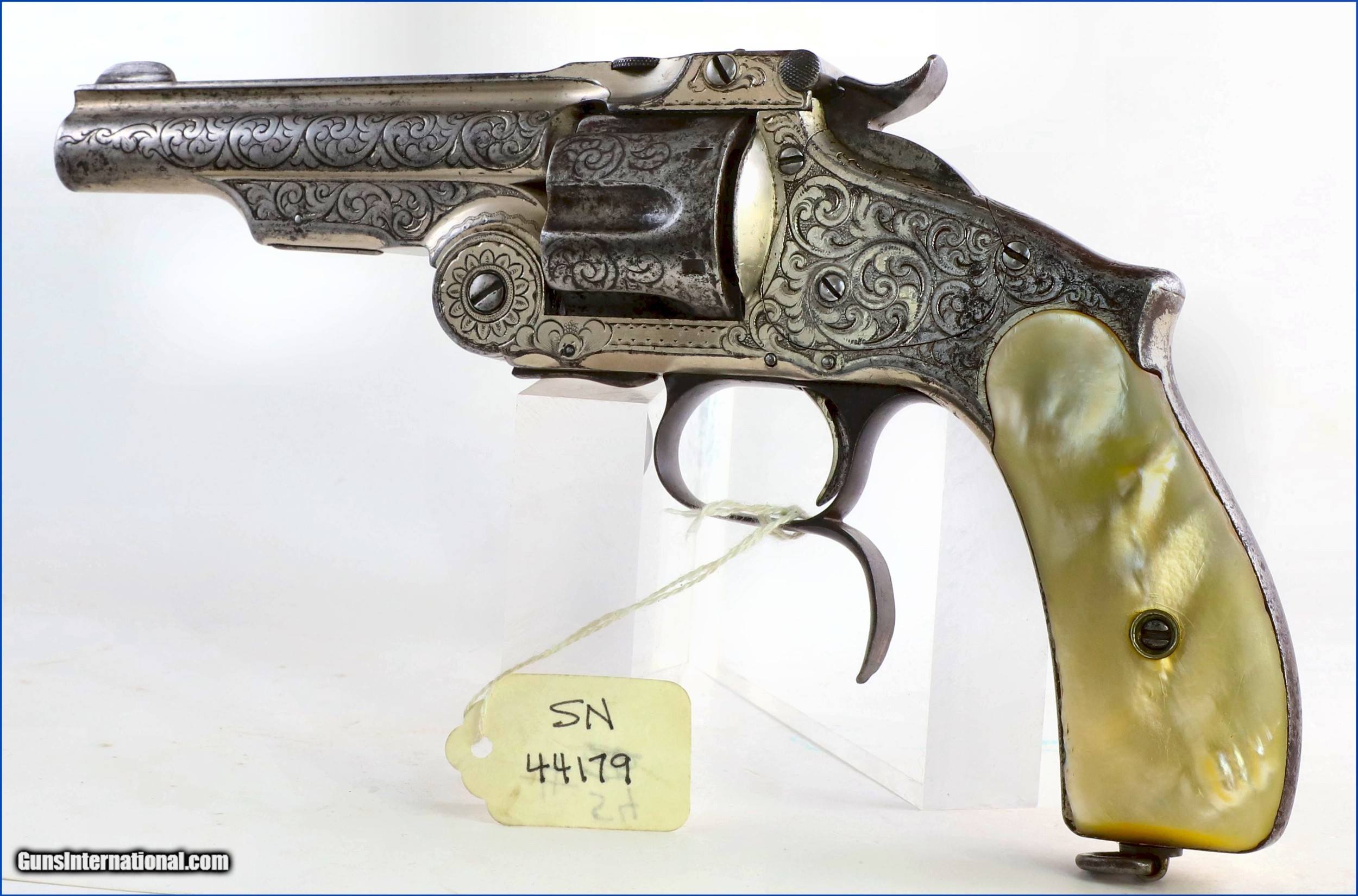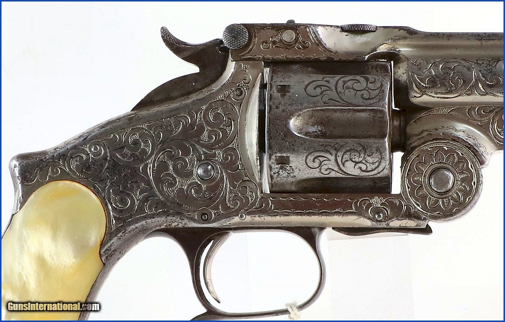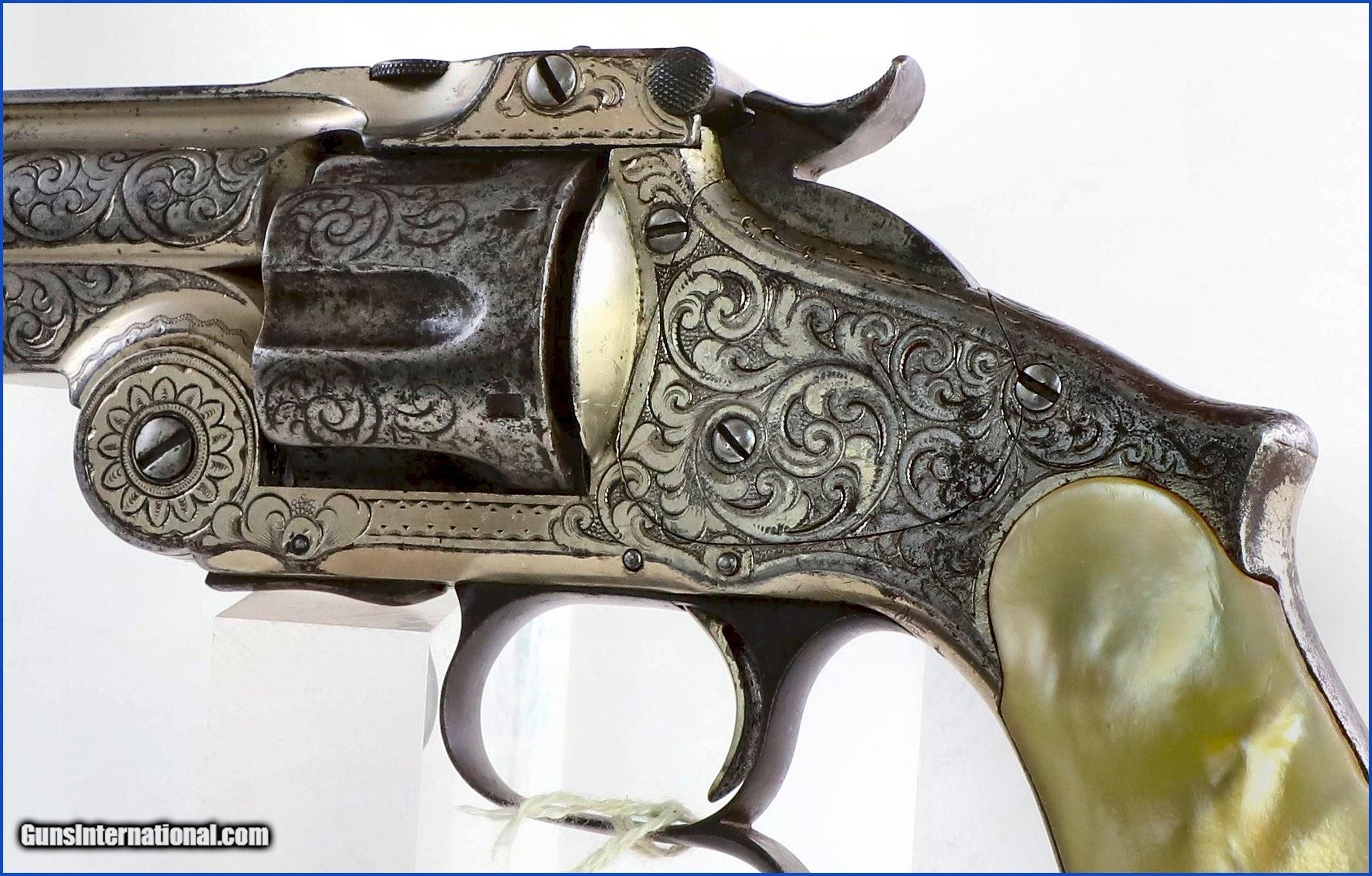 Description: A SMITH & WESSON ENGRAVED THIRD MODEL RUSSIAN, IN FINE CONDITION BEAUTIFULLY PERIOD ENGRAVED in the fancy scroll, New York style... the barrel and frame retaining about 60% Old Nickel. The Engraving and Markings remain Crisp, the barrel was reduced to 4.8 inches during it's period of use and the bore has distinct rifling, the revolver is excellent mechanically. The lovely Old Pearl grips show deep color from age, with some tiny losses at the edges. Included is the Smith & Wesson Historic Factory letter stating, serial # 44179 shipped to Schyler, Hartley & Graham in 1876, also noting "this revolver is not factory engraved but is in what is termed New York City style" engraving. I purchased this revolver and many other wonderful "One of a Kind" frontier single-action revolvers, from an "Old Town Station" catalog about 20 years ago. A Great Looking Old West Revolver. SOLD Antique: Yes |