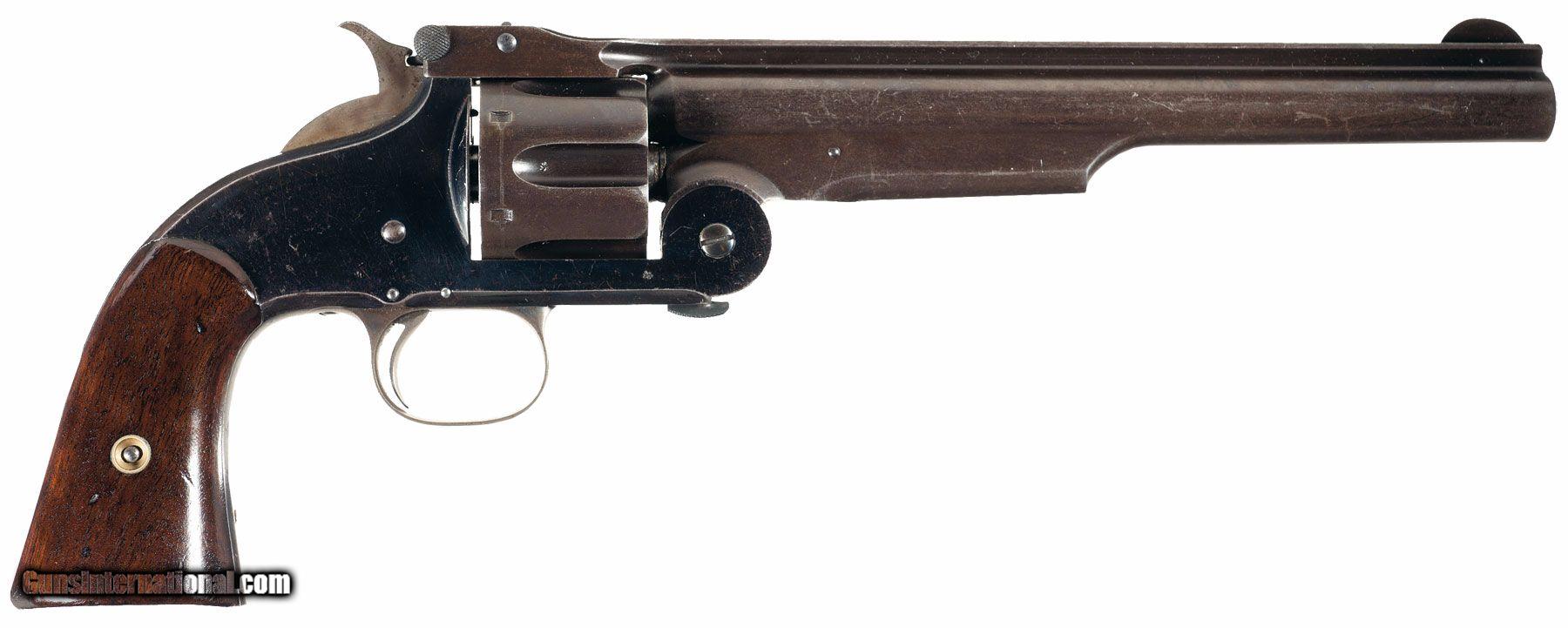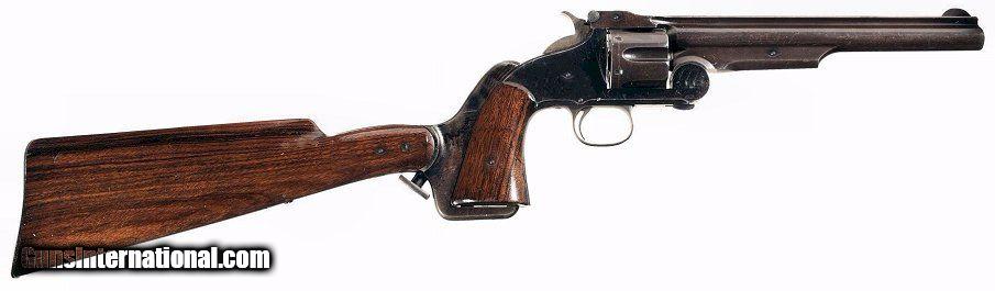 Description: This is one of approximately 604 No. 3 Second Model American revolvers manufactured for a shoulder stock. The included Factory Letter confirms the barrel length and smooth walnut grips. The revolver was shipped to M.W. Robinson of New York City, Smith & Wesson's largest distributor, on September 6, 1873. The revolver was part of 10 unit shipment which had 30 extension stocks. A British proof is stamped on each cylinder flute with an additional proof on the lower right side of the frame d on the underside of the barrel. The assembly number "900" is stamped on the front cylinder face, barrel and barrel latch. The matching serial number is stamped on the butt and right grip panel. The butt serial number is only partially visible due to cuts for the stock. The frame exhibits 75% strong original blue finish. The hammer and trigger guard retain traces of original case colors. The grips are very fine with some minor handling marks. The stock is fine with a number of minor handling marks on the wood with the iron components retaining 40% original blue finish. $13,500. SOLD Antique: Yes |