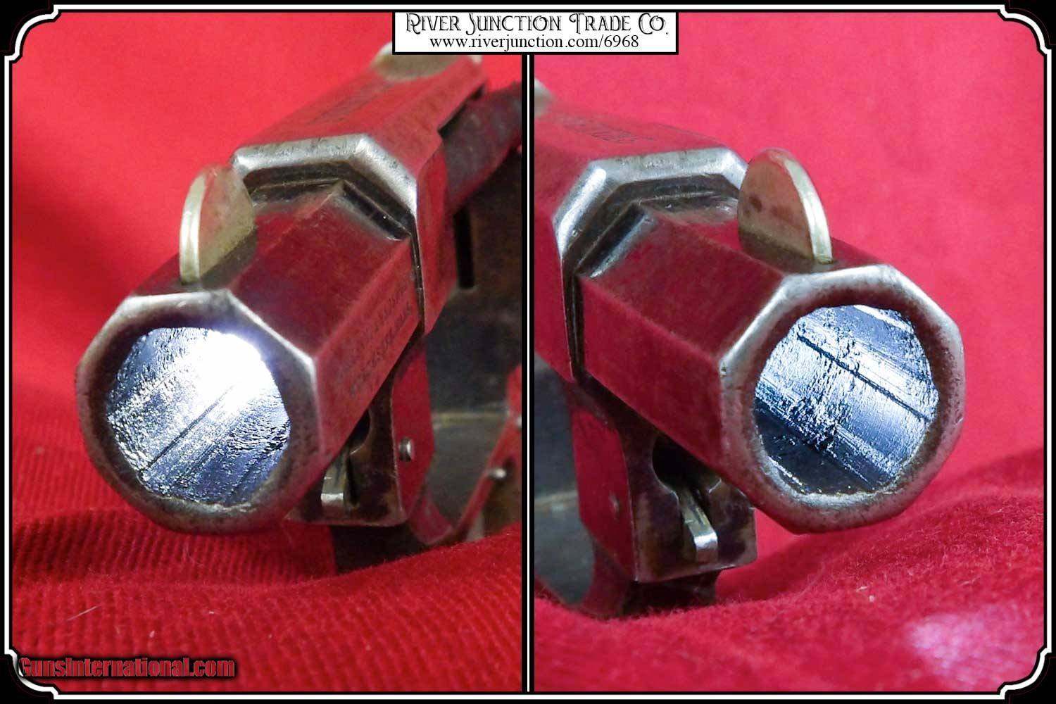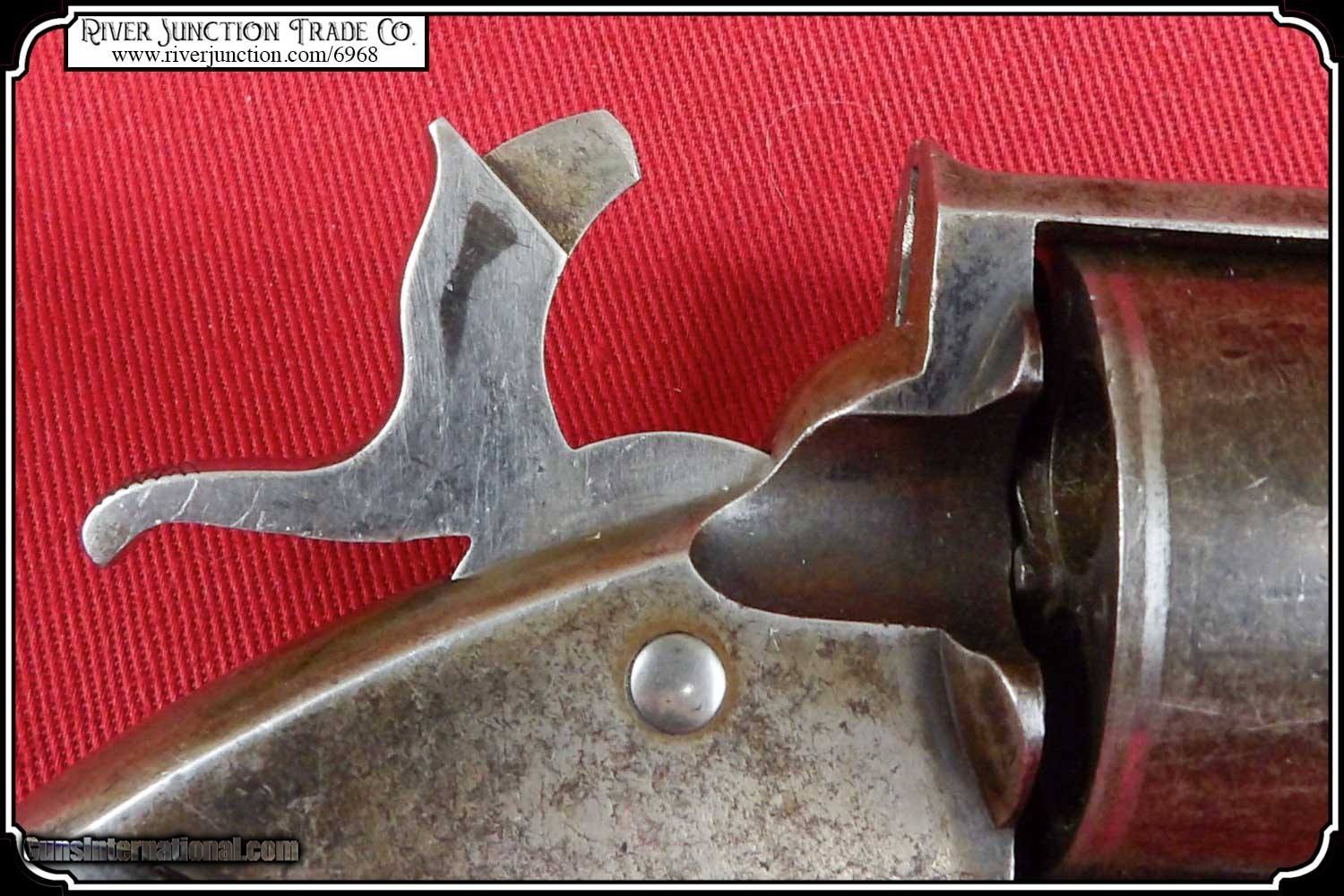 Description: The most exciting of all the early 19th Century Pocket pistols were the .41's. The vast majority of production were the .22's, .32's, and some .38's, the smallest quantity being the .41's. Generally barrel lengths were 2-1/2 to 3 inches, so a 1-7/8 inch FACTORY barrel length is rare , and for the collector, very desirable. (DIXIE GUN WORKS does have reload able brass that can be primed with .22 blanks. Of the 19th century Pocket Pistols, none had a more colorful name than the SWAMP ANGEL from Forehand & Wadsworth. This example, Serial No.9207 exudes character. It has about 10% original blue, no rust and a smooth finish. It has varnished Rosewood grips. The mechanical features operate properly for loading, cocking, and firing. ALL factory applied marking are clear and strong, to include the scarce side barrel manufacturers address, and the Model Designation of Swamp Angel on top of the frame. A powerful Pocket Pistol, in a scarce barrel length. This is an ANTIQUE and can be shipped directly to you. Adult signature required. Sold as an Antique ~ no guarantees, warranties, or liabilities for any actual usage. If any firearms are to be used for shooting purposes, a qualified gunsmith should inspect them first. SOLD |