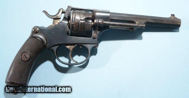 Description: SWISS WAFFENFABRIK BERN MODEL 1878 ORDNANCE REVOLVER. 10.4MM Swiss caliber six shot double action revolver with octagon barrel. Distinctive checkered panels on front of cylinder. Gutta-percha checkered grips with Swiss “Cross” Ordnance logo. Very good to fine with much original blue mixed with patina. Minor spots of storage corrosion on front of barrel and cylinder. Excellent grips with Excellent bore and chambers and perfect working order. Scarce revolver at a reasonable price. SOLD Antique: Yes |