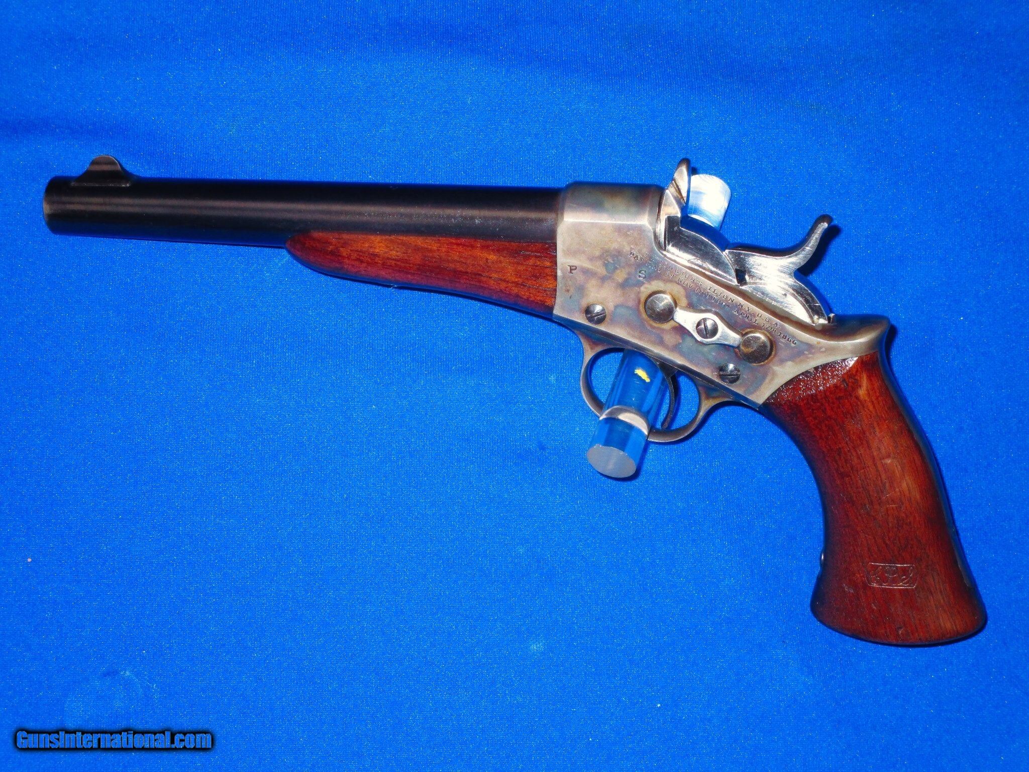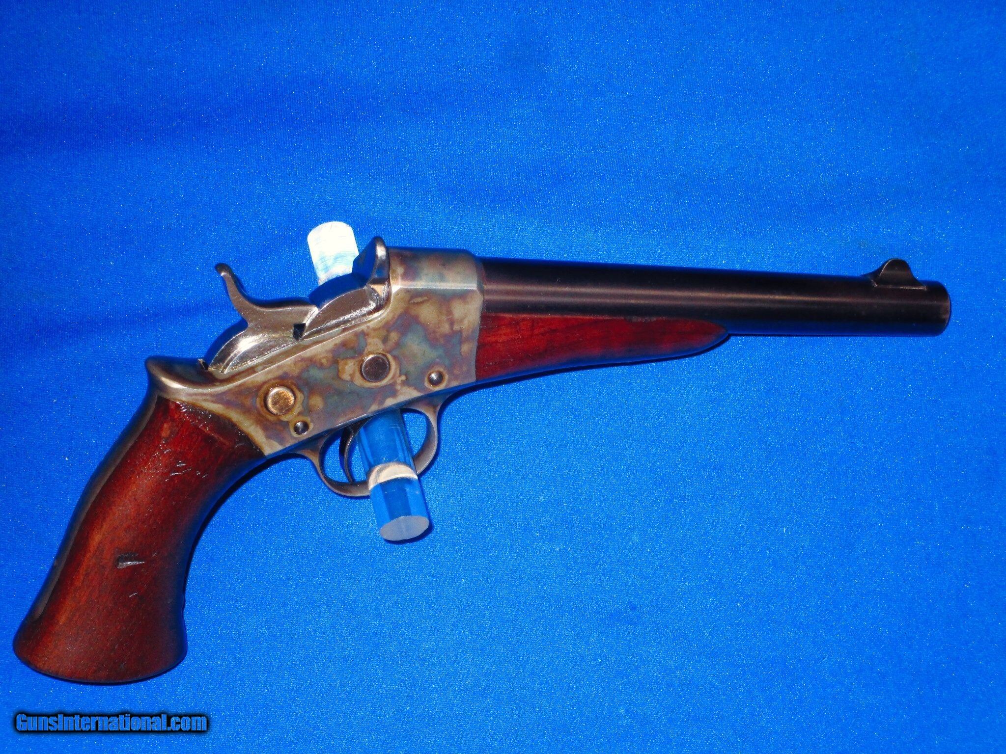 Description: U.S. Military Issued Remington Model 1871 Army Rolling block Pistol In Excellent Plus To Mint Condition. All original and complete. Only 6,000 made from 1872-1888. The pistol has mint metal and markings throughout. It is fully U.S. Sub Inspected. The barrel on the gun retains all of its original bright factory blue. The frame, backstrap & trigger guard retain all of their original bright factory case colors. The breech block and hammer retain all of their original bright factory bright polish. All screws are excellent. The wood on the gun is excellent plus throughout with a very clear U.S. Military Inspectors cartouche on the left side of the grip. The pistol has a mint bright bore and tight as new action. This Is A Very High Condition Example Of A U.S. Military Issued Remington Model 1871 Army Rolling Block Pistol. This U.S. Remington Army Pistol Would be Hard To Better For Condition And Would Be A Wonderful Addition To Any Fine Collection! SOLD Manufacturer: Remington Model: Model 1871 Rolling Block Condition: Excellent Metal Condition: Excellent Wood Condition: Excellent Bore Condition: Excellent |