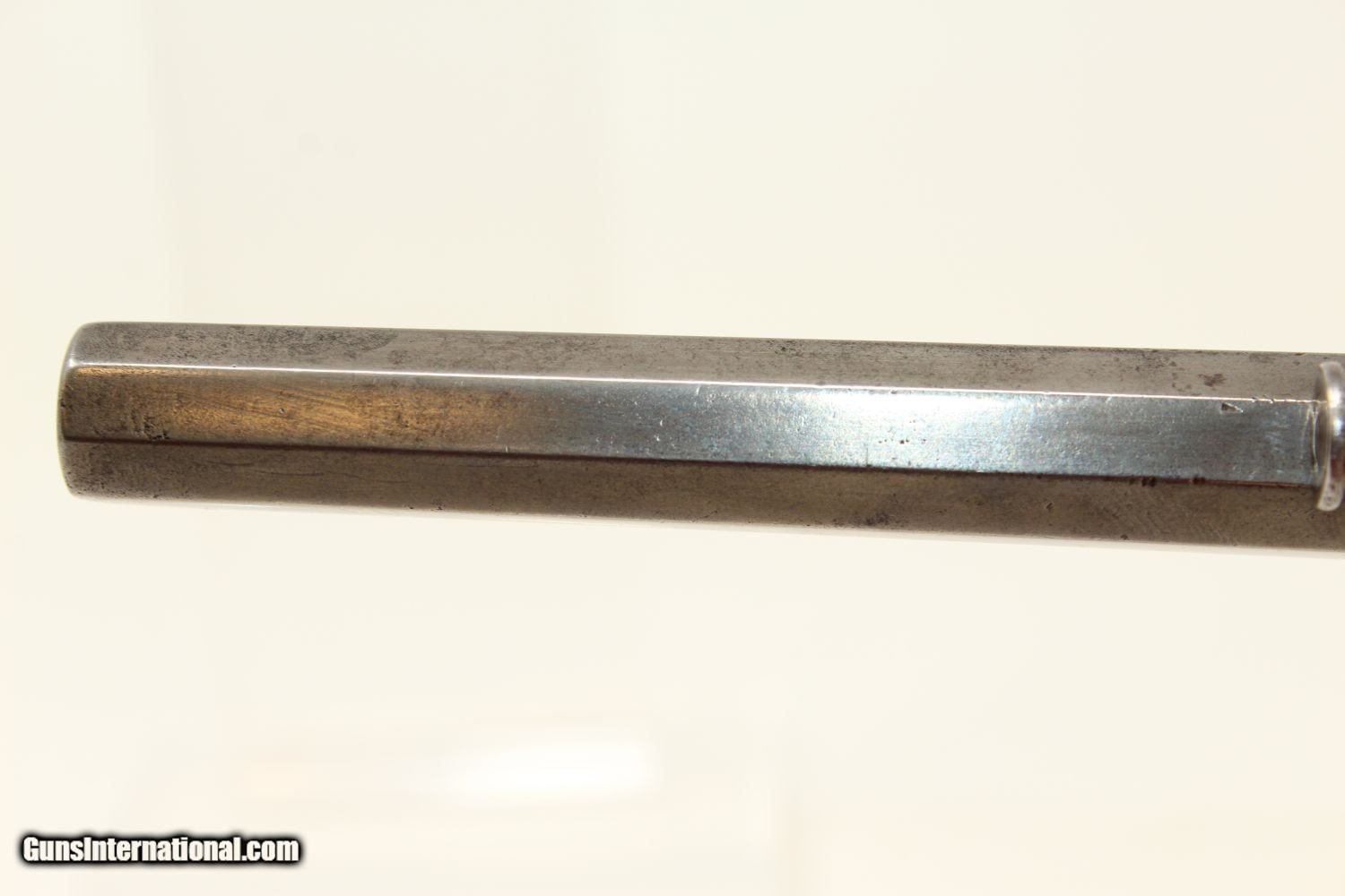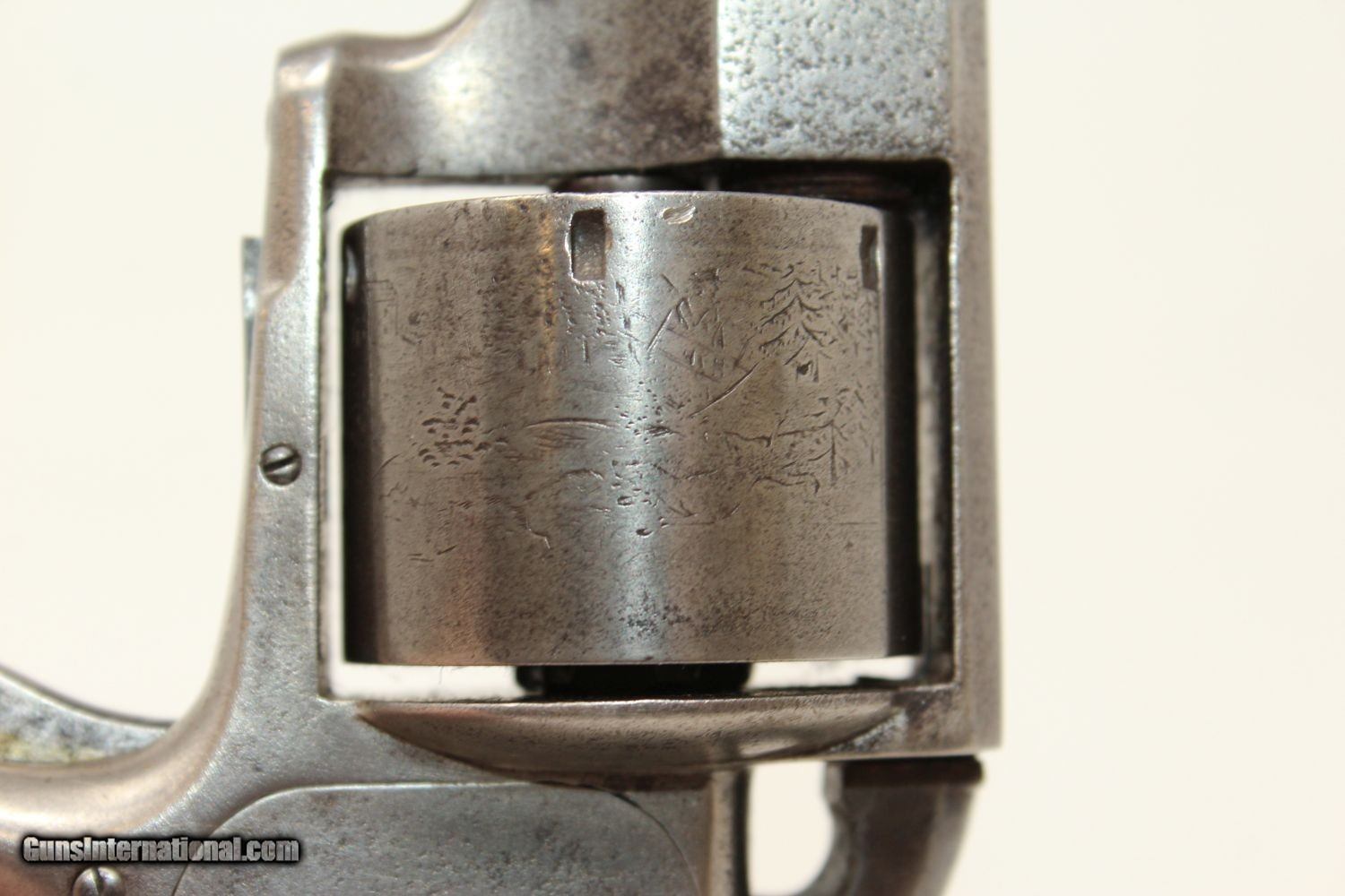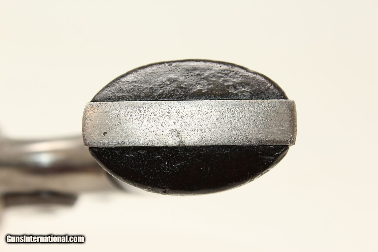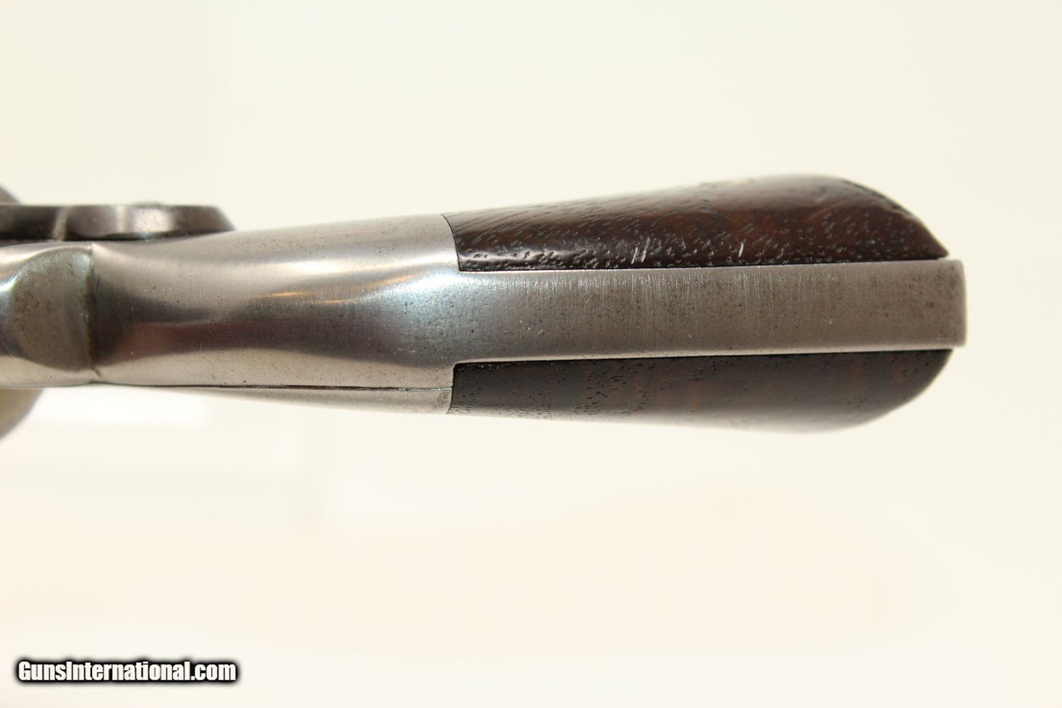 Description: VERY SCARCE Allen & Wheelock SIDEHAMMER Revolver FIRST ISSUE 5-Panel Cylinder Scene and Walnut Grips! Here we present an antique Allen & Wheelock Sidehammer First Issue Revolver, made circa 1858 in Worcester, Massachusetts. This revolver would have competed well against Smith & Wesson and their Model No. 2 “Old Army” Revolver, also in .32. It might have even been preferable over the S&W with its sturdy solid frame, all while violating the S&W held Rollin White patent. There were 8 different variants of this revolver made between 1858 and 1865, and only 1,500 are thought to have been made total, making this a very scarce revolver. The most immediately eye-catching feature on this revolver is the side-mounted hammer on the right side of the gun. The features that make this distinctly a first issue are the rear cylinder axis pin and the lack of the later 1860 patent date. The cylinder scene bears a pastoral scene with birds, rabbits, deer, and dogs. The left side of the barrel is marked “ALLEN & WHEELOCK. WORCESTER. MASS./ALLEN’S PAT’S. SEPT. 7. NOV. 9. 1858.” The overall condition is Very Good. The action is as strong as ever. The bore is in good condition, dim with good rifling. The cylinder scene remains visible, depicting some wildlife and hunting dogs. The serial number on the barrel, cylinder, and cylinder arbor pin all match. A handsome revolver that would be a great addition to any collection! Own the original! This is a legitimate antique and not a reproduction. Barrel is 5 inches. Caliber: .32 Rimfire Overall condition as seen in photos. Very Fast. Very Safe. FREE SHIPPING WORLDWIDE. Delivered directly to your door by express mail! Guaranteed AUTHENTIC & Includes CERTIFICATE OF AUTHENTICITY. ancestryguns $1000 #190586 SOLD Antique: Yes |
