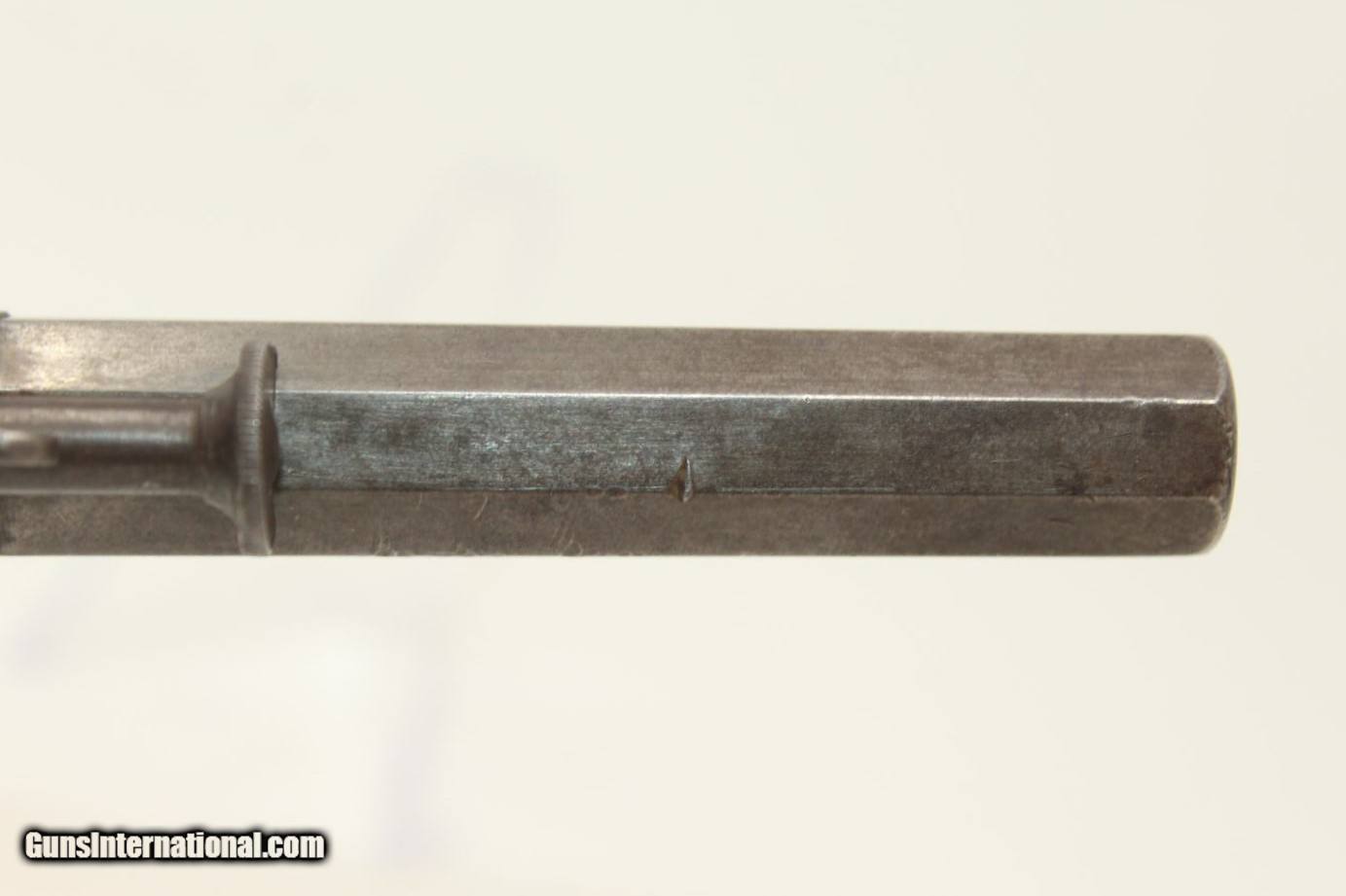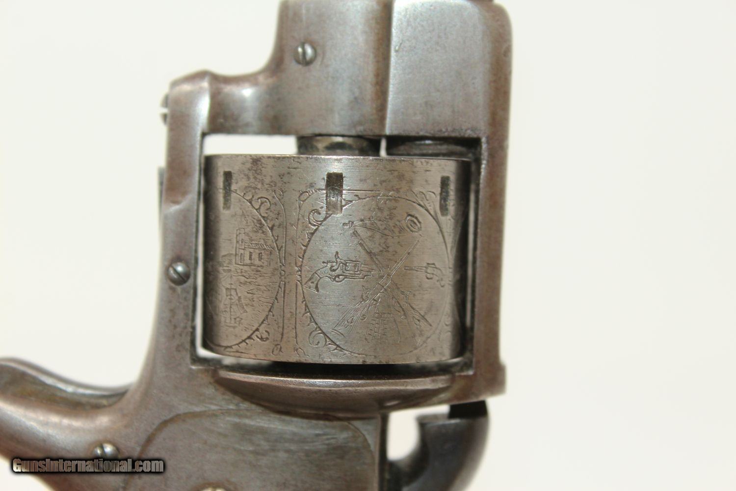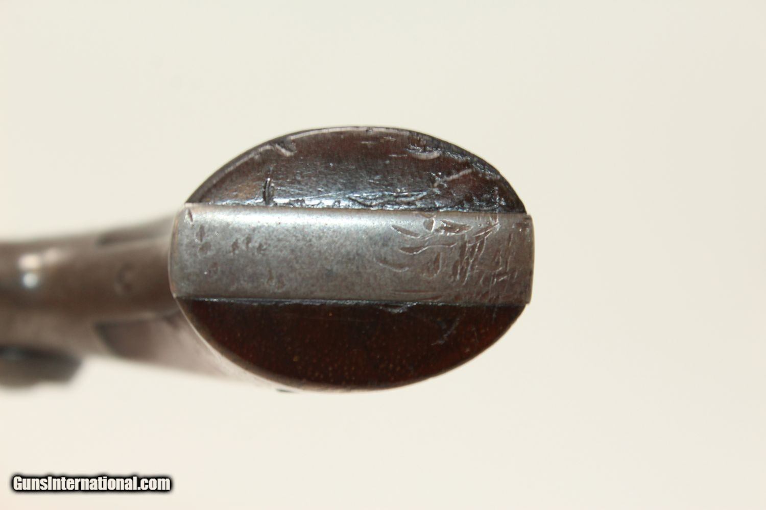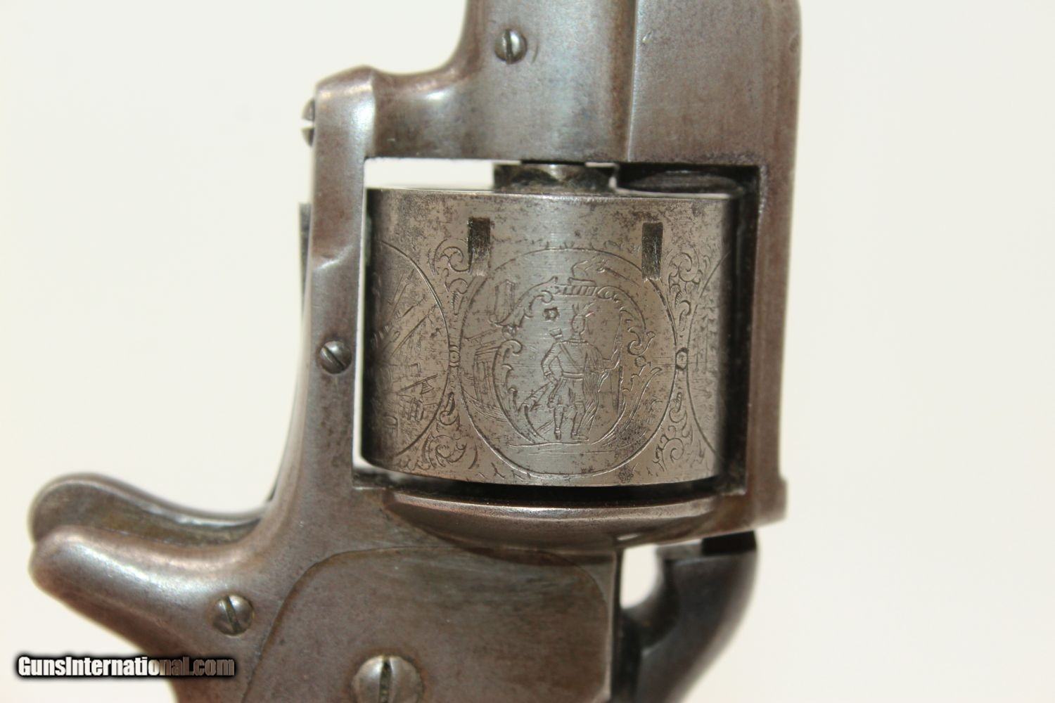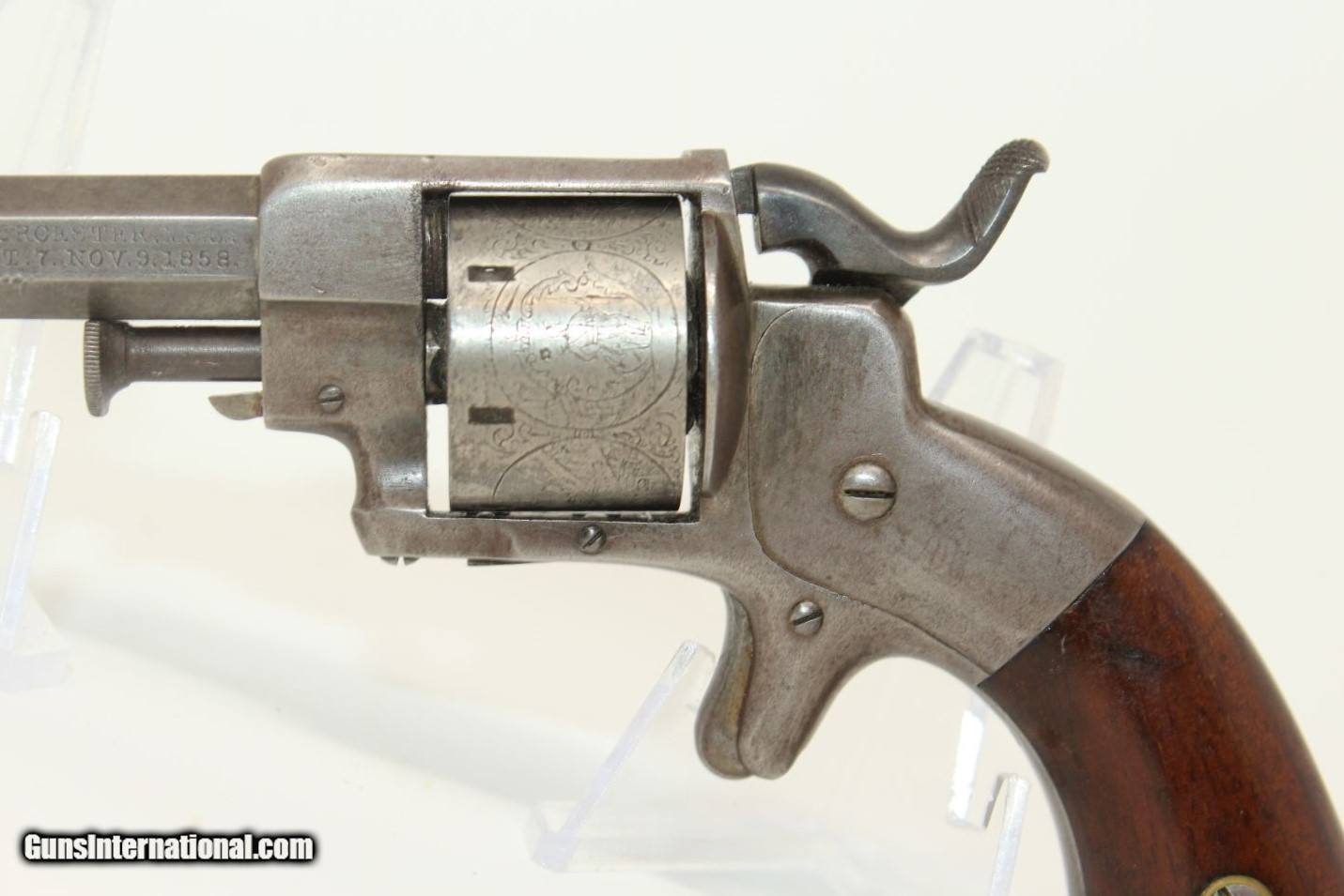 Description: VERY SCARCE Allen & Wheelock SIDEHAMMER Revolver FIRST ISSUE 5-Panel Cylinder Scene & Walnut Grips! Here we present an antique Allen & Wheelock Sidehammer First Issue Revolver, made circa 1858 in Worcester, Massachusetts. There we 8 different variants of this revolver and only 1,500 are thought to have been made total, making this a very scarce little revolver. The most immediately eye-catching feature on this revolver is the side-mounted hammer on the right side of the gun. The next is the 5-panel cylinder scene featuring a version of the Massachusetts State seal with a Native American and a star, a collection of cannon and other small arms, a horseman charging with a spear raised overhead, crossed rifles and handguns, and ship with a fort in the background. The features that make this distinctly a first issue are the rear cylinder axis pin and the lack of the later 1860 patent date. The left side of the barrel is marked “ALLEN & WHEELOCK. WORCESTER. MASS./ALLEN’S PAT’S. SEPT. 7. NOV. 9. 1858.” The overall condition is very good. The iron parts have an even gray patina. The markings are clear. The cylinder scene is complete and clear. The grips are in nice shape with most of the original lacquer. The bore is in good shape. The action is excellent. Here is a dandy little revolver with a very neat cylinder scene! Own the original! This is a legitimate antique and not a reproduction. Barrel is 3 inches. Caliber: .22 Rimfire Overall condition as seen in photos. Very Fast. Very Safe. FREE SHIPPING WORLDWIDE. Delivered directly to your door by express mail! Guaranteed AUTHENTIC & Includes CERTIFICATE OF AUTHENTICITY. ancestryguns $900 #190486 SOLD Antique: Yes |